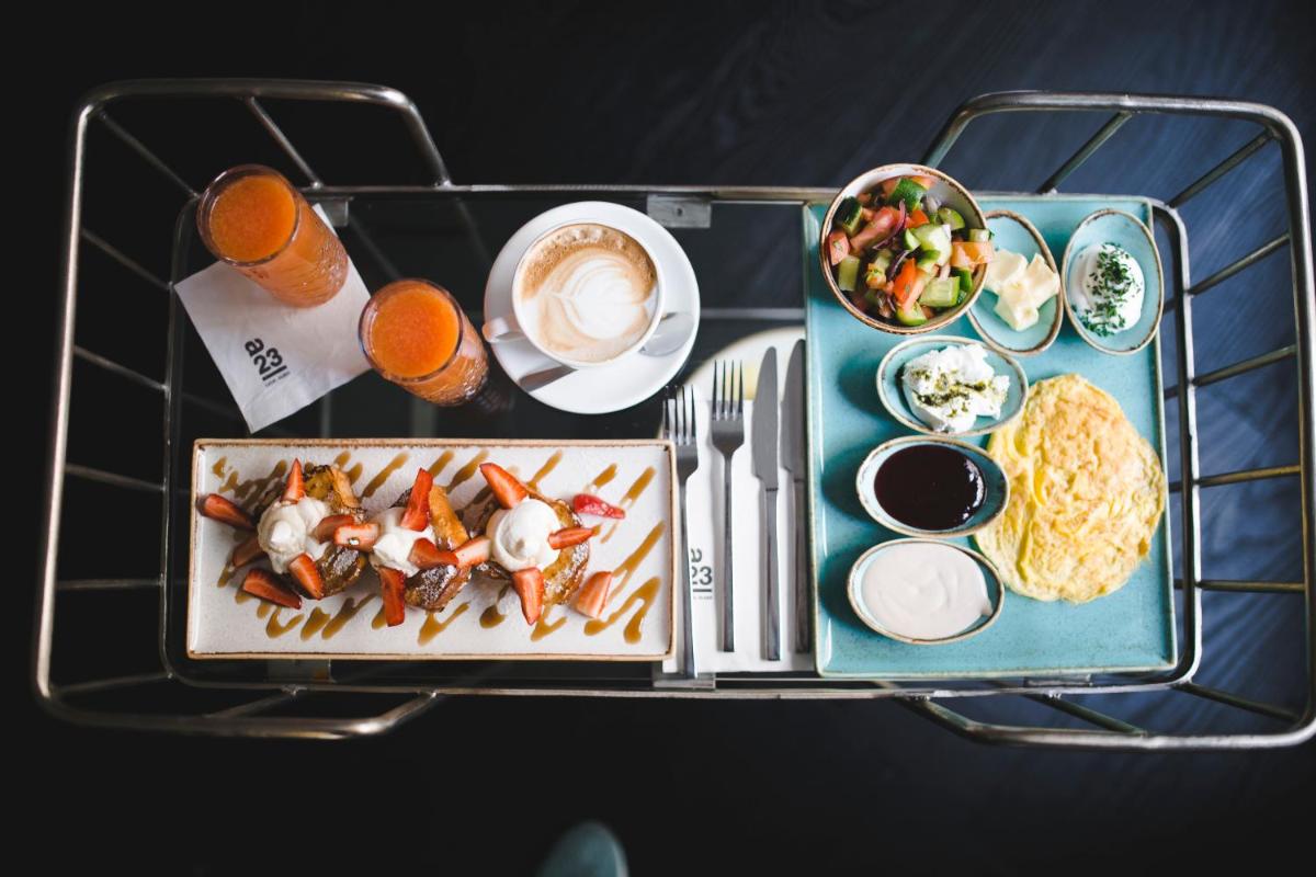 Das Hotel ist bekannt für sein israelisches Frühstück, ein Gourmet-Erlebnis, das in einer eleganten und entspannten Umgebung serviert wird. Es bietet eine große Auswahl an frischen und lokalen Produkten. Der persönliche Service und die ruhige Atmosphäre tragen dazu bei, dass das Aufwachen ein Moment wahrer Freude und ein energiegeladener Start in den Tag ist.