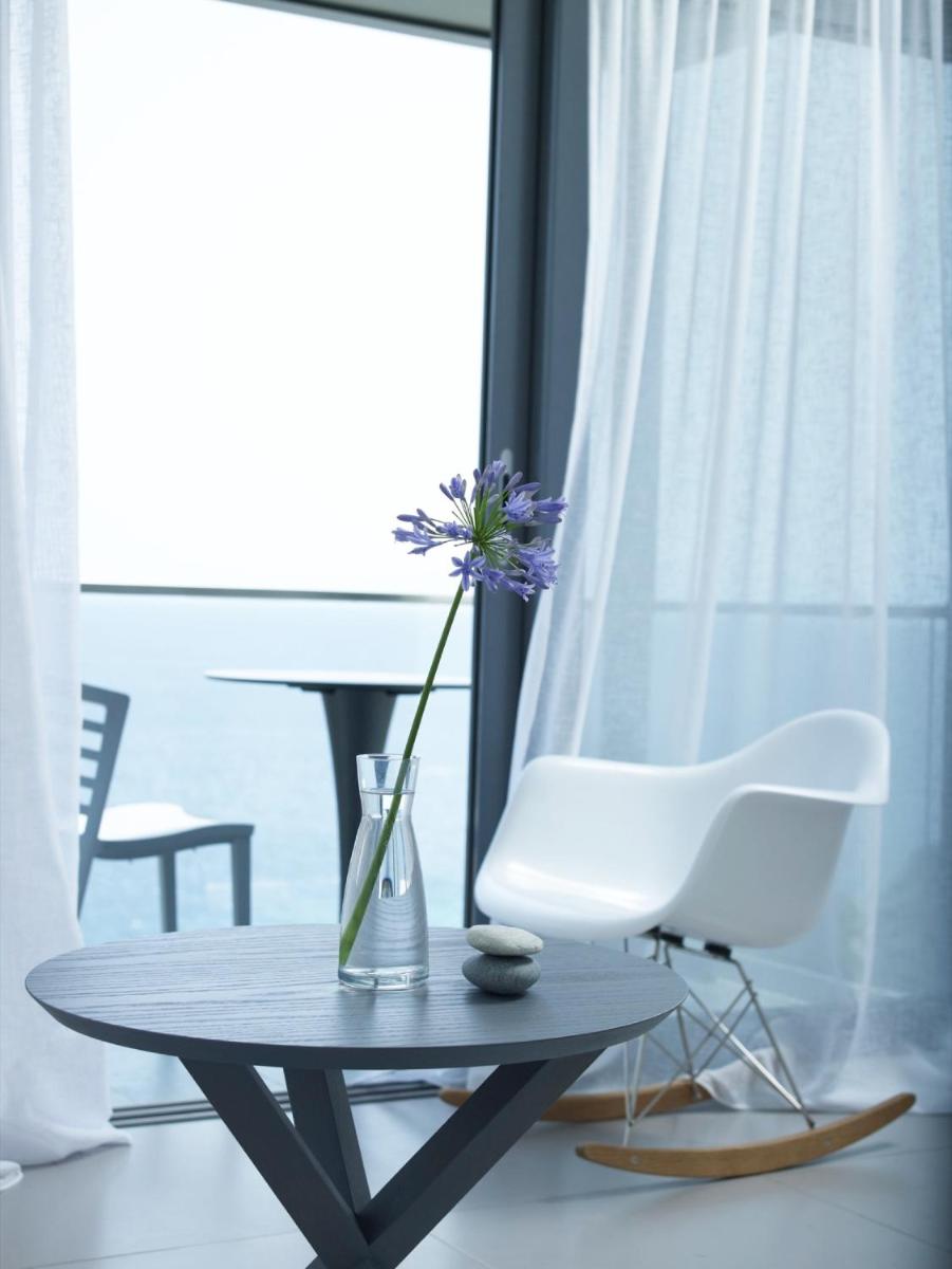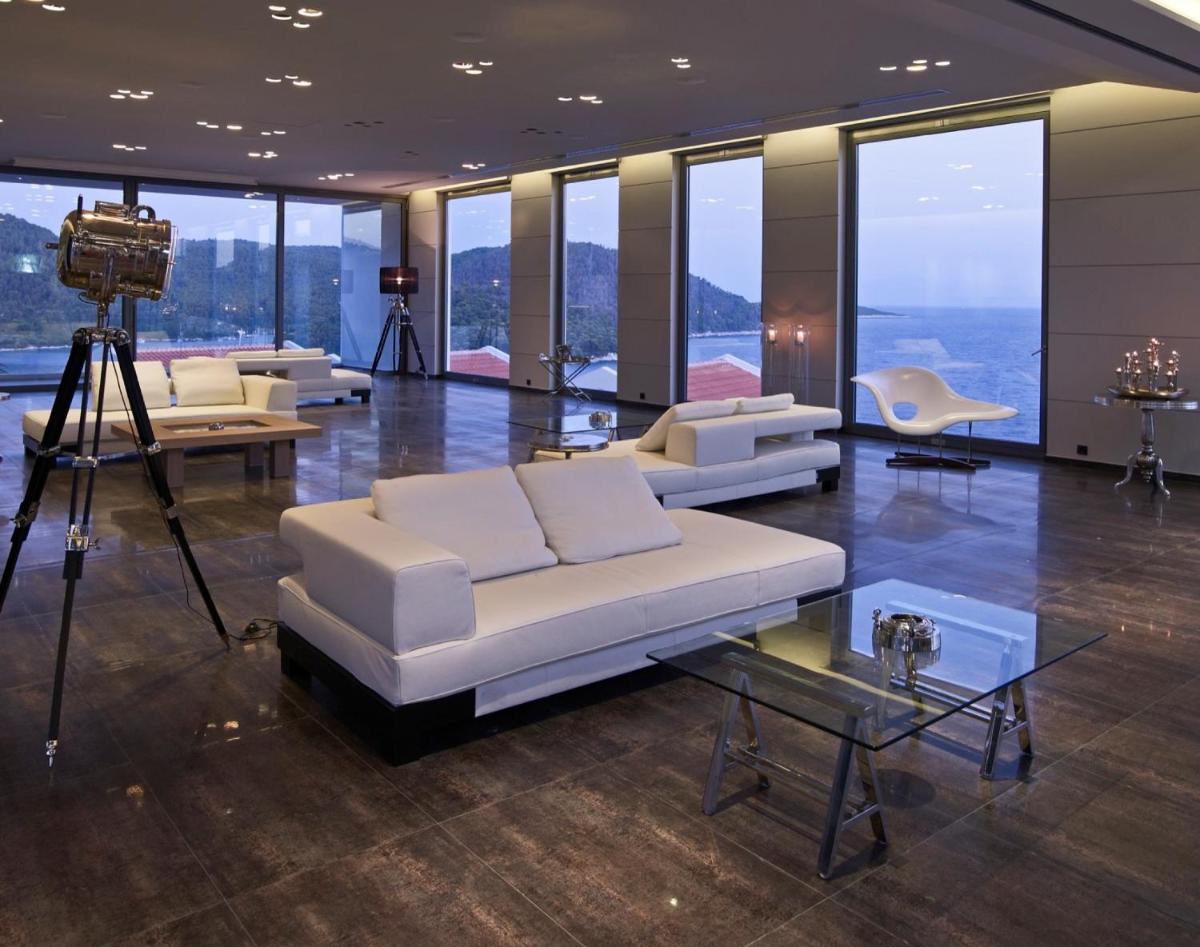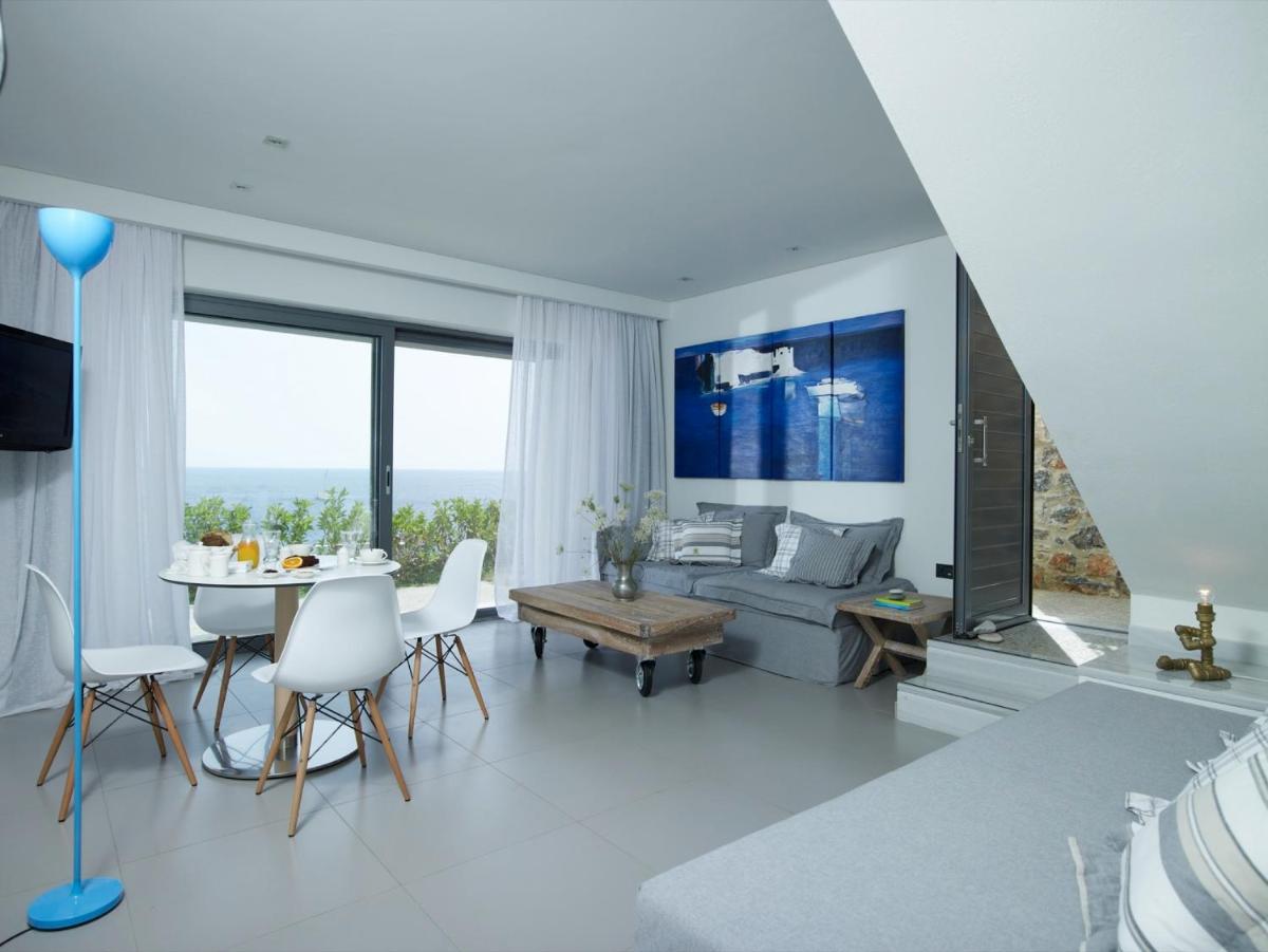 Das Resort ist in Harmonie mit der natürlichen Umgebung gebaut, unter Verwendung von lokalem Stein und Holz. Es erstreckt sich über mehrere Ebenen, die direkt zum Strand führen und einen herrlichen Blick auf die Ägäis und die Insel Dasia bieten.