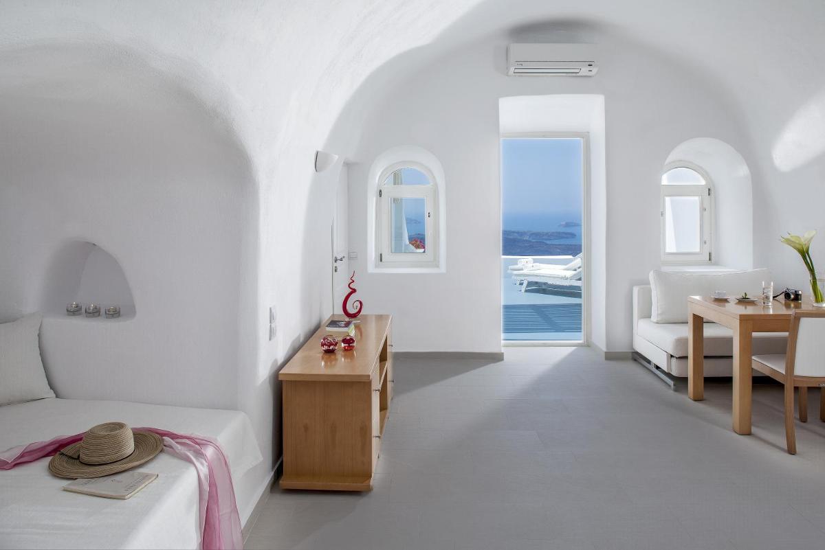 Die Lage in Firostefani ist strategisch und hoch geschätzt; das Hotel ist weit genug vom Trubel der Hauptstadt Fira entfernt, um Ruhe zu gewährleisten, aber dennoch bequem zu Fuß (etwa 10-15 Minuten) über den Klippenpfad erreichbar. Dies ermöglicht es den Gästen, das Beste von Santorin zu genießen: die Ruhe des Luxus und den schnellen Zugang zum Nachtleben und zu Restaurants.