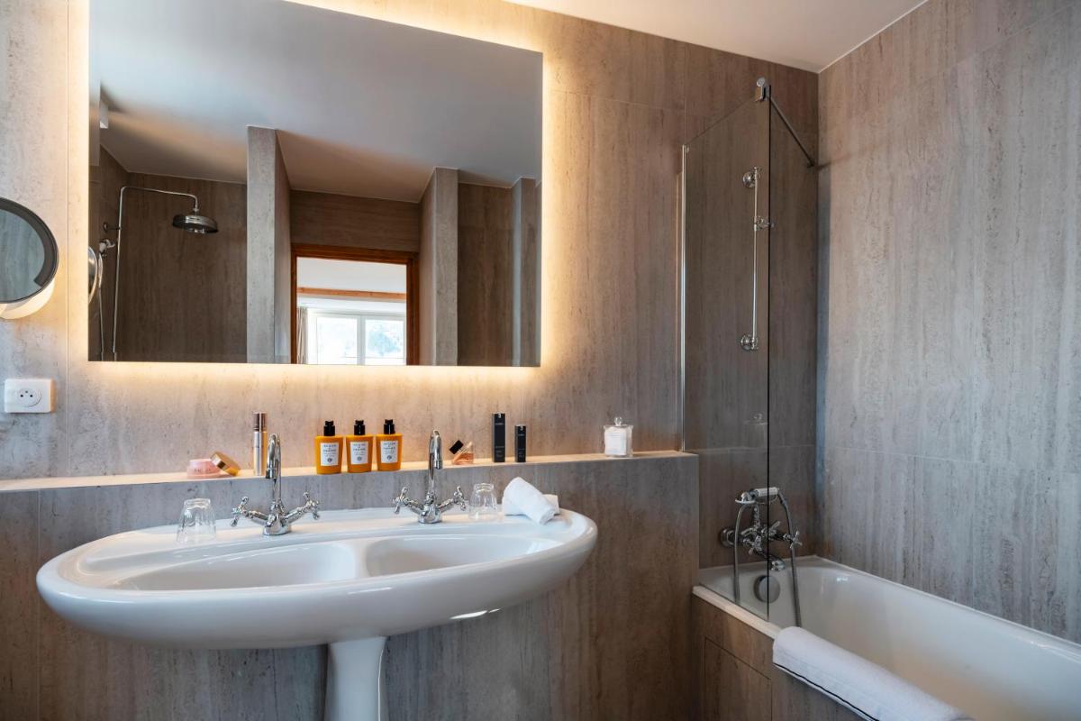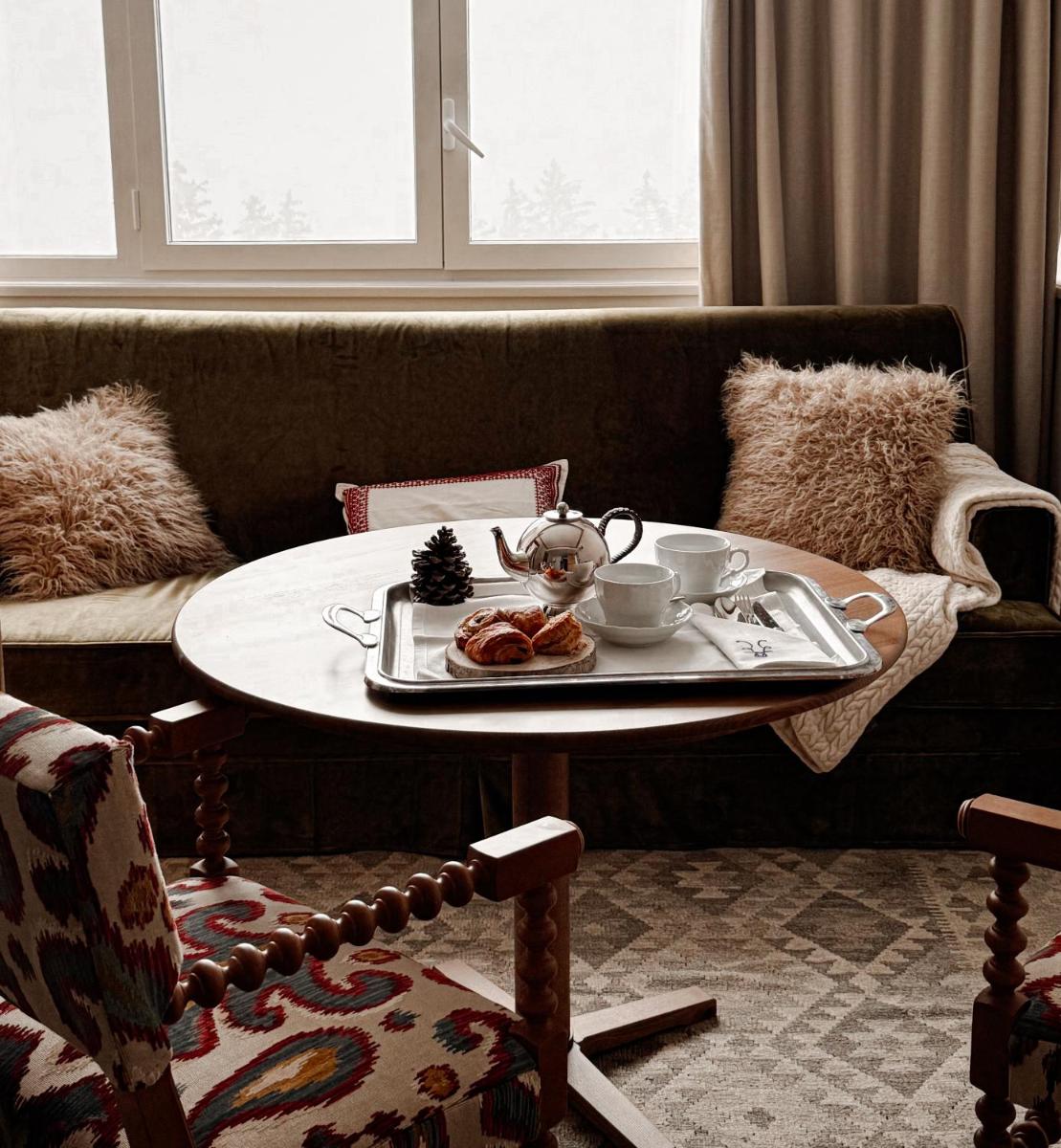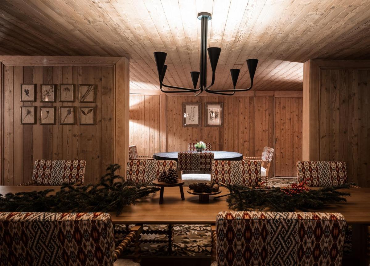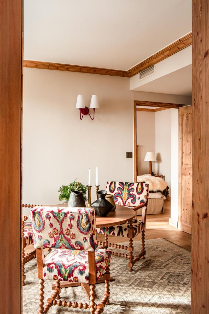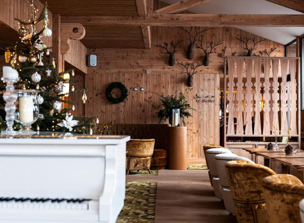 Die Innenräume wurden renoviert, um ein zeitgenössisches Design zu bieten, das die alpine Tradition ehrt, mit reichlicher Verwendung von hellem Holz und luxuriösen Stoffen. Die Zimmer und Suiten sind geräumig und verfügen oft über private Balkone mit Panoramablick auf die Gipfel, was einen Zufluchtsort der Ruhe und des Wohlbefindens gewährleistet.