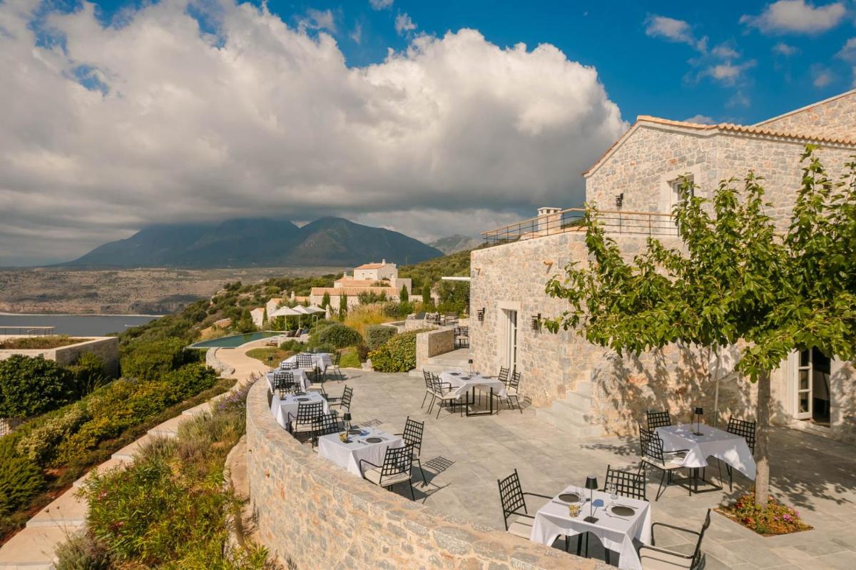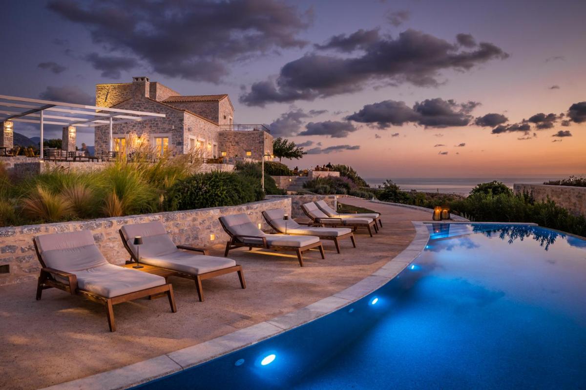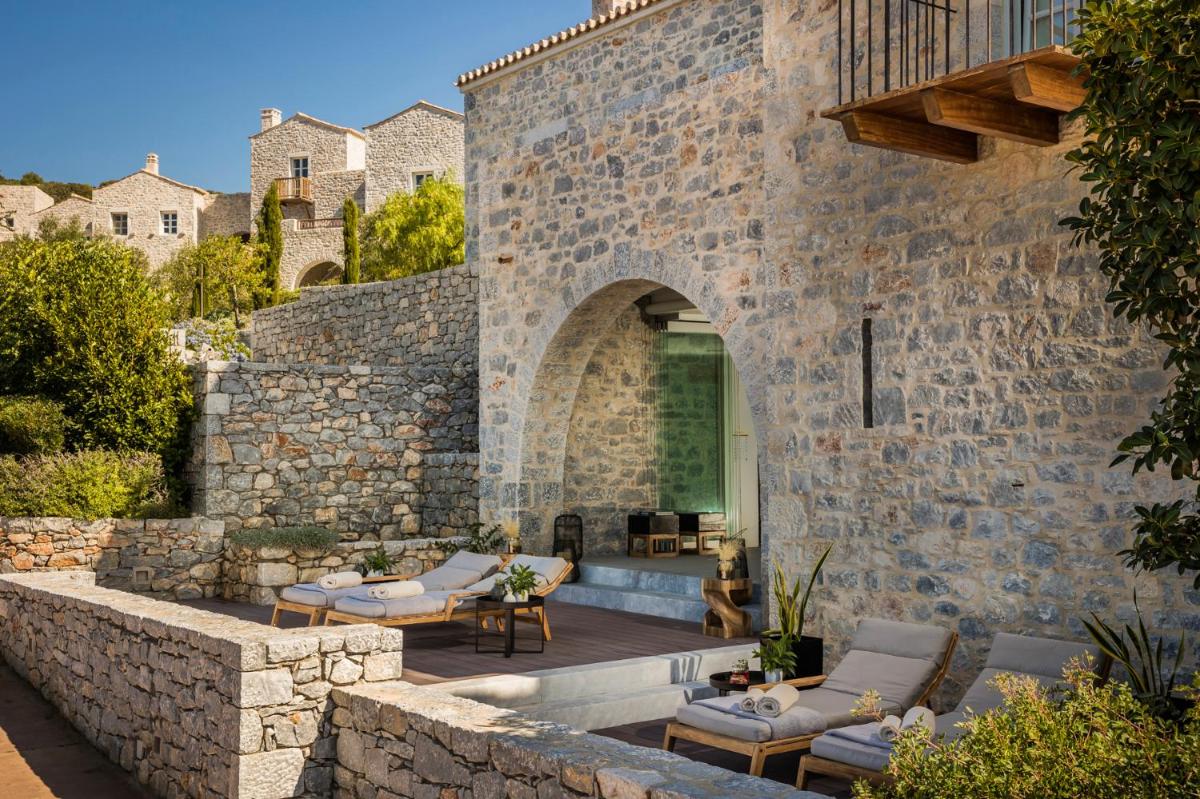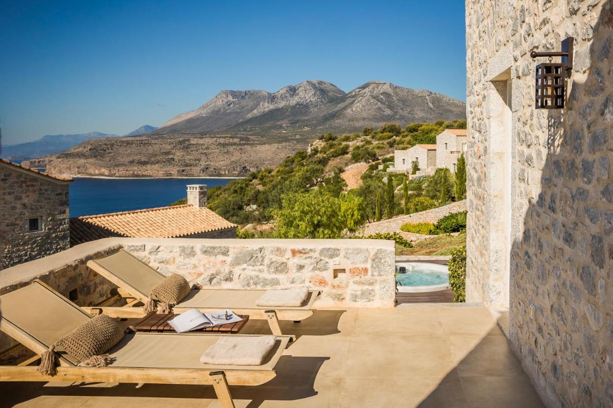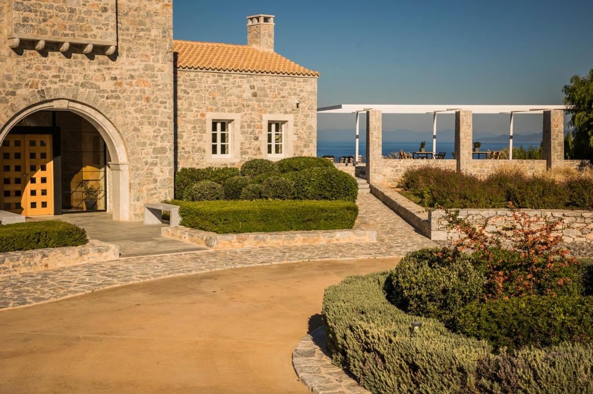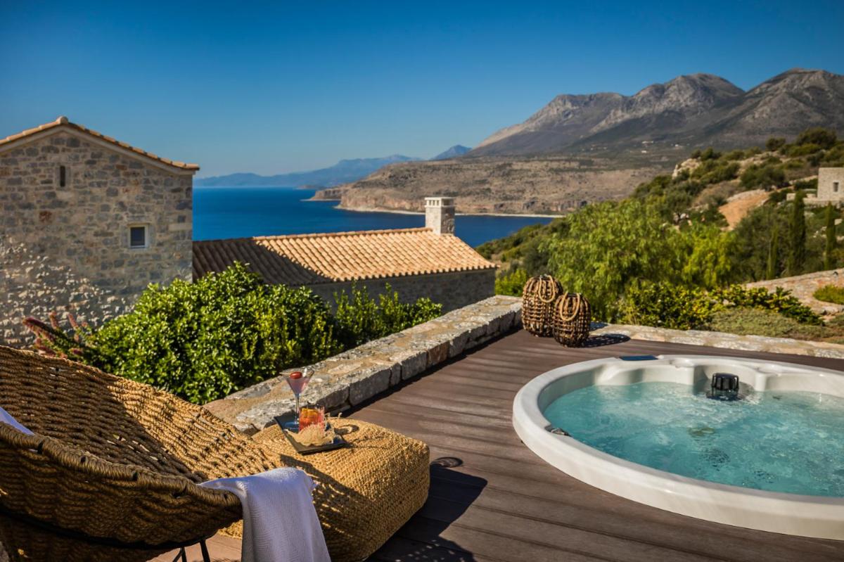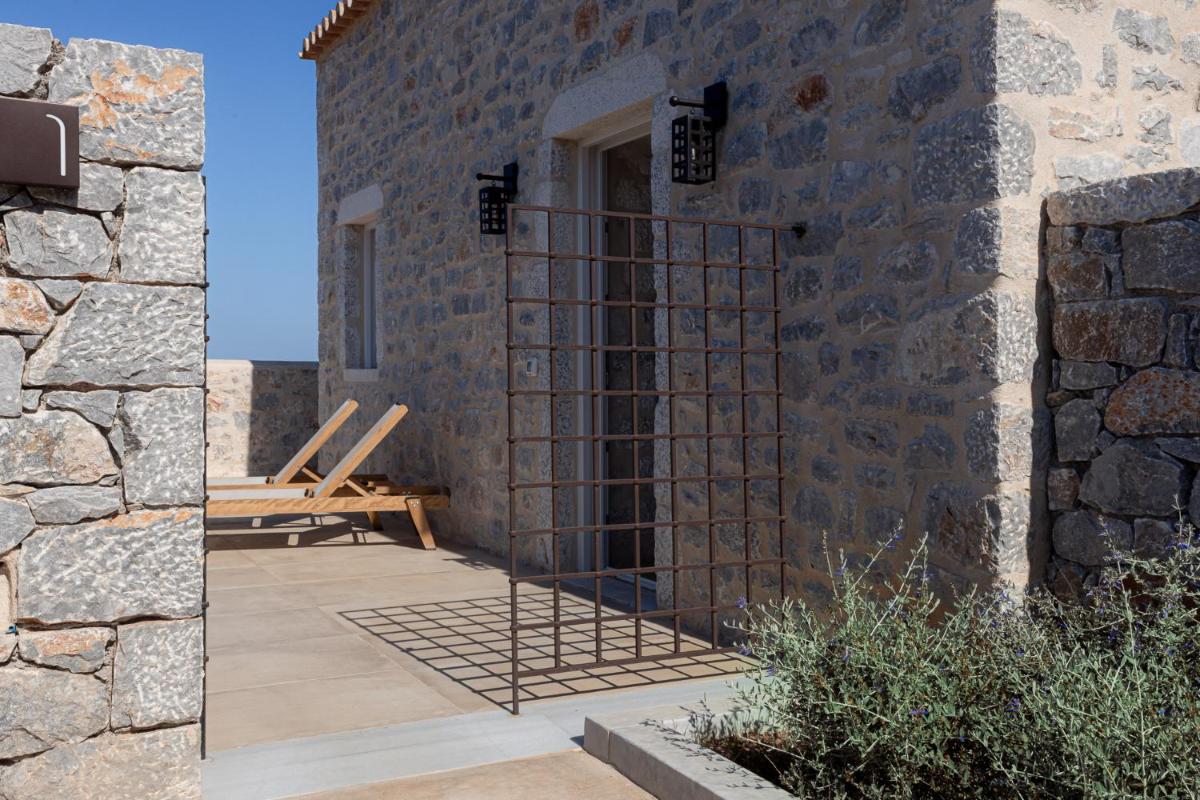 Die Struktur ist vollständig aus lokalem Stein gebaut und respektiert den Stil der Verteidigungstürme von Mani. Die Suiten sind geräumig, mit maßgefertigten Möbeln und luxuriösen Stoffen, und viele verfügen über private Terrassen mit Meerblick.