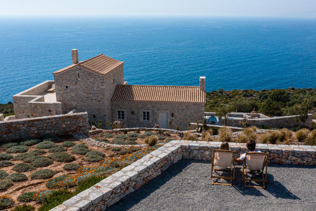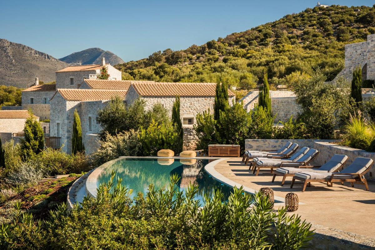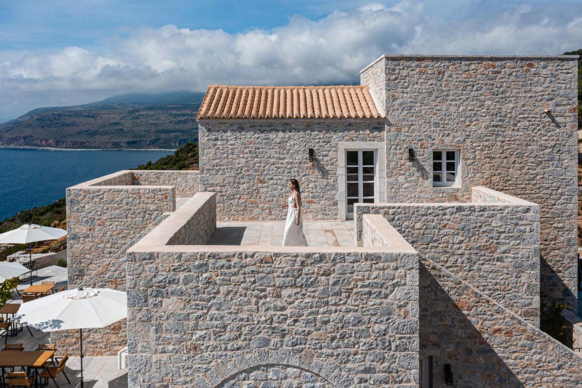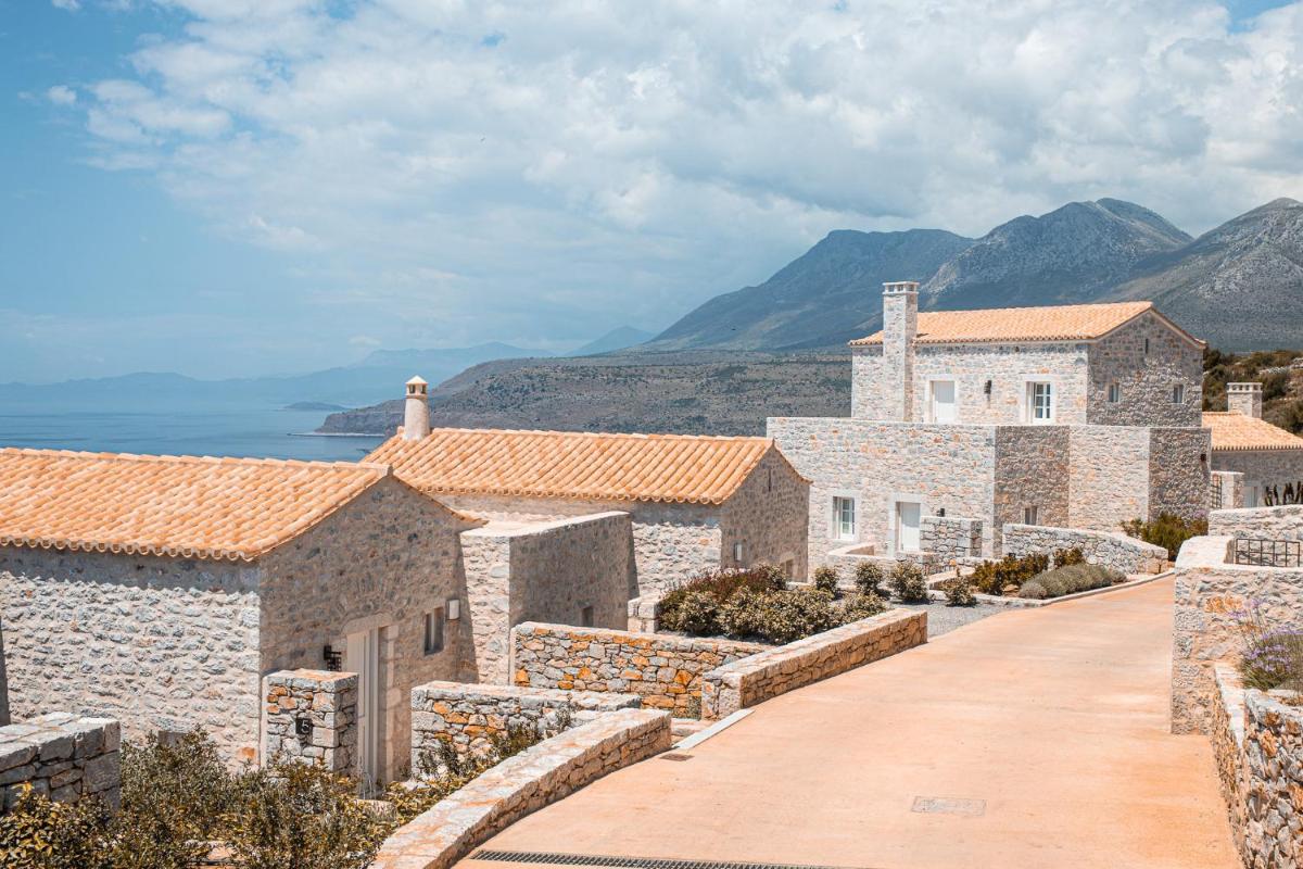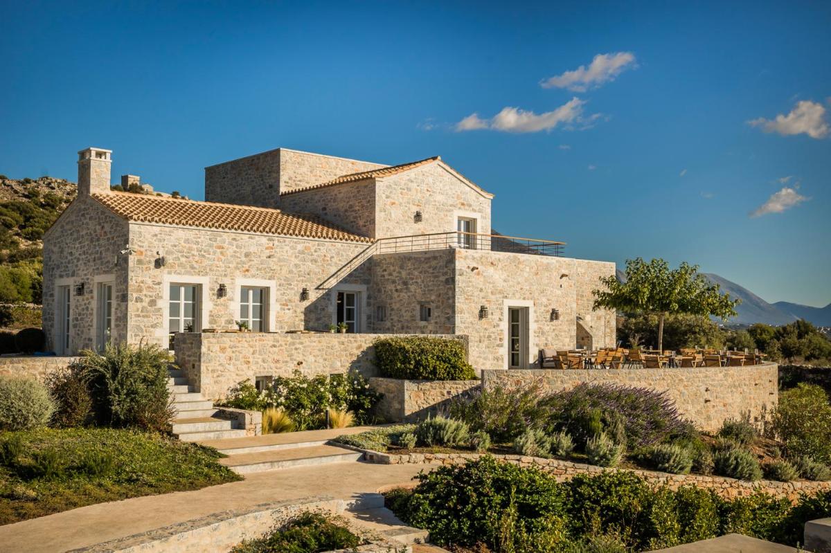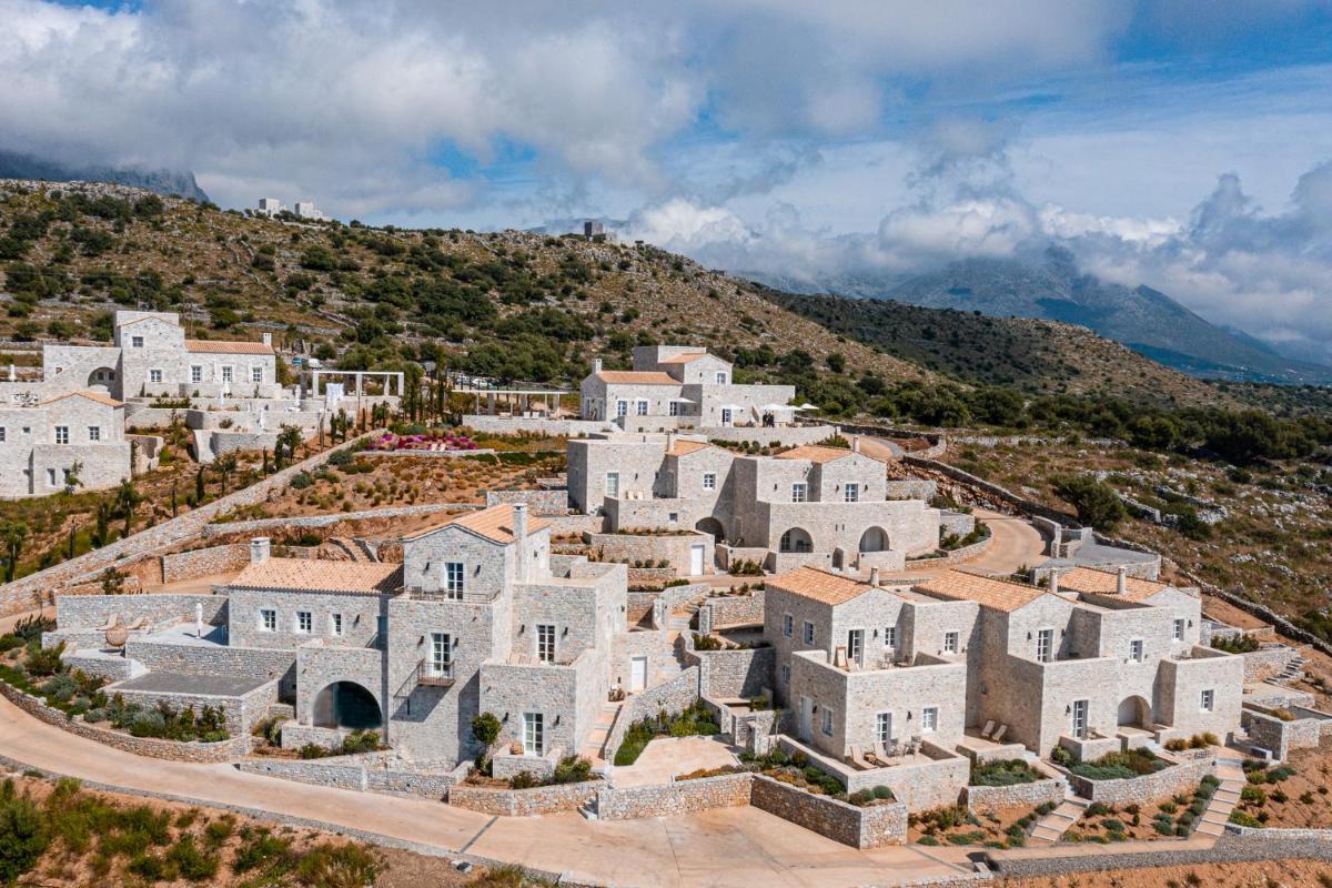 Die Struktur ist vollständig aus lokalem Stein gebaut und respektiert den Stil der Verteidigungstürme von Mani. Die Suiten sind geräumig, mit maßgefertigten Möbeln und luxuriösen Stoffen, und viele verfügen über private Terrassen mit Meerblick.
