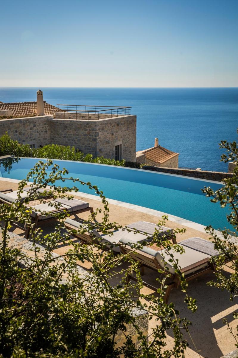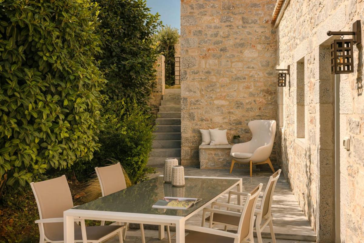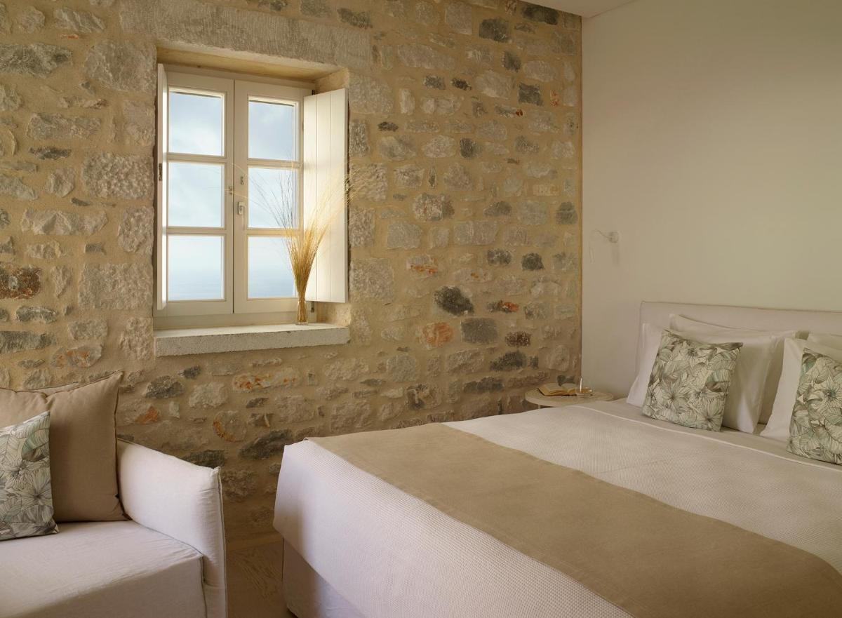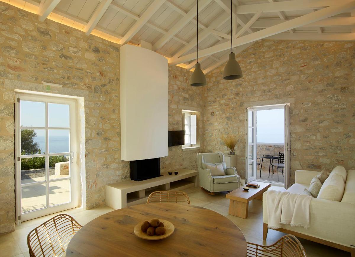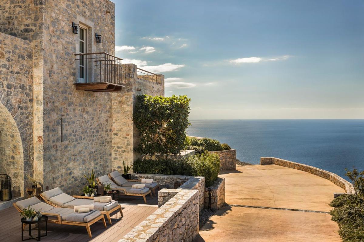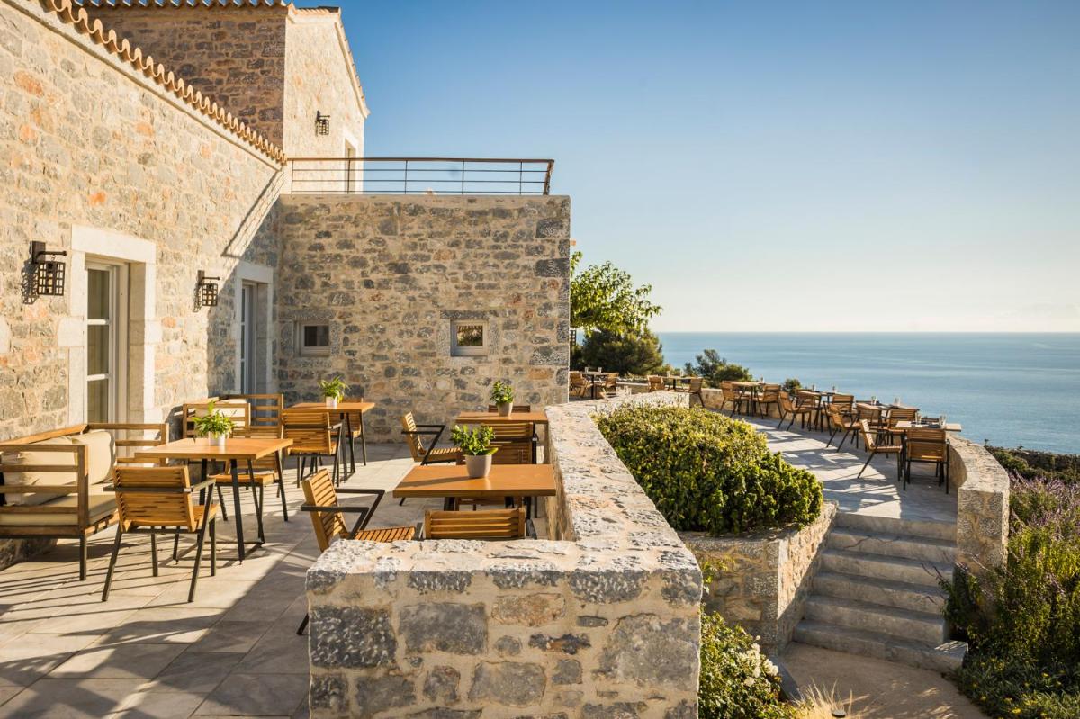 Die Struktur ist vollständig aus lokalem Stein gebaut und respektiert den Stil der Verteidigungstürme von Mani. Die Suiten sind geräumig, mit maßgefertigten Möbeln und luxuriösen Stoffen, und viele verfügen über private Terrassen mit Meerblick.