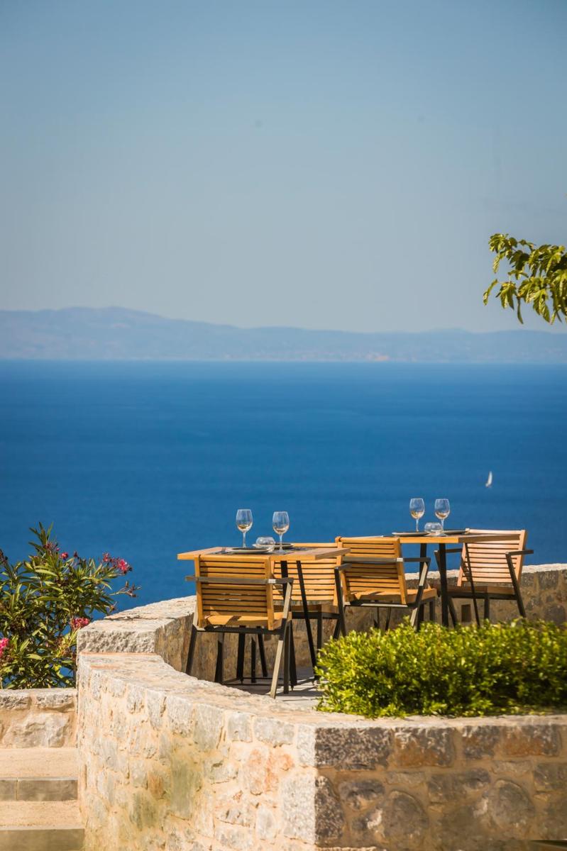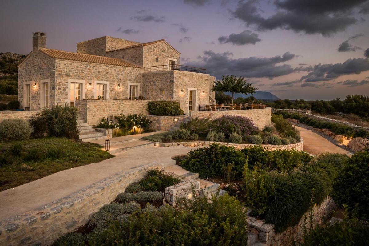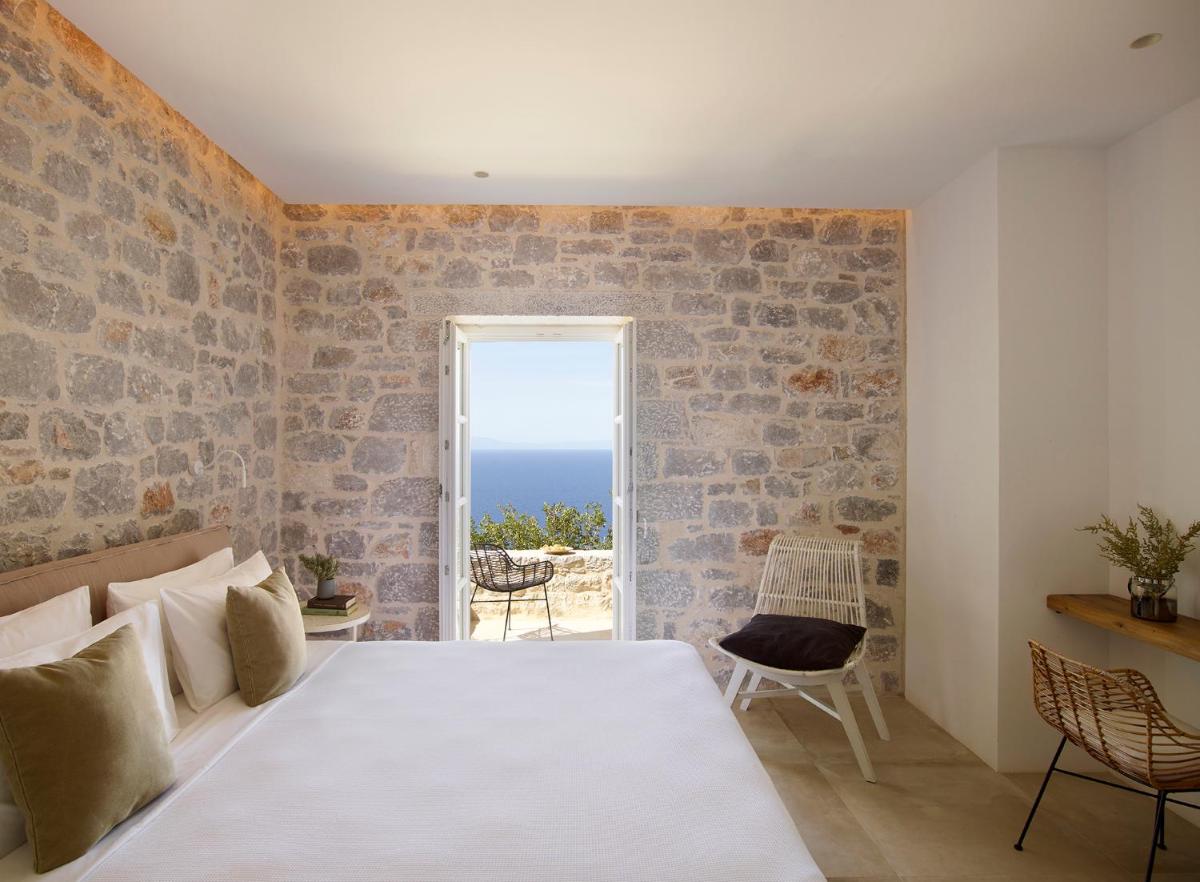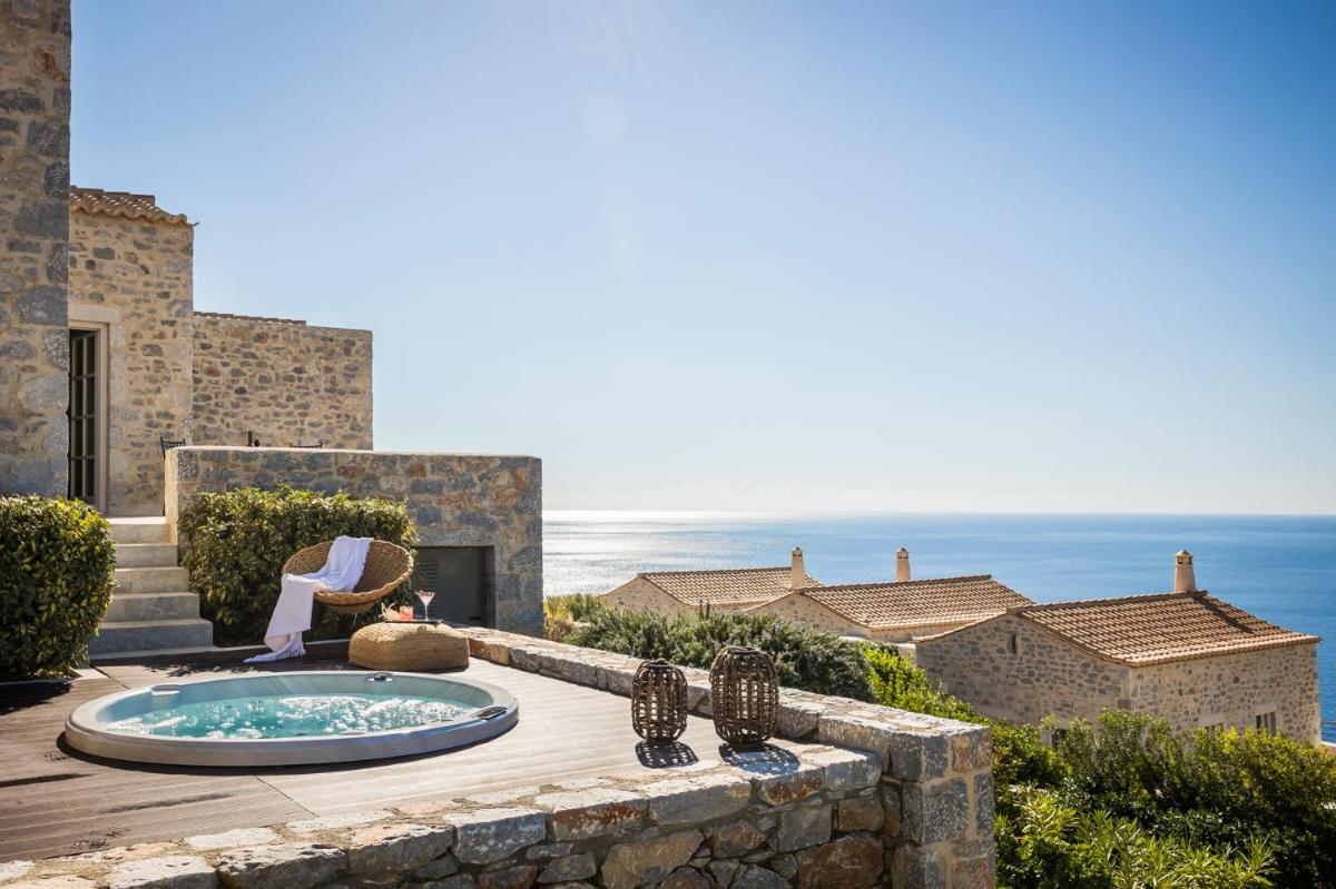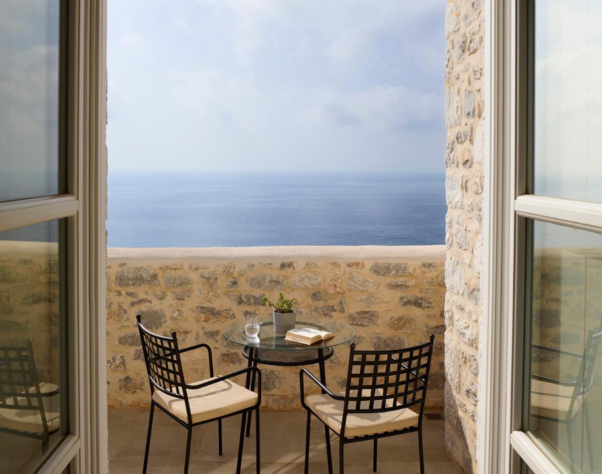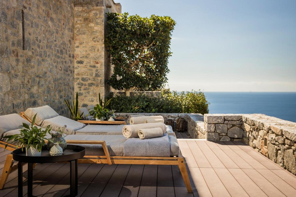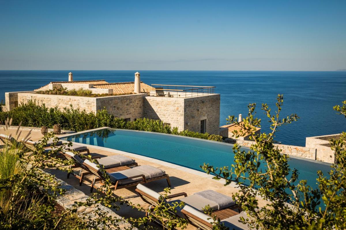 Die Struktur ist vollständig aus lokalem Stein gebaut und respektiert den Stil der Verteidigungstürme von Mani. Die Suiten sind geräumig, mit maßgefertigten Möbeln und luxuriösen Stoffen, und viele verfügen über private Terrassen mit Meerblick.