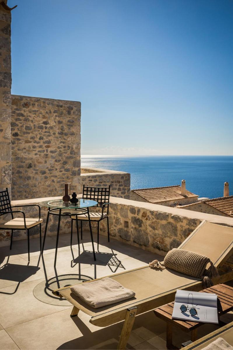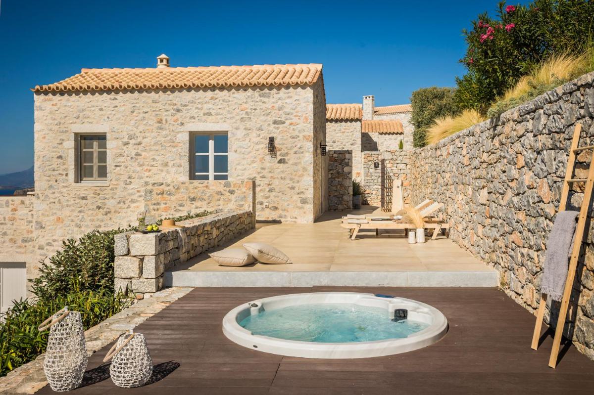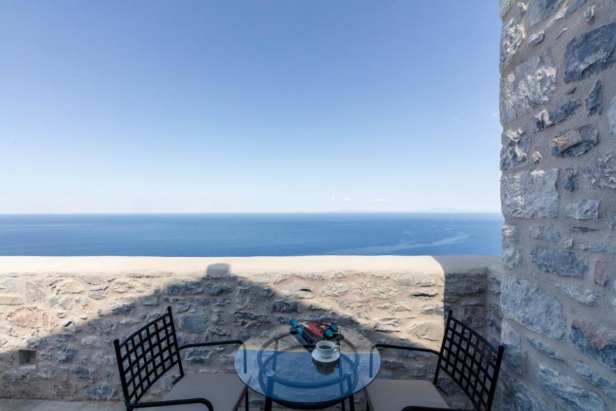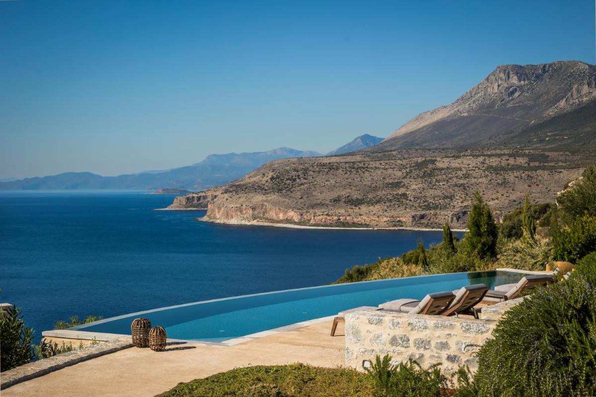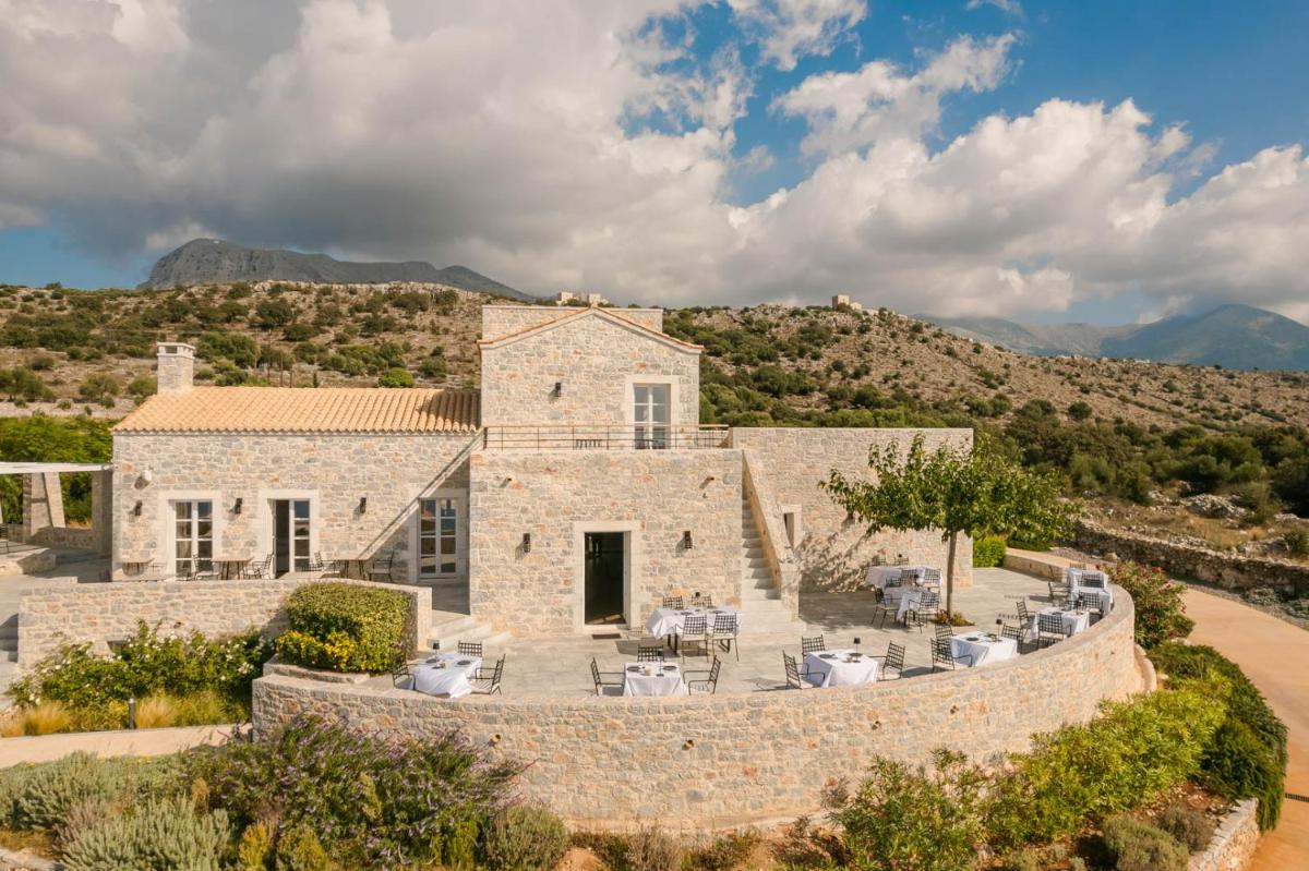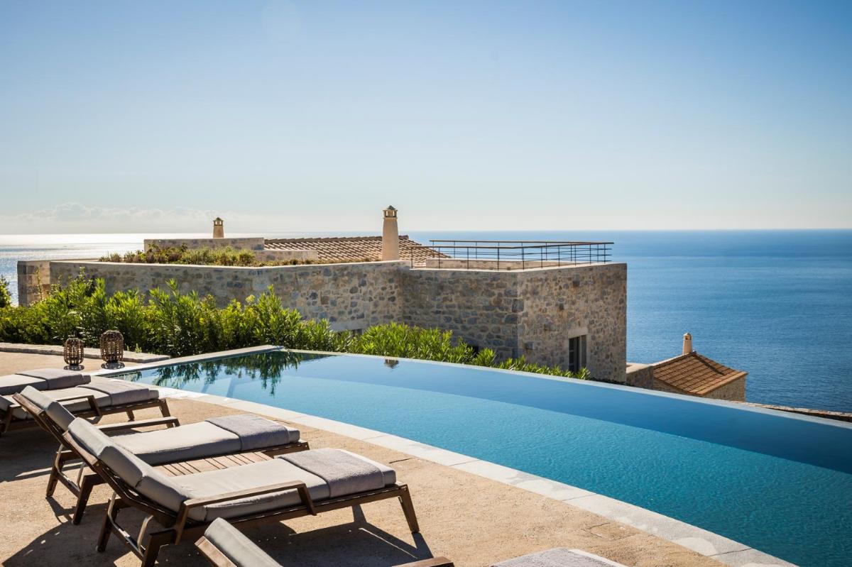 Die Struktur ist vollständig aus lokalem Stein gebaut und respektiert den Stil der Verteidigungstürme von Mani. Die Suiten sind geräumig, mit maßgefertigten Möbeln und luxuriösen Stoffen, und viele verfügen über private Terrassen mit Meerblick.