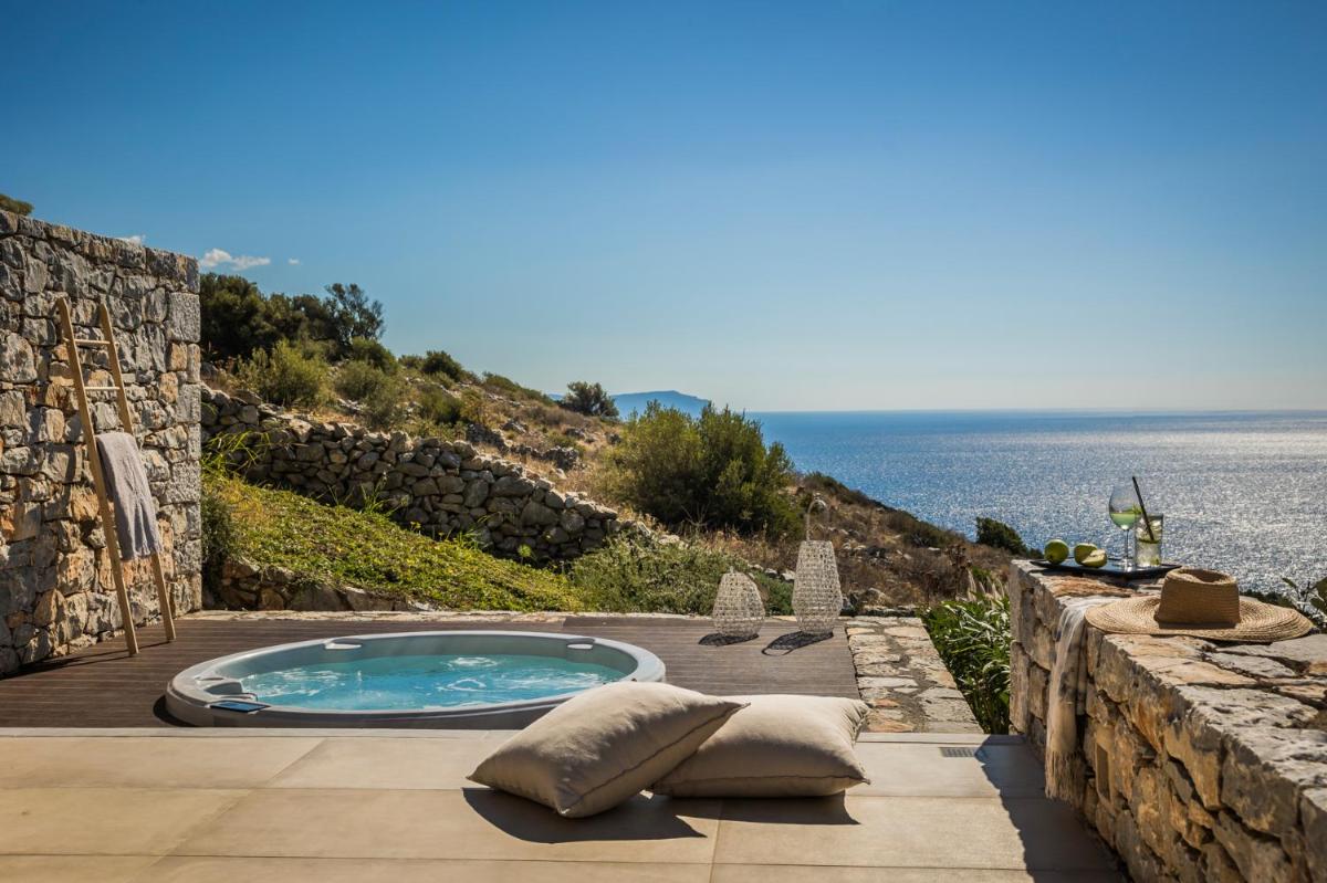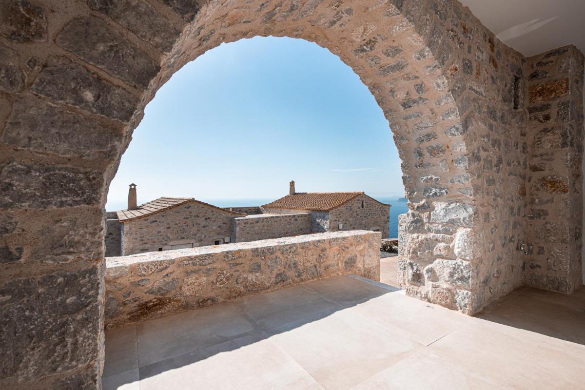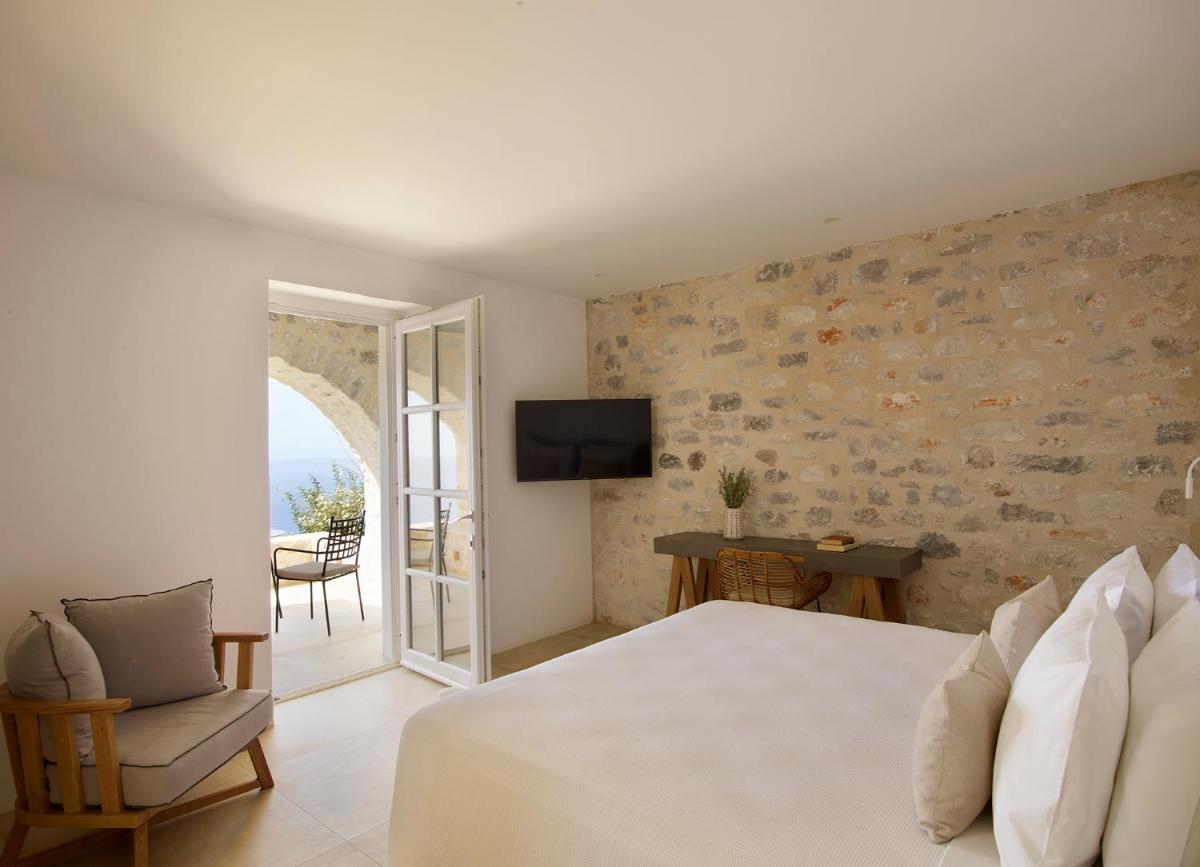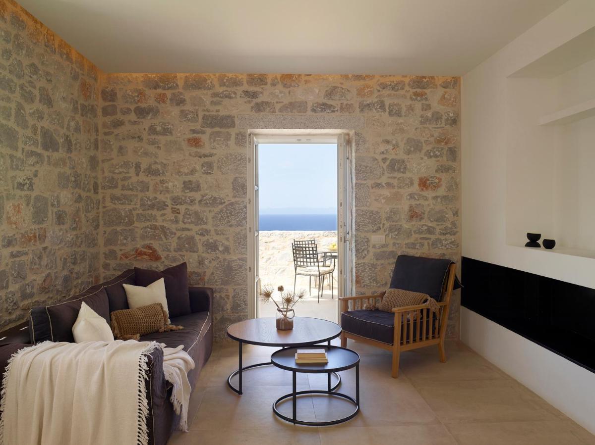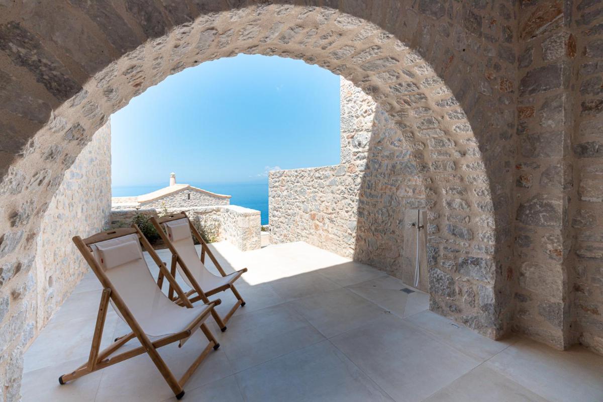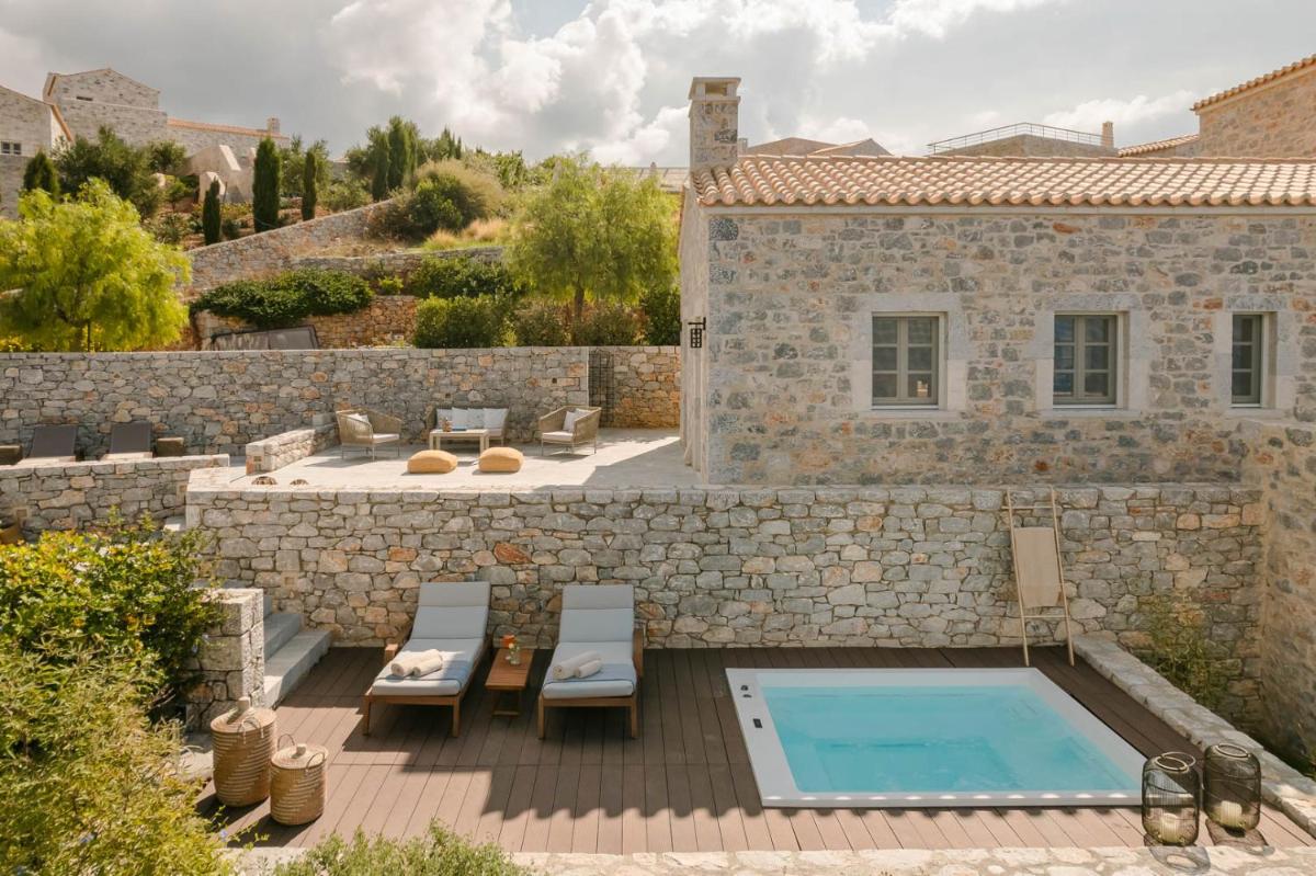 Die Struktur ist vollständig aus lokalem Stein gebaut und respektiert den Stil der Verteidigungstürme von Mani. Die Suiten sind geräumig, mit maßgefertigten Möbeln und luxuriösen Stoffen, und viele verfügen über private Terrassen mit Meerblick.