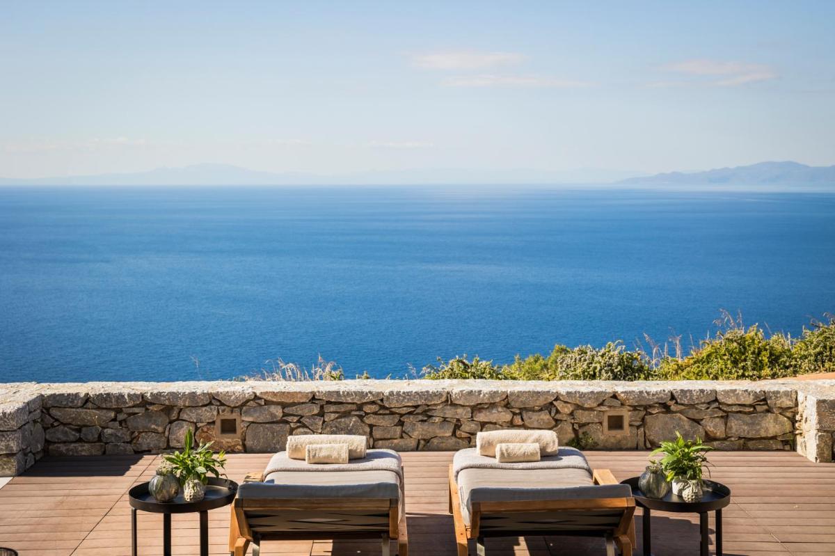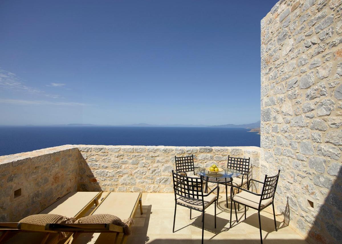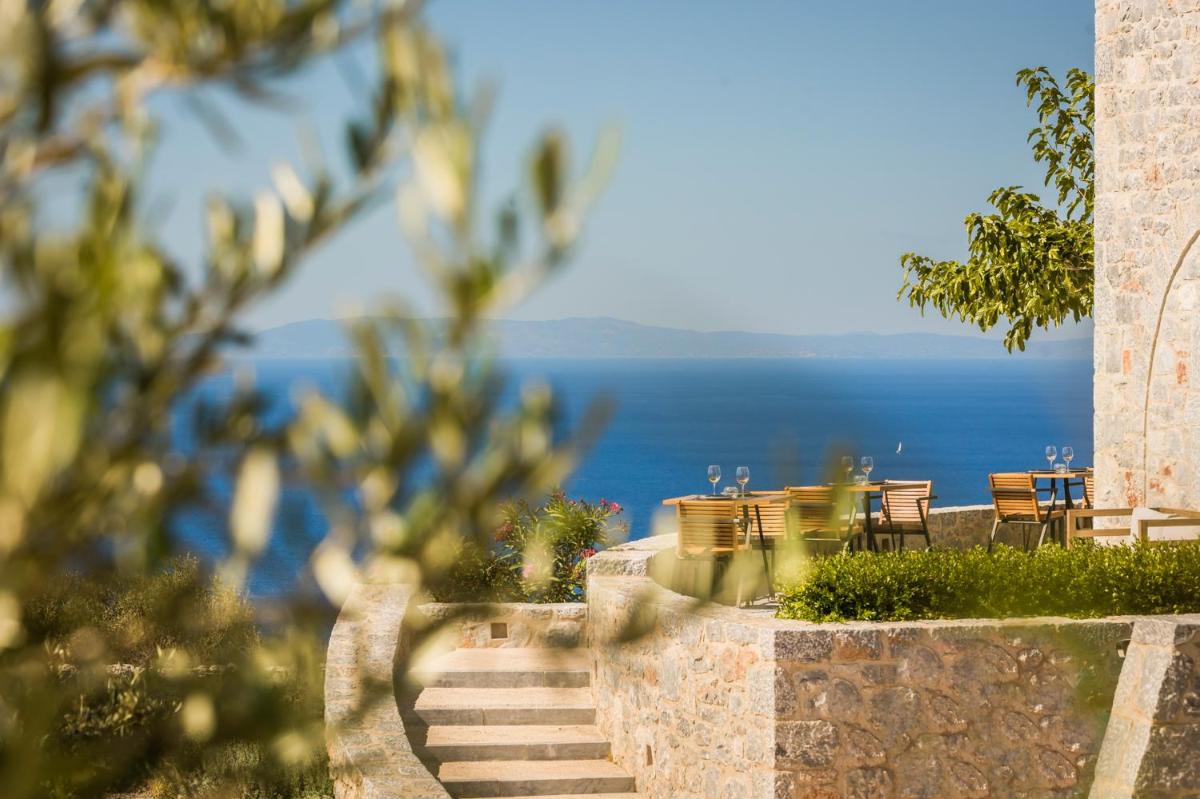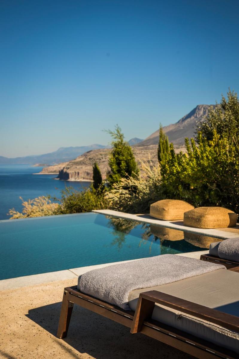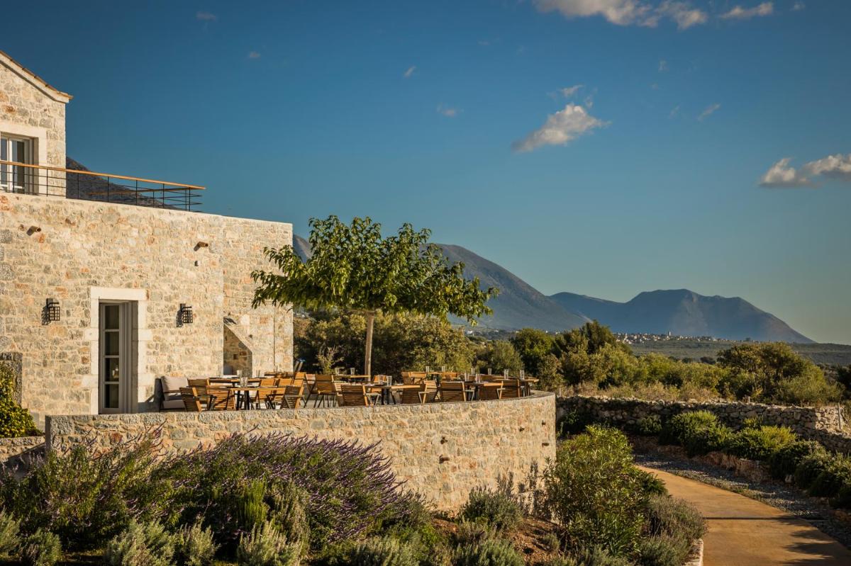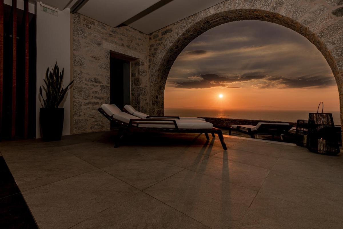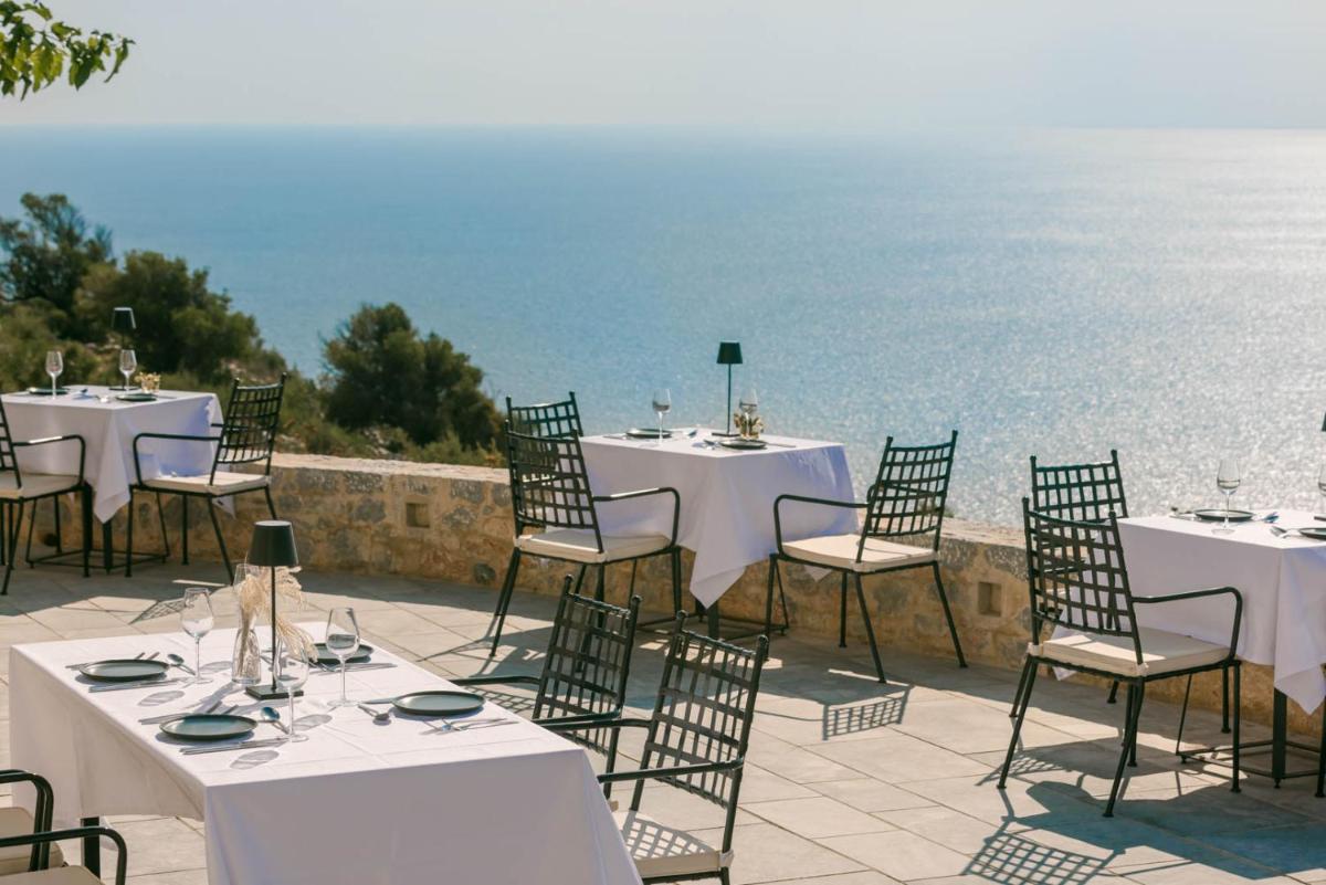 Die Struktur ist vollständig aus lokalem Stein gebaut und respektiert den Stil der Verteidigungstürme von Mani. Die Suiten sind geräumig, mit maßgefertigten Möbeln und luxuriösen Stoffen, und viele verfügen über private Terrassen mit Meerblick.
