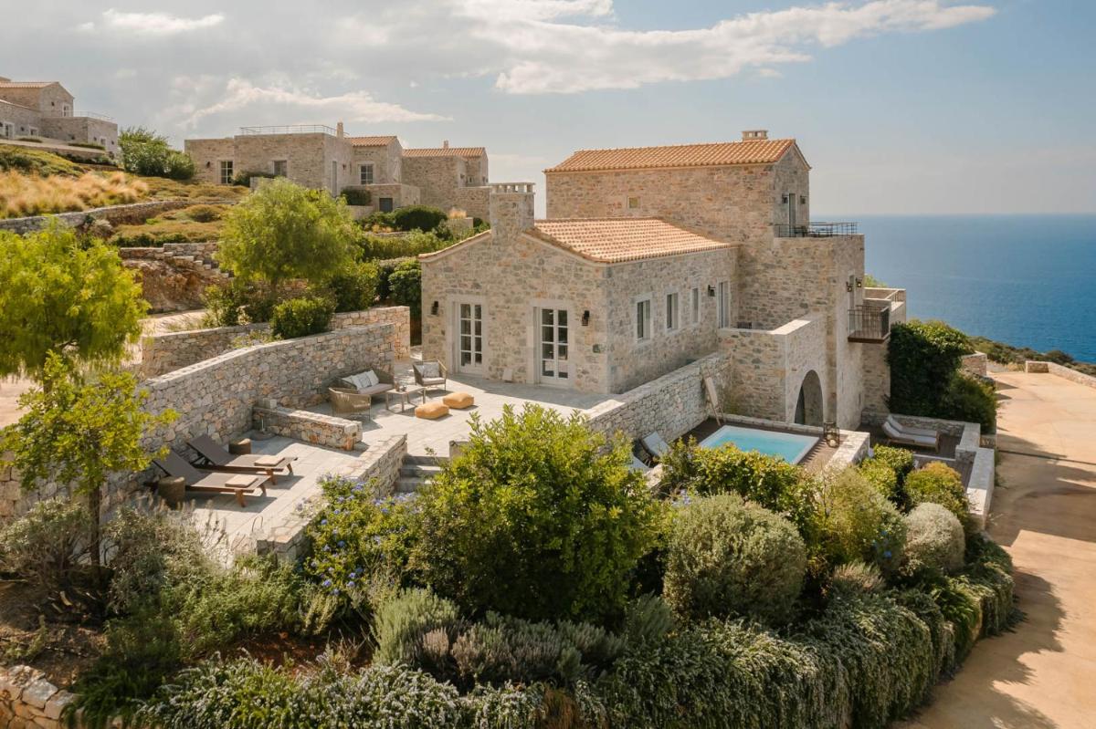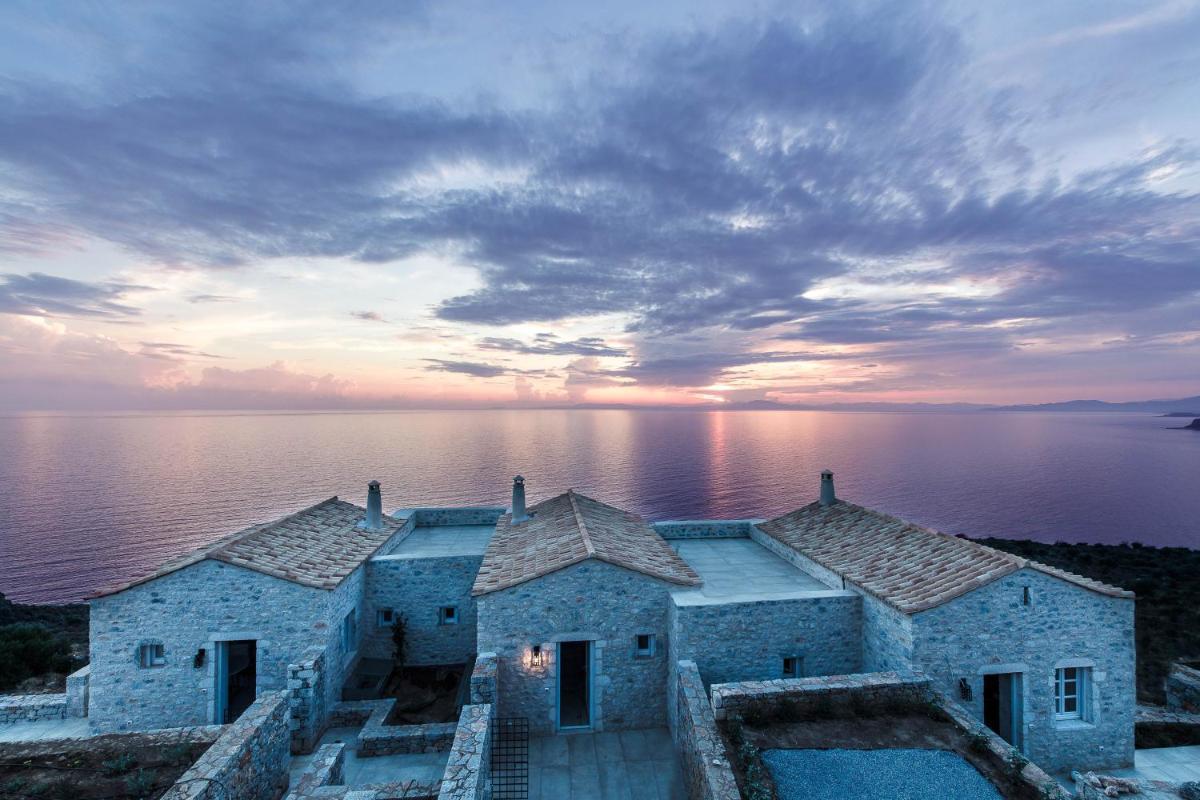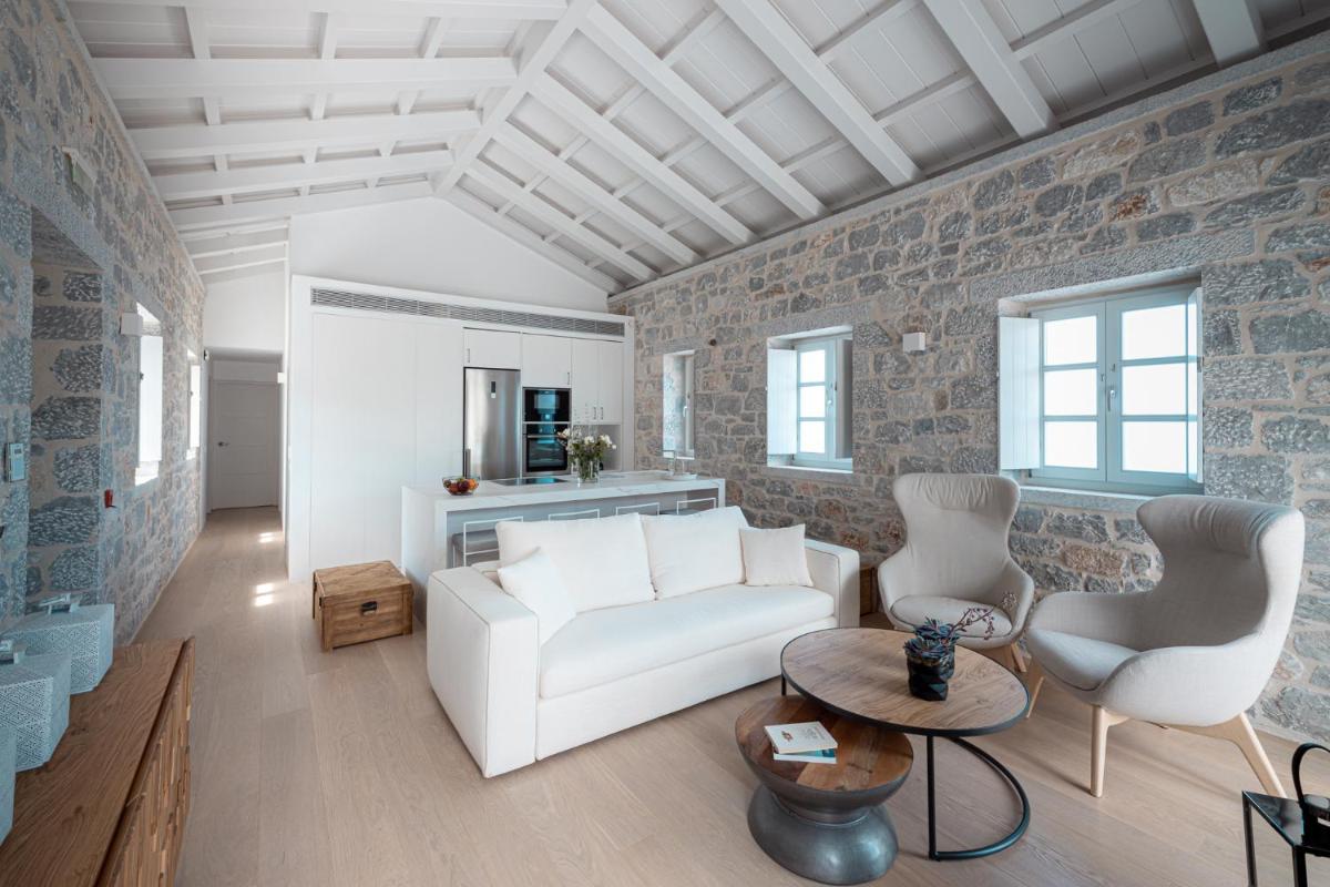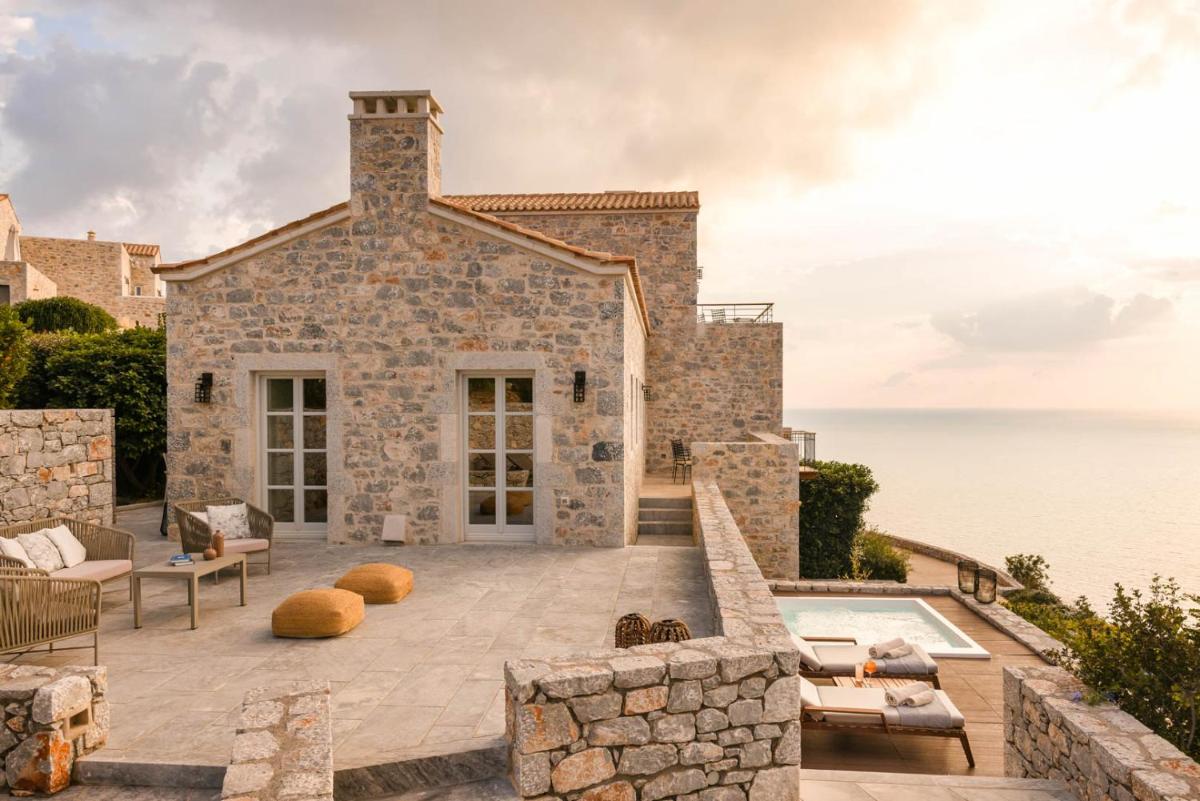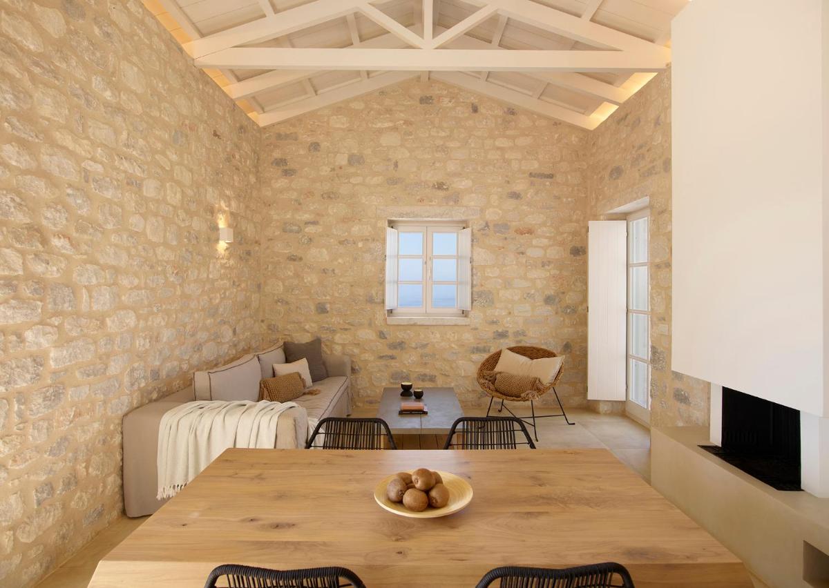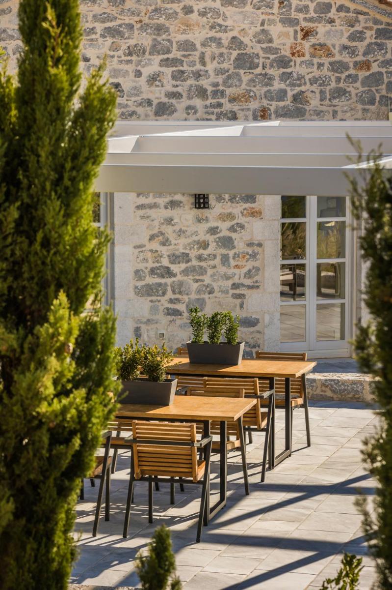 Die Struktur ist vollständig aus lokalem Stein gebaut und respektiert den Stil der Verteidigungstürme von Mani. Die Suiten sind geräumig, mit maßgefertigten Möbeln und luxuriösen Stoffen, und viele verfügen über private Terrassen mit Meerblick.
