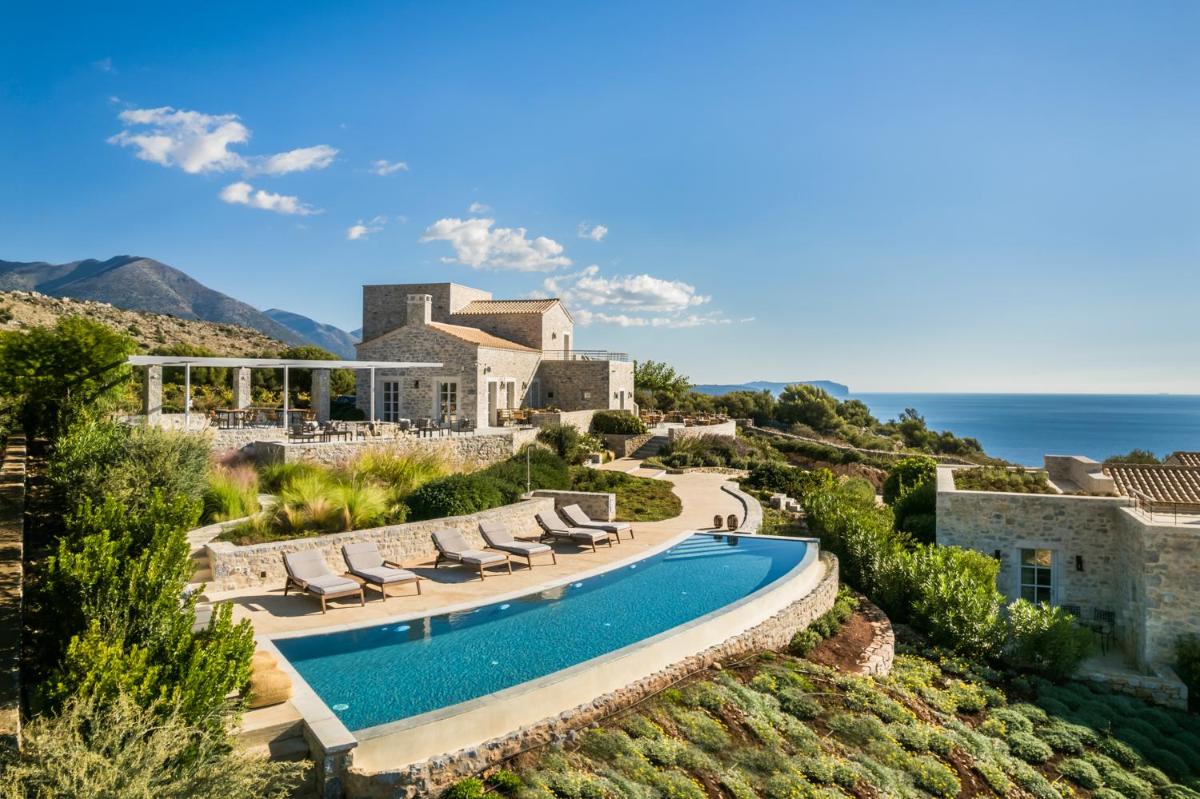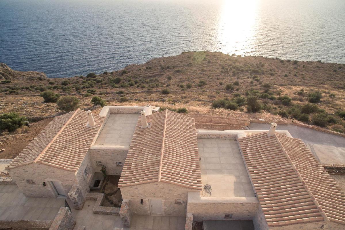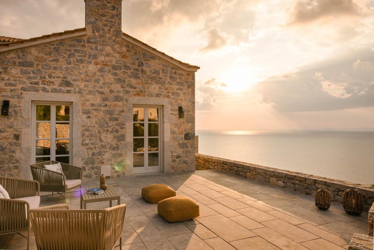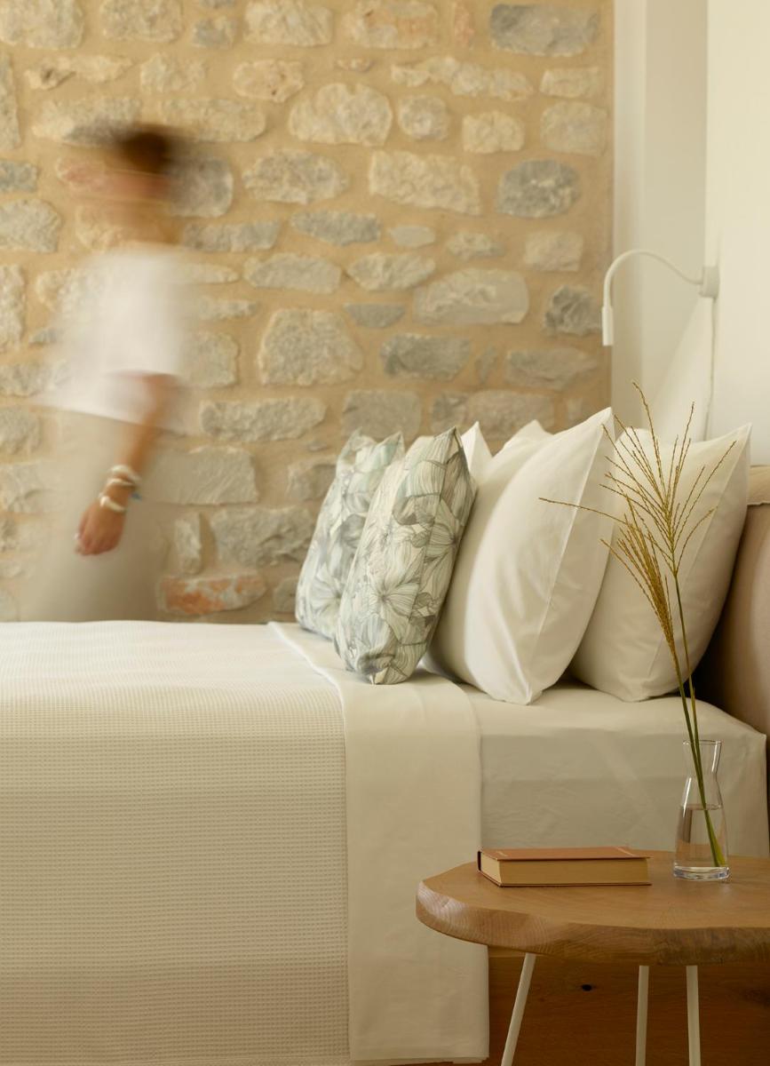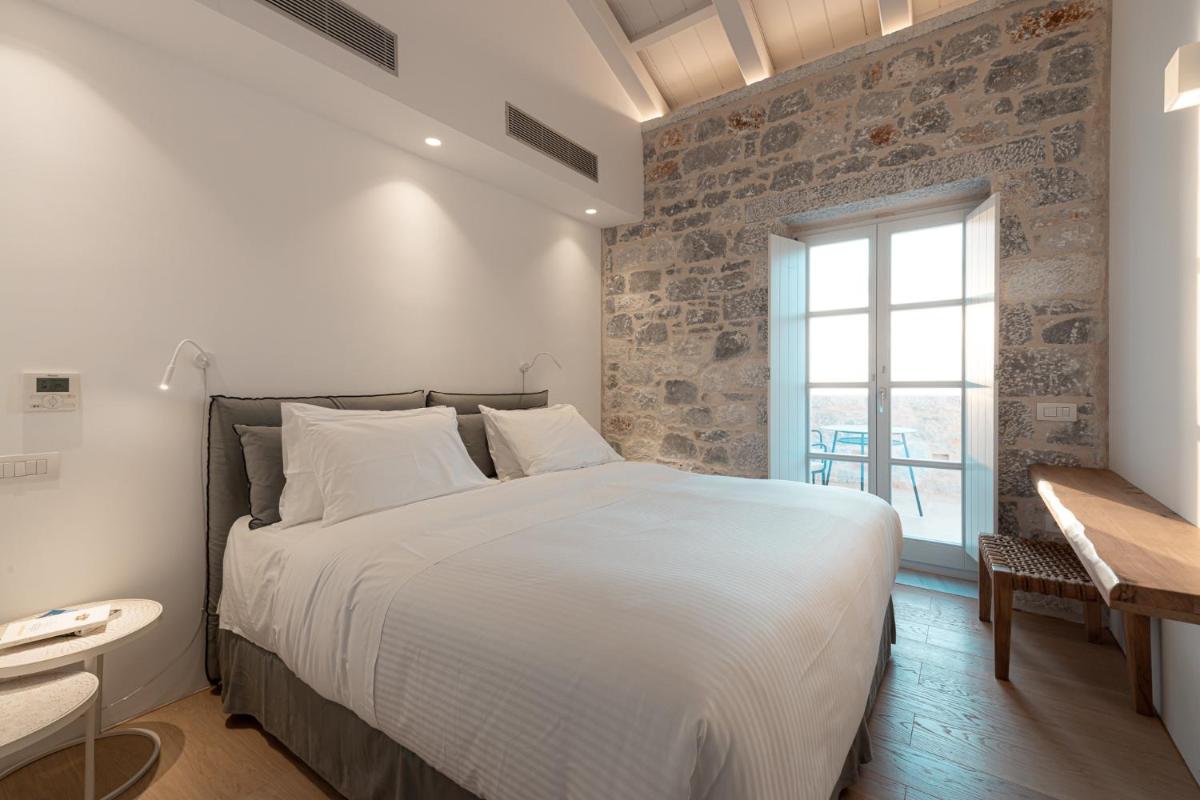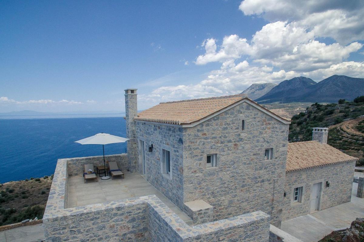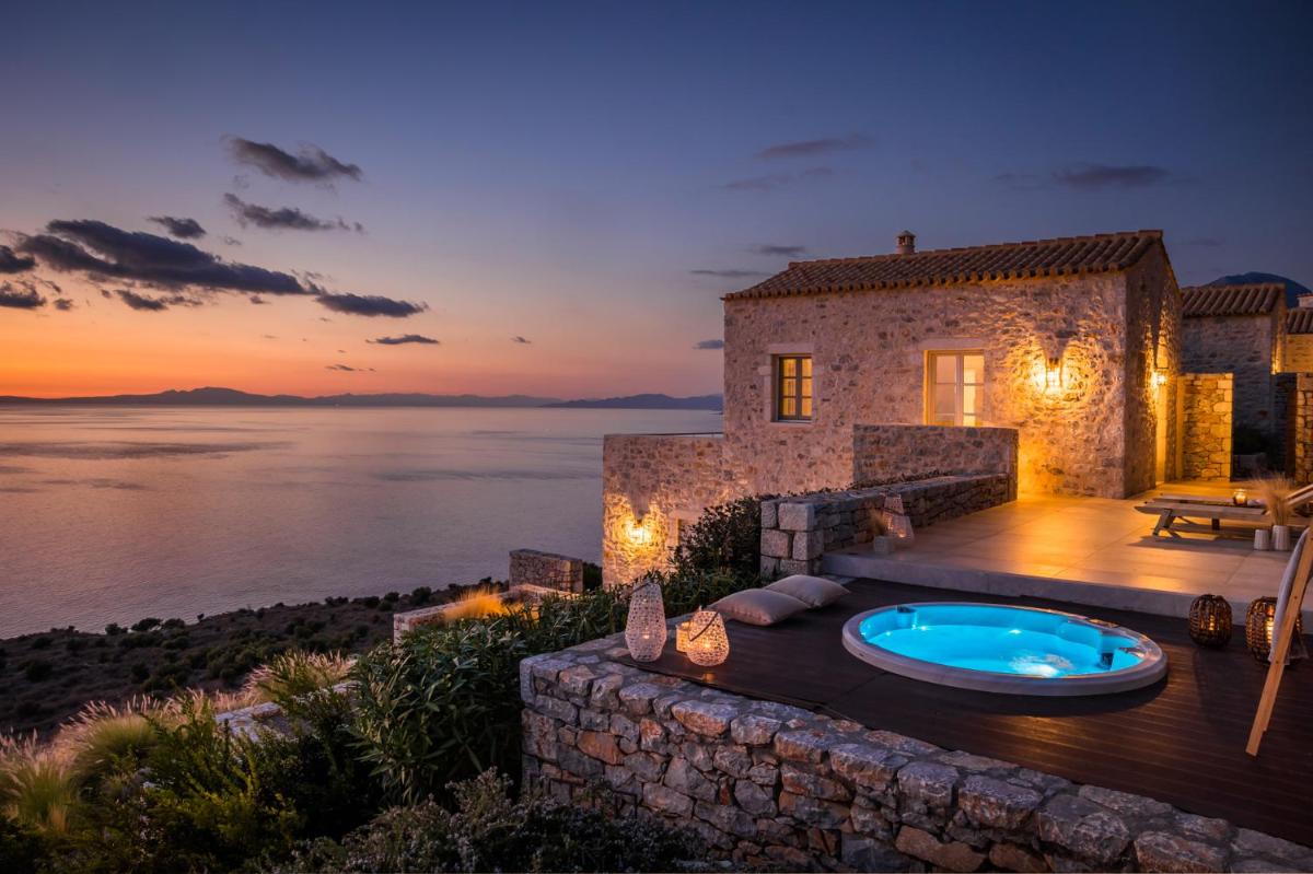 Die Struktur ist vollständig aus lokalem Stein gebaut und respektiert den Stil der Verteidigungstürme von Mani. Die Suiten sind geräumig, mit maßgefertigten Möbeln und luxuriösen Stoffen, und viele verfügen über private Terrassen mit Meerblick.