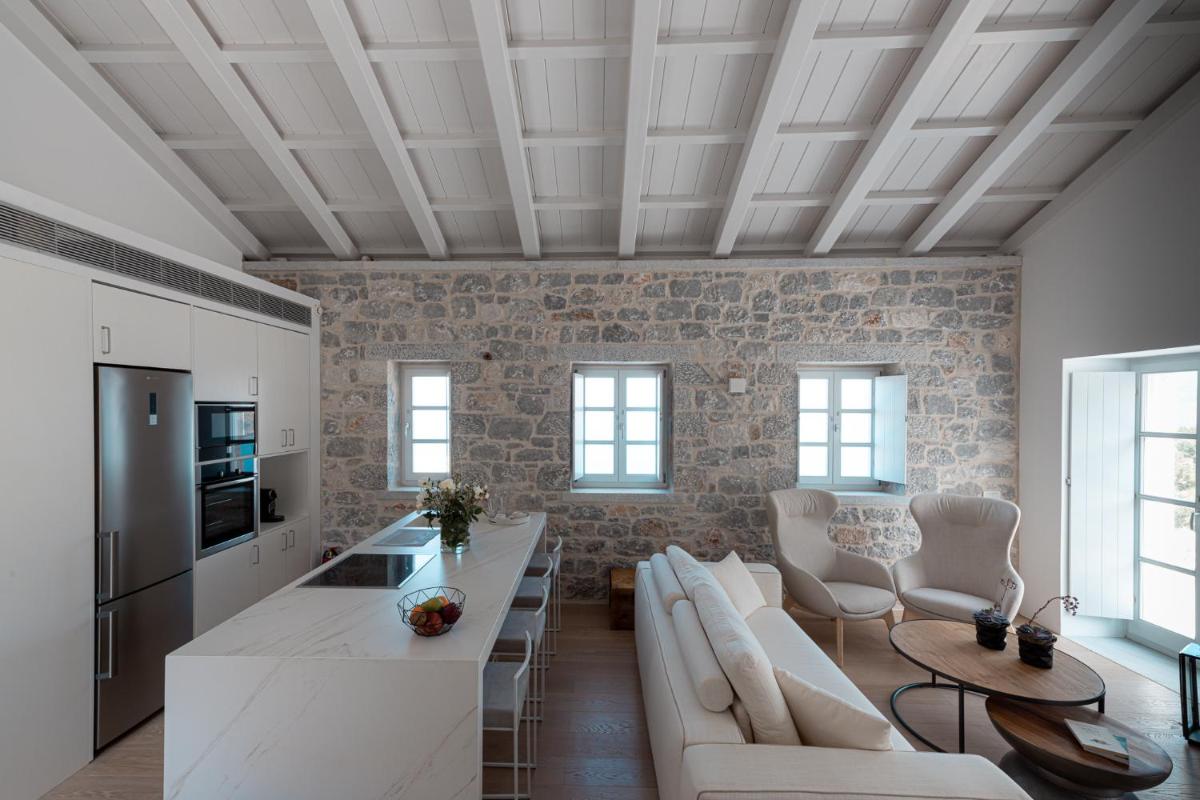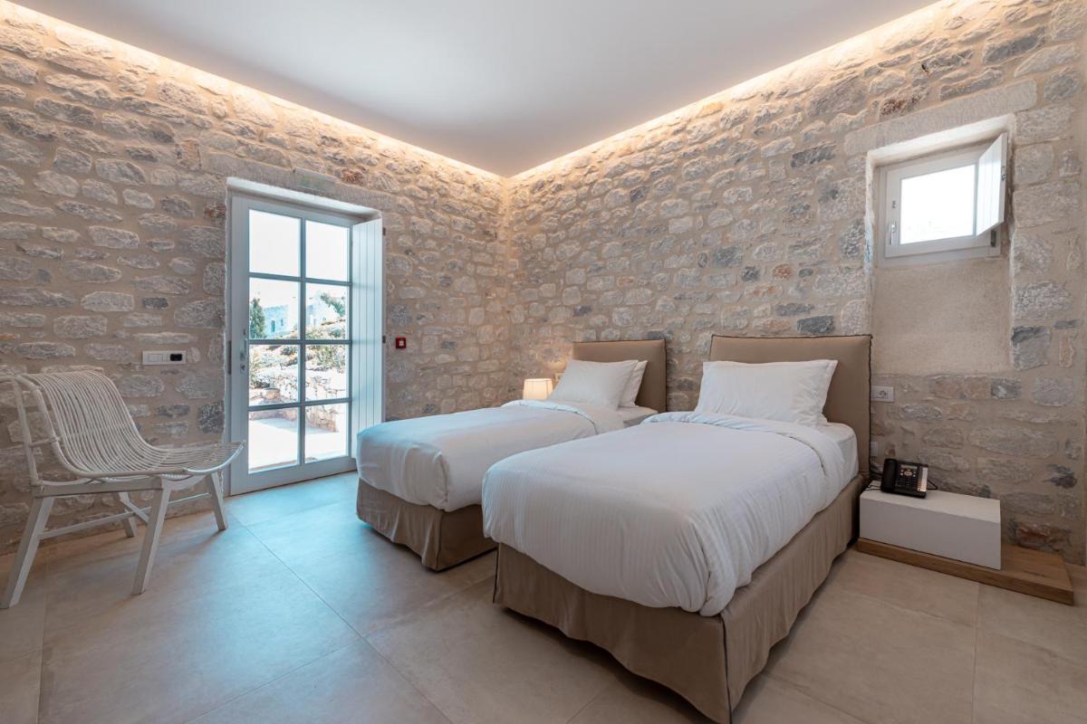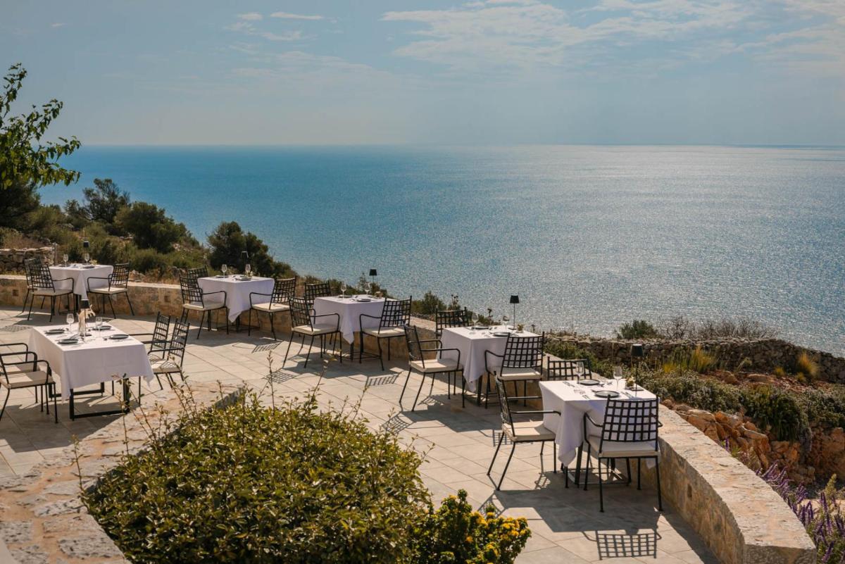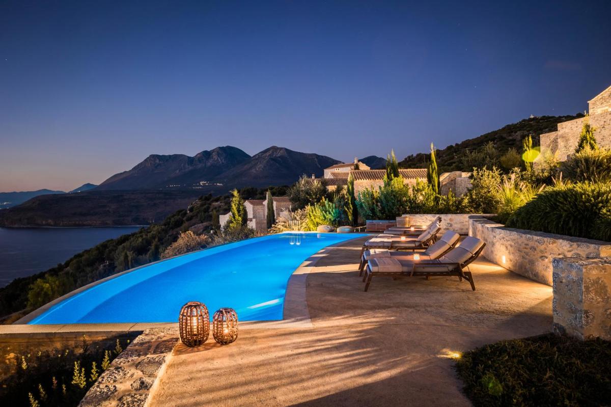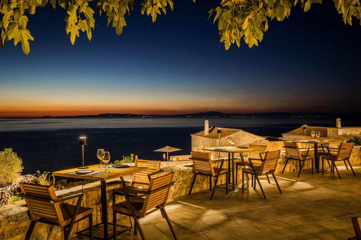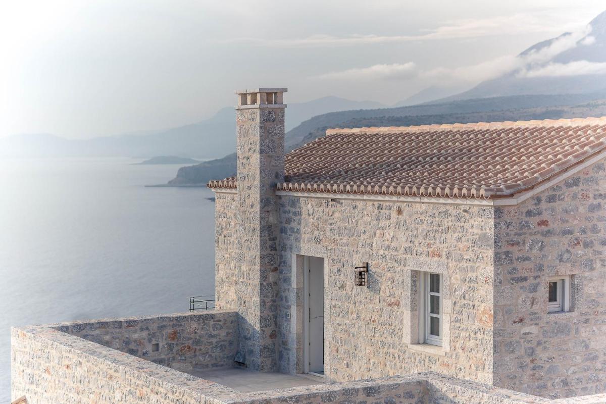 Die Struktur ist vollständig aus lokalem Stein gebaut und respektiert den Stil der Verteidigungstürme von Mani. Die Suiten sind geräumig, mit maßgefertigten Möbeln und luxuriösen Stoffen, und viele verfügen über private Terrassen mit Meerblick.
