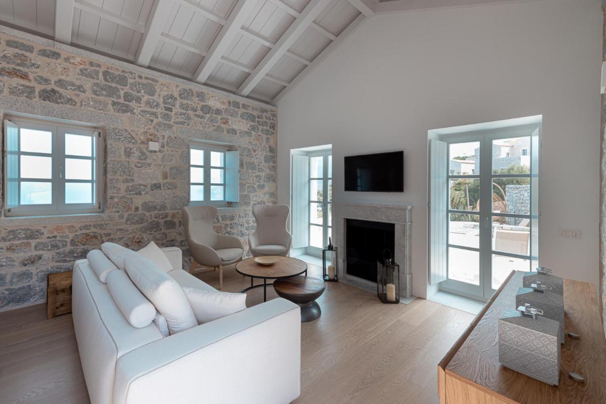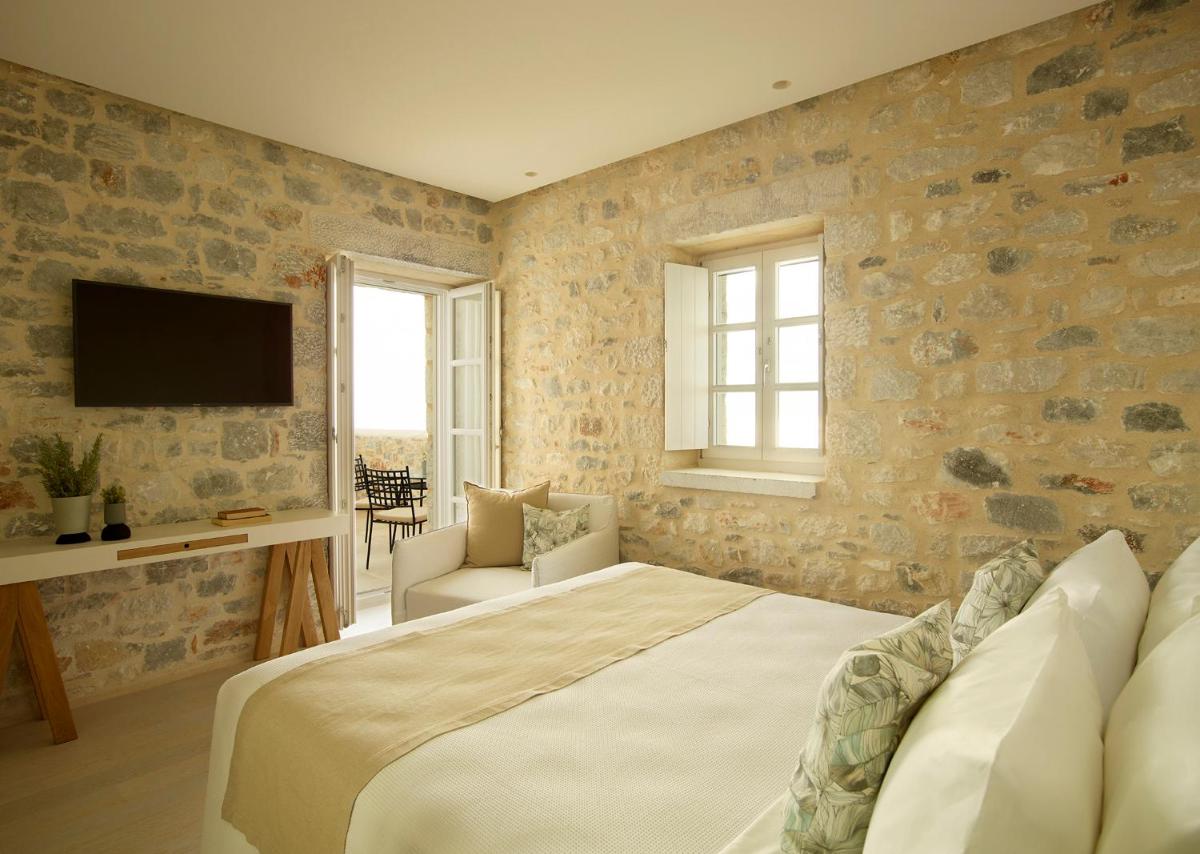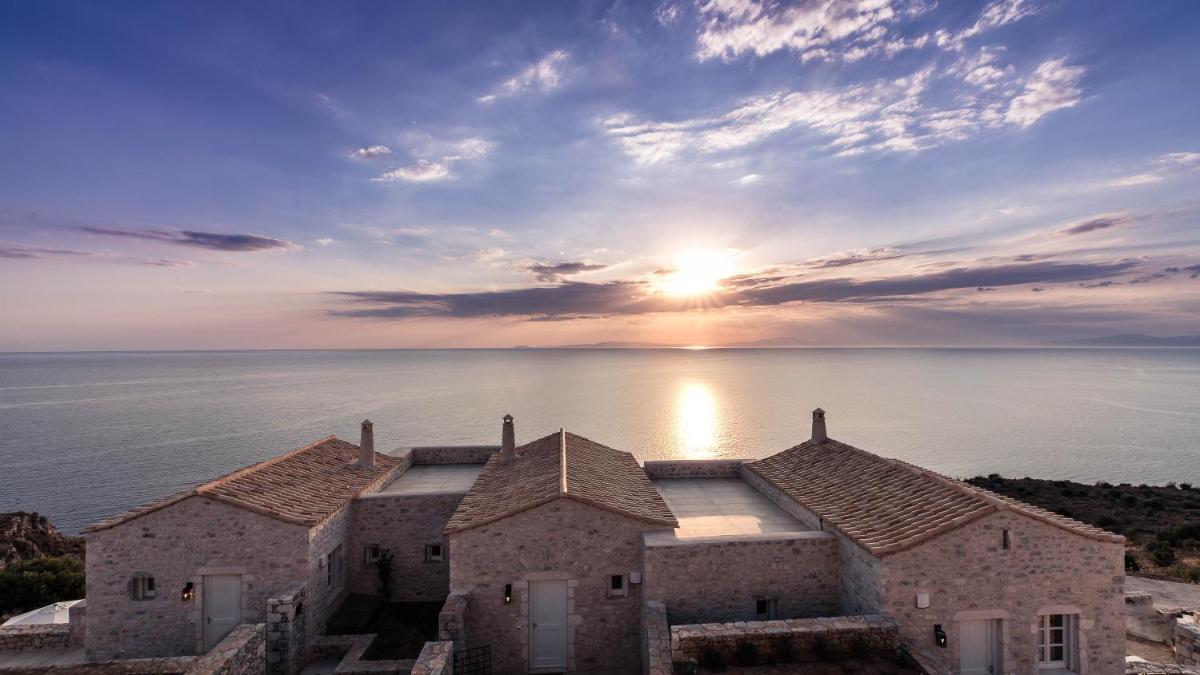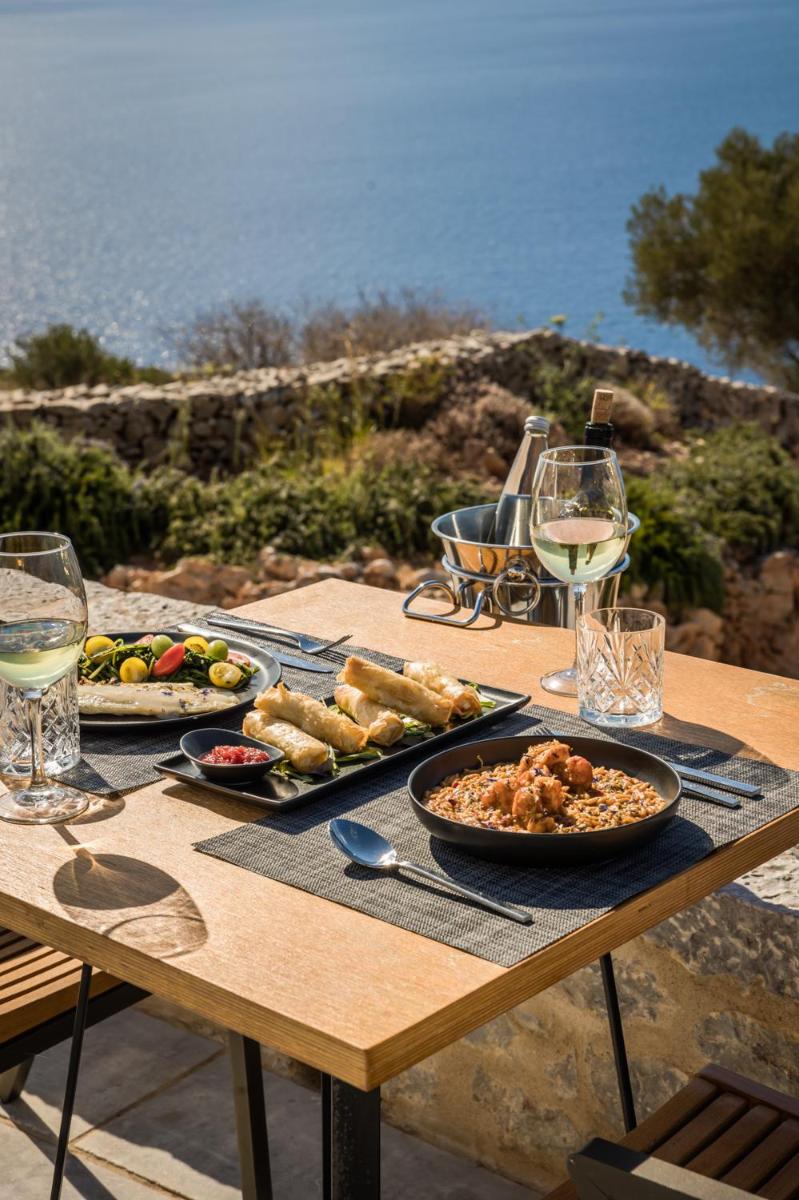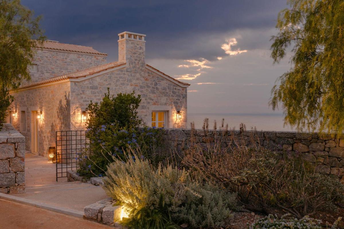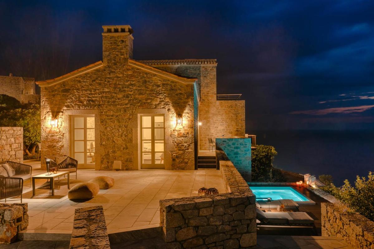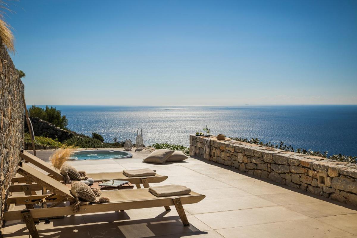 Die Struktur ist vollständig aus lokalem Stein gebaut und respektiert den Stil der Verteidigungstürme von Mani. Die Suiten sind geräumig, mit maßgefertigten Möbeln und luxuriösen Stoffen, und viele verfügen über private Terrassen mit Meerblick.