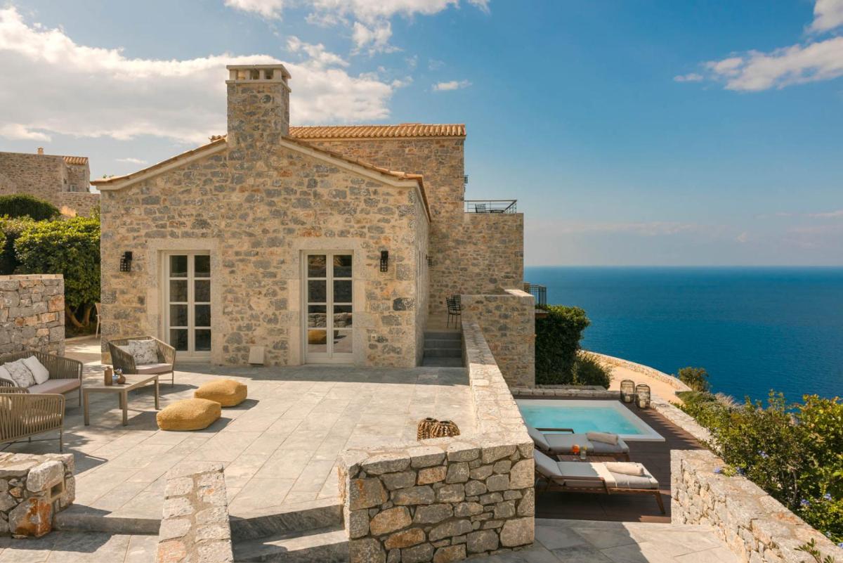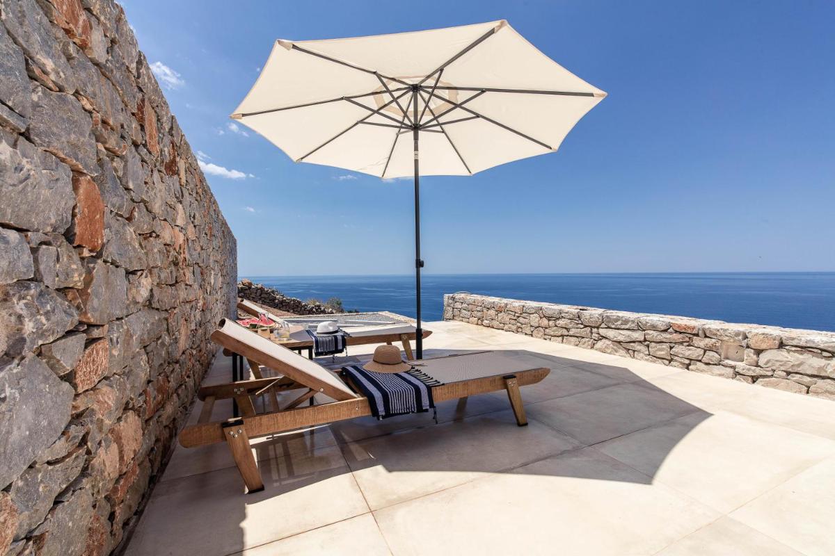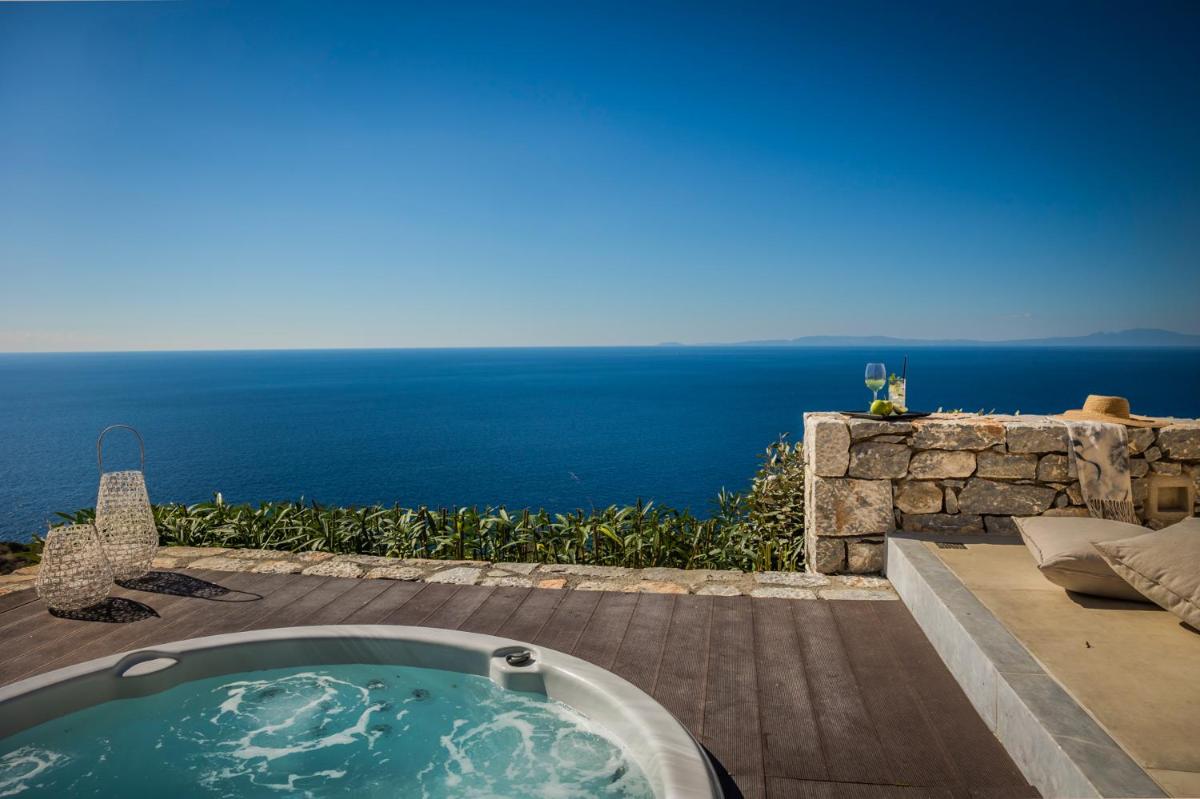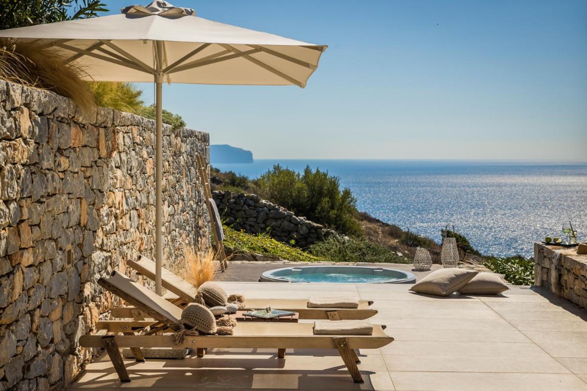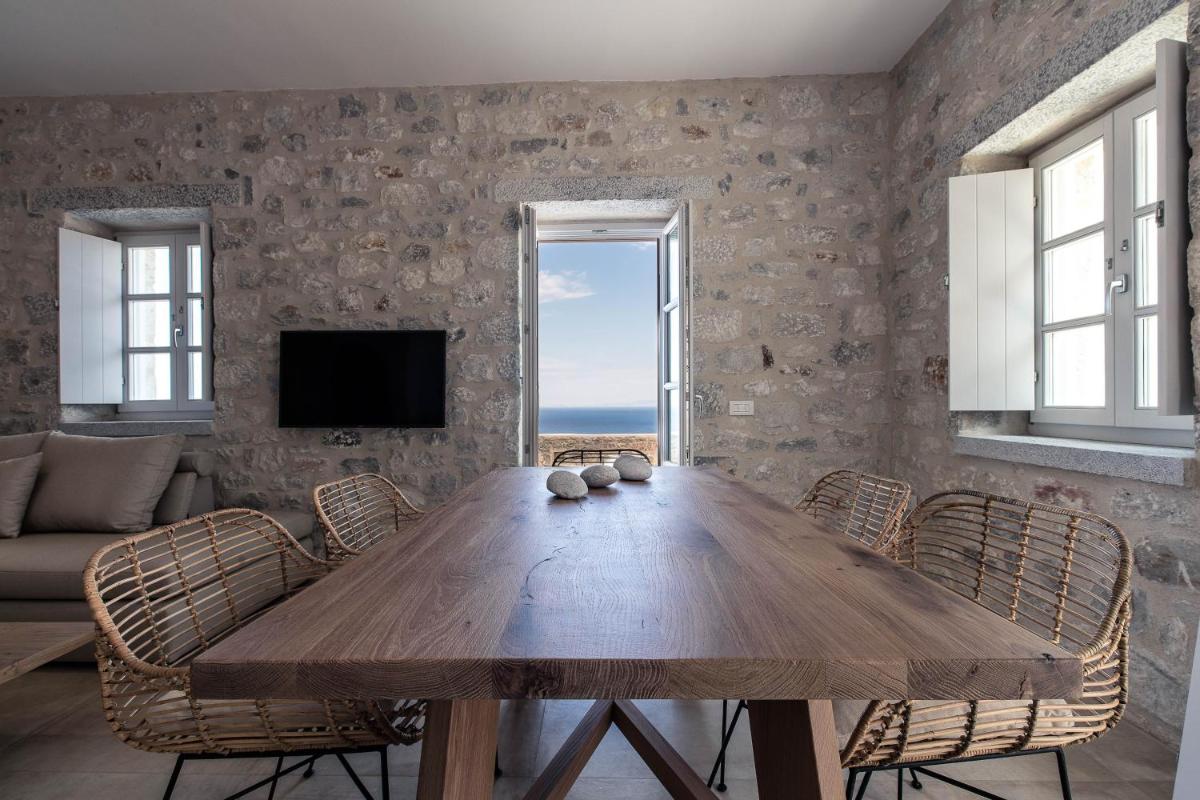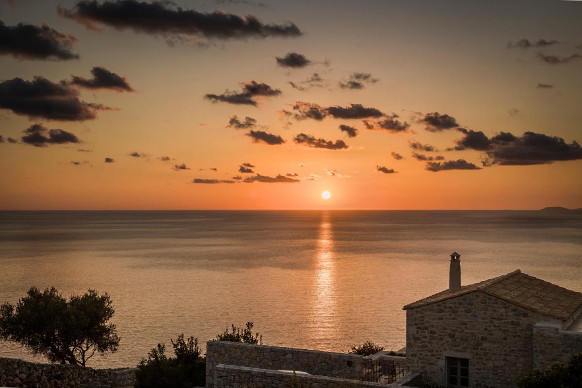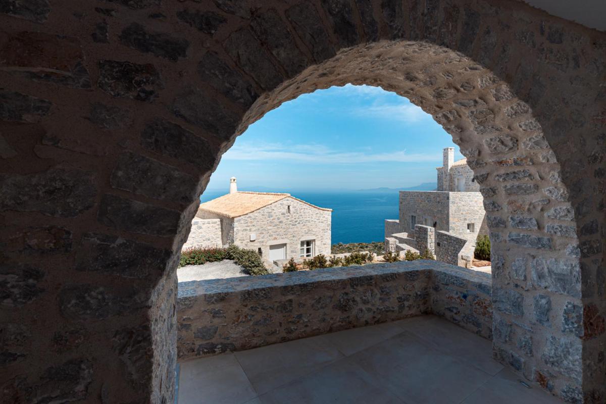 Die Struktur ist vollständig aus lokalem Stein gebaut und respektiert den Stil der Verteidigungstürme von Mani. Die Suiten sind geräumig, mit maßgefertigten Möbeln und luxuriösen Stoffen, und viele verfügen über private Terrassen mit Meerblick.