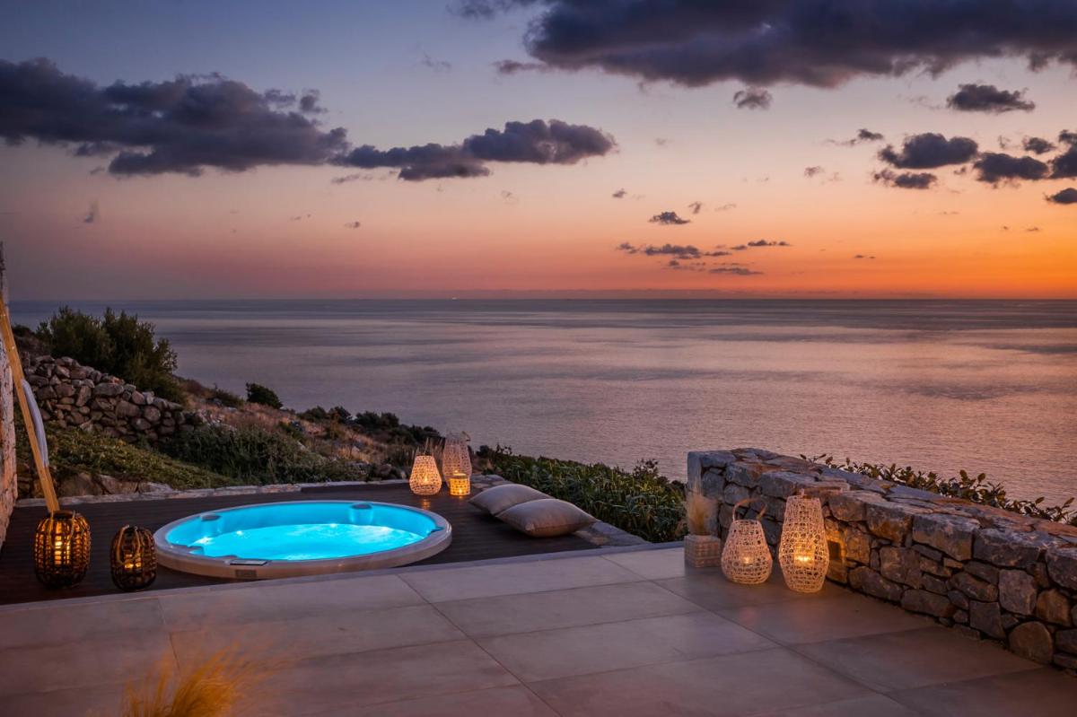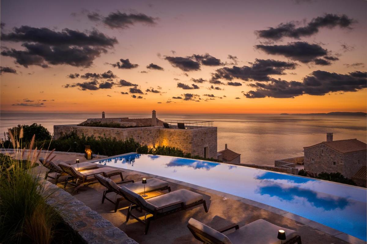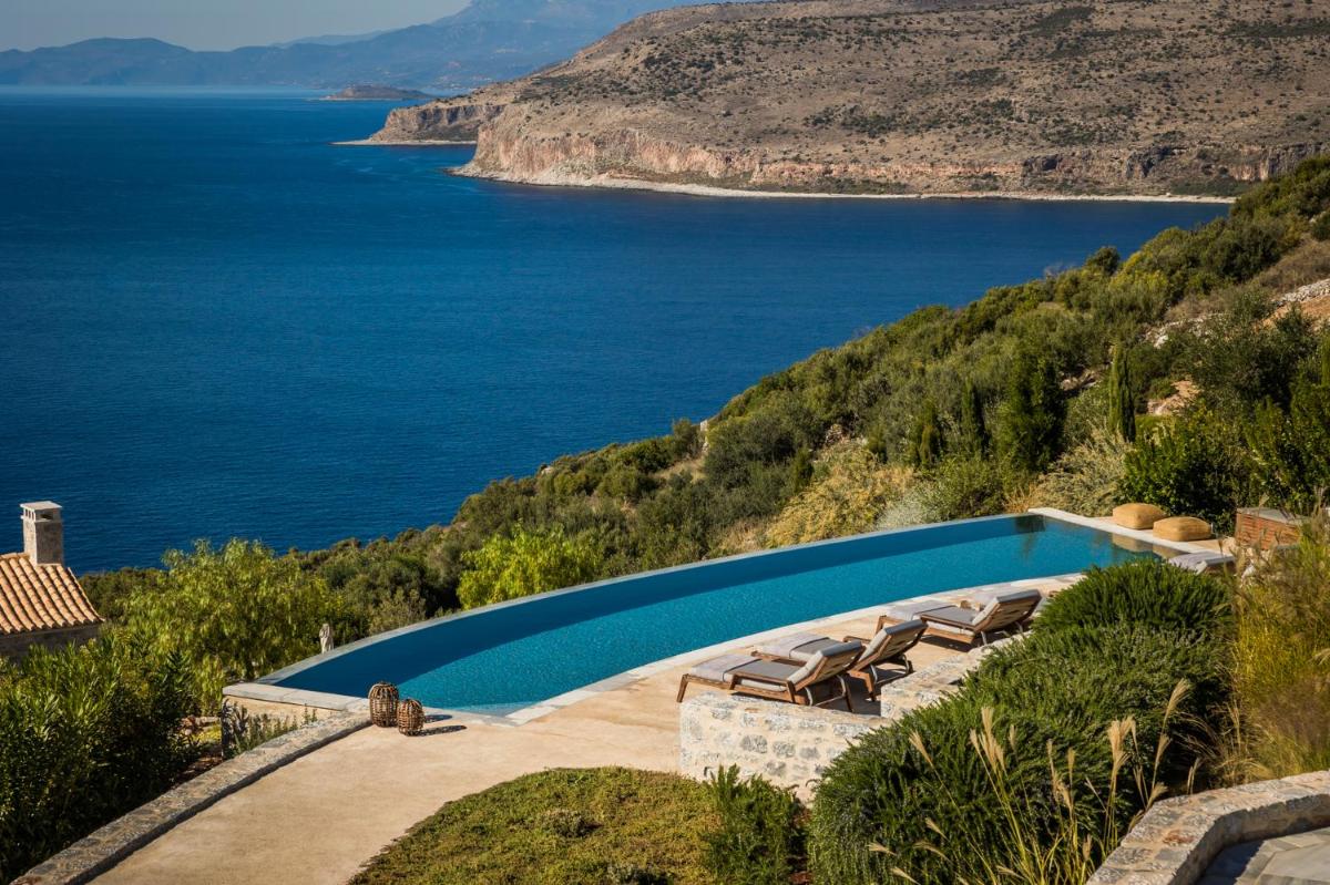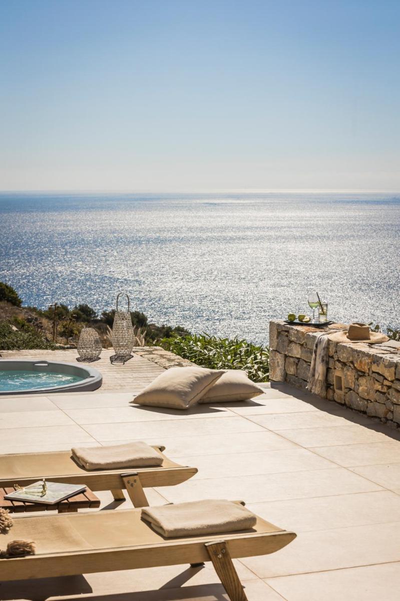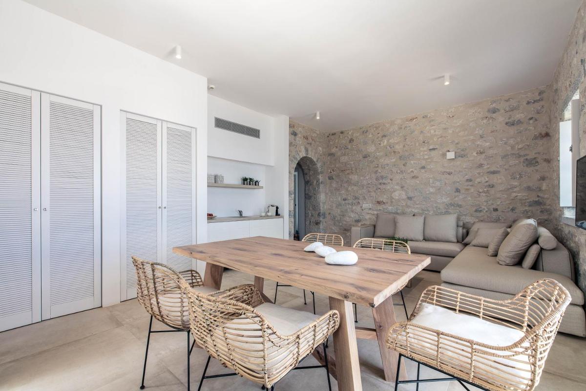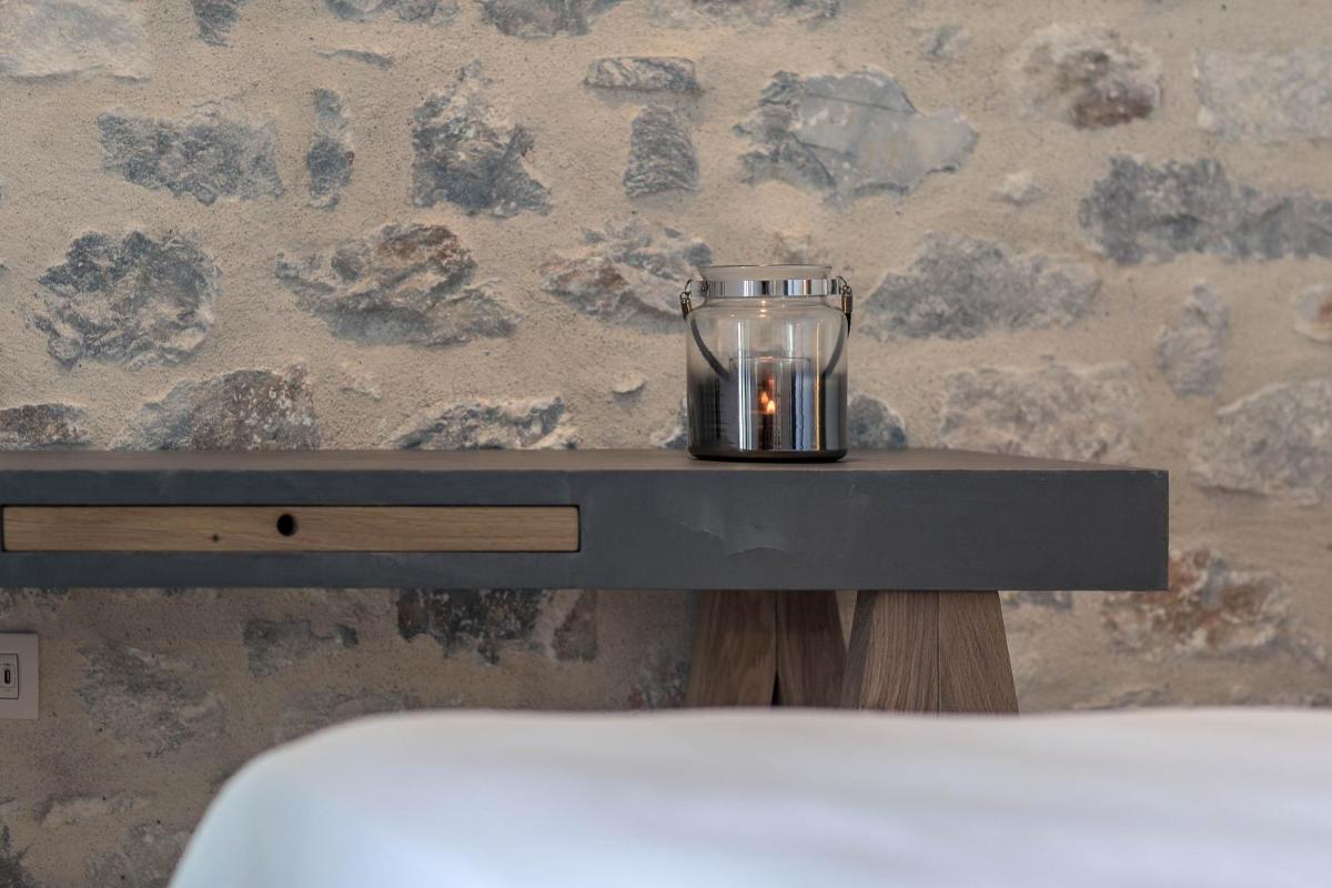 Die Struktur ist vollständig aus lokalem Stein gebaut und respektiert den Stil der Verteidigungstürme von Mani. Die Suiten sind geräumig, mit maßgefertigten Möbeln und luxuriösen Stoffen, und viele verfügen über private Terrassen mit Meerblick.