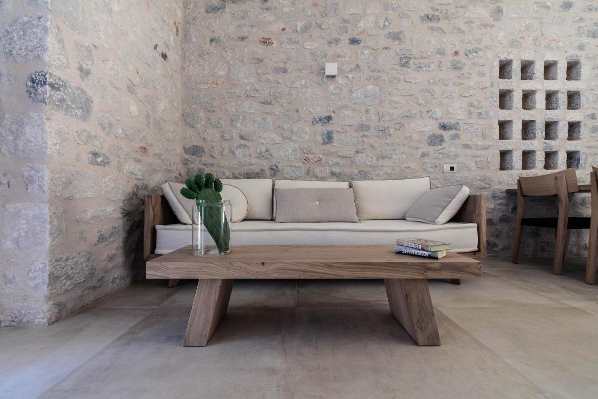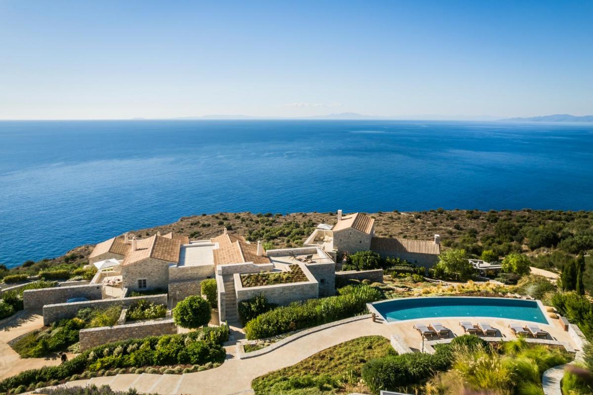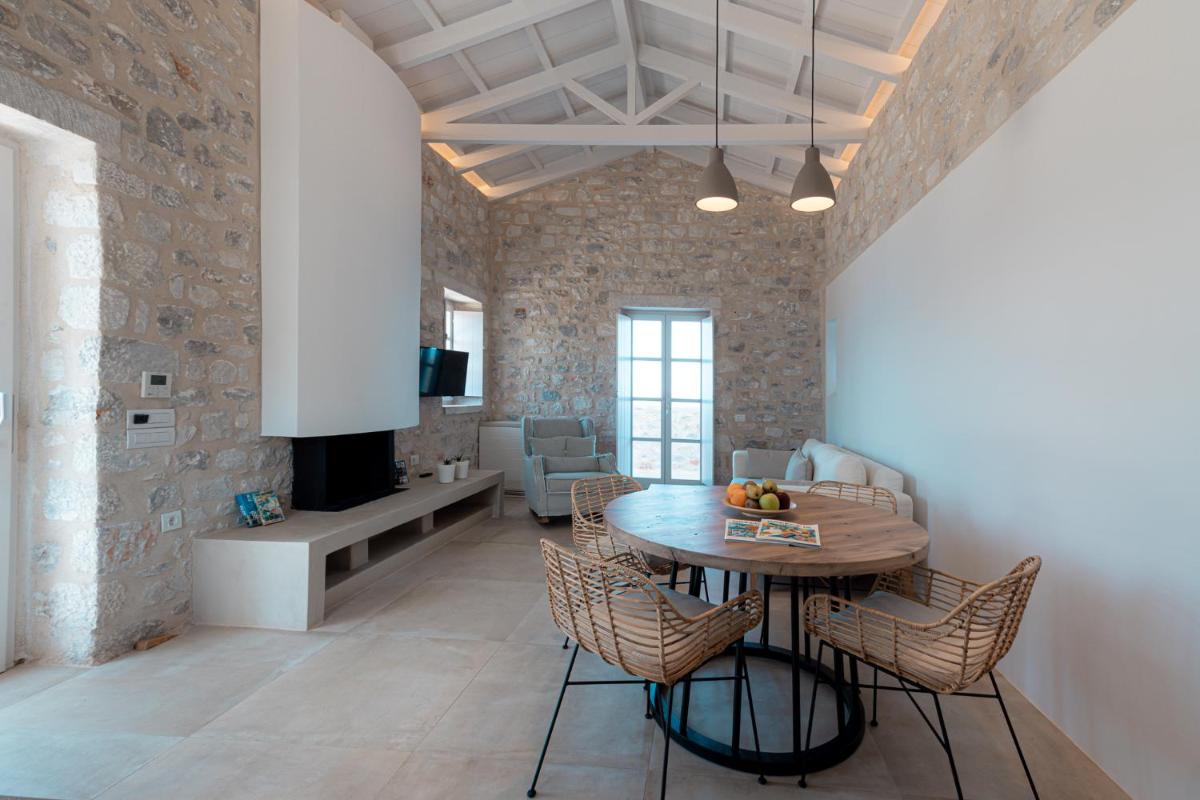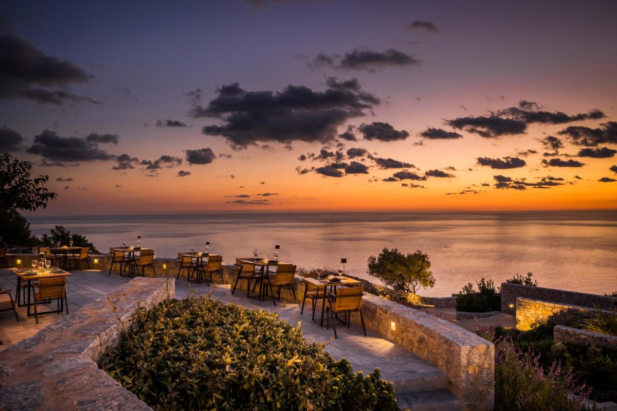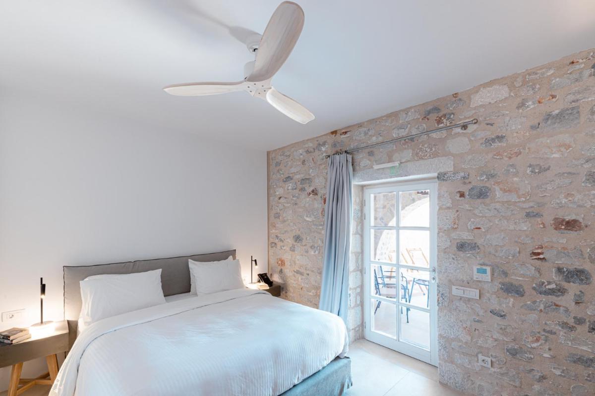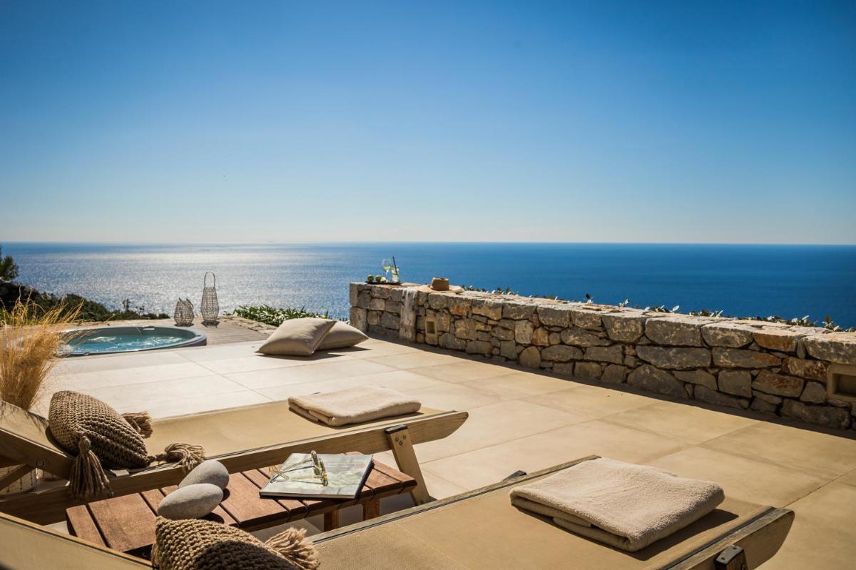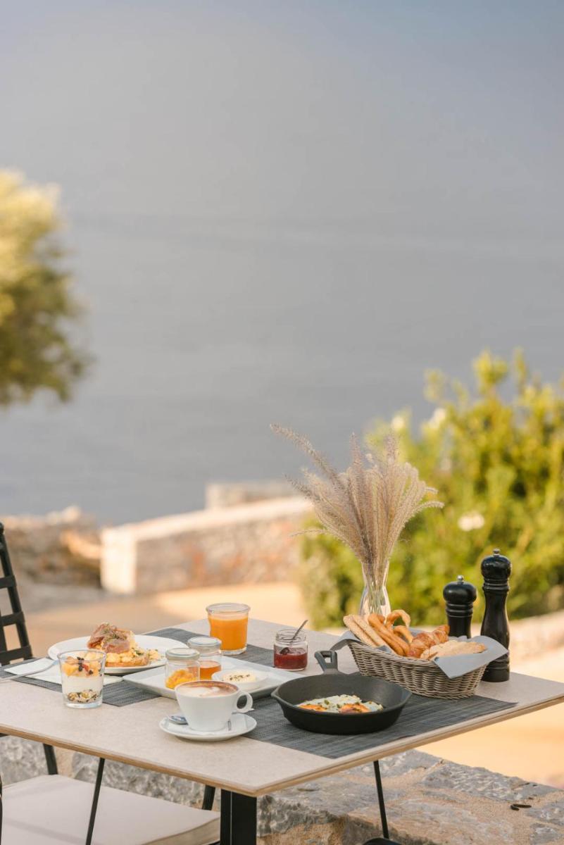 Die Struktur ist vollständig aus lokalem Stein gebaut und respektiert den Stil der Verteidigungstürme von Mani. Die Suiten sind geräumig, mit maßgefertigten Möbeln und luxuriösen Stoffen, und viele verfügen über private Terrassen mit Meerblick.