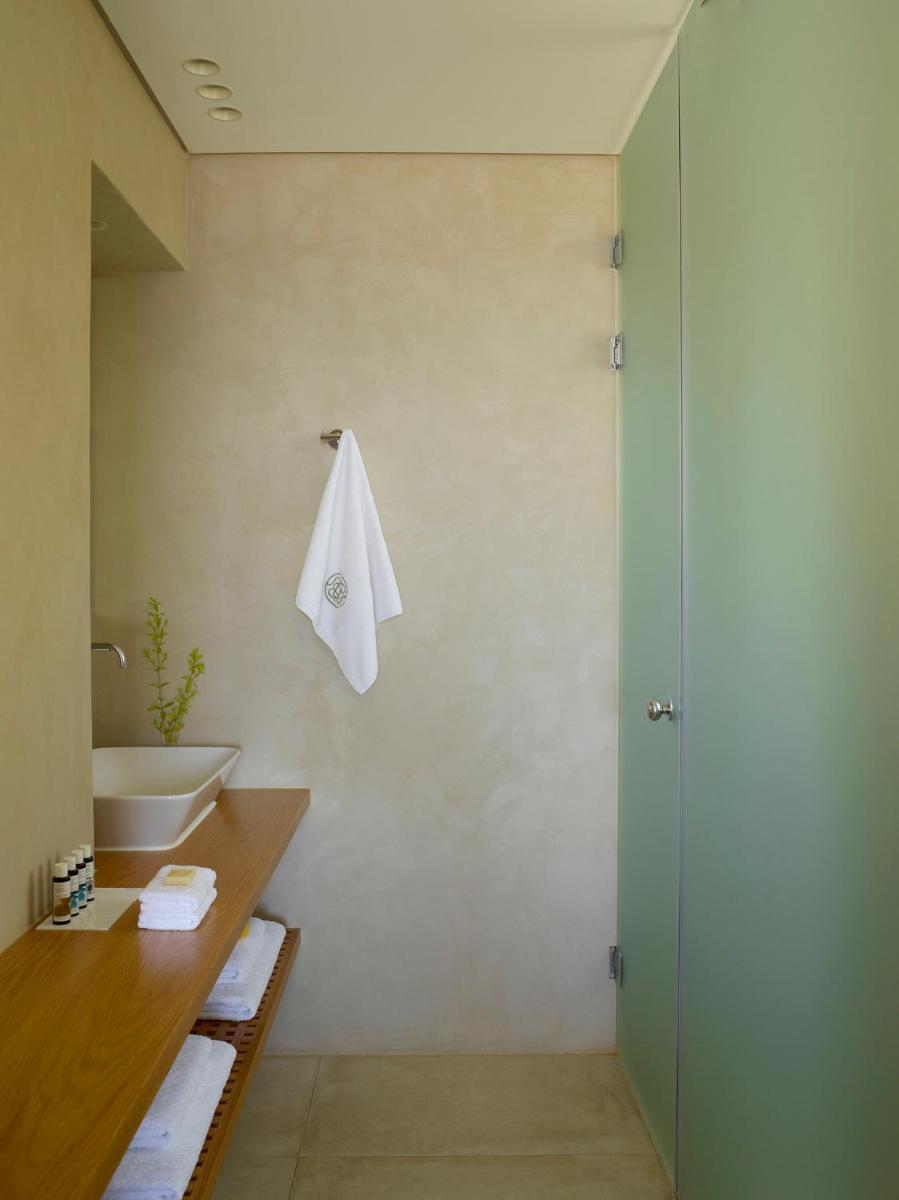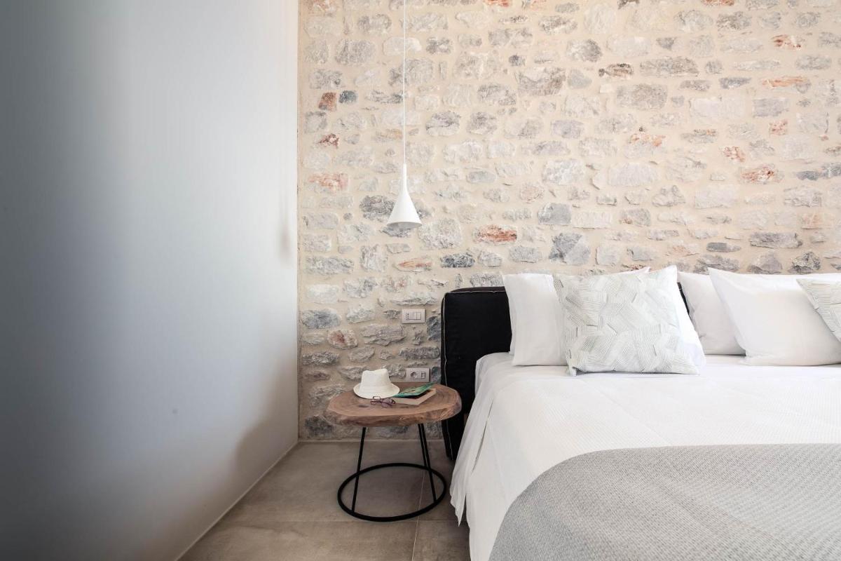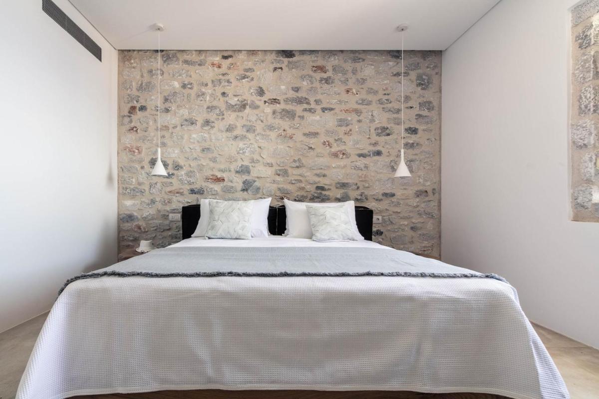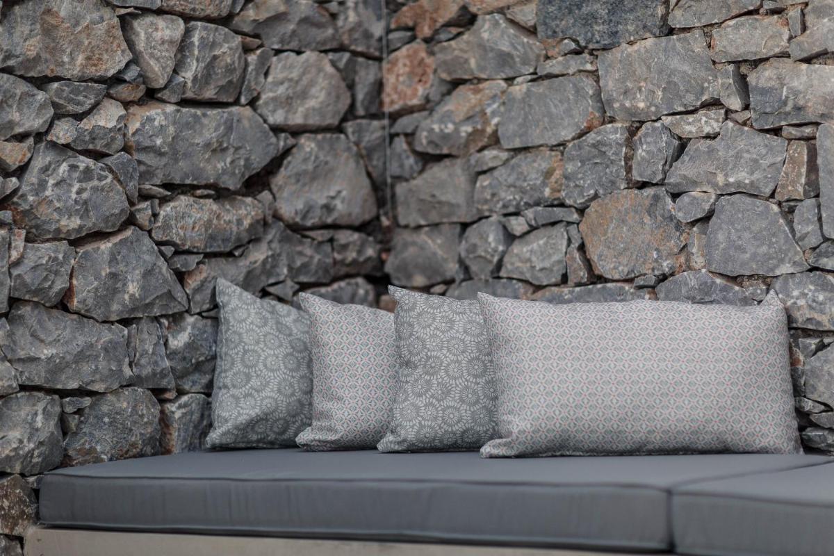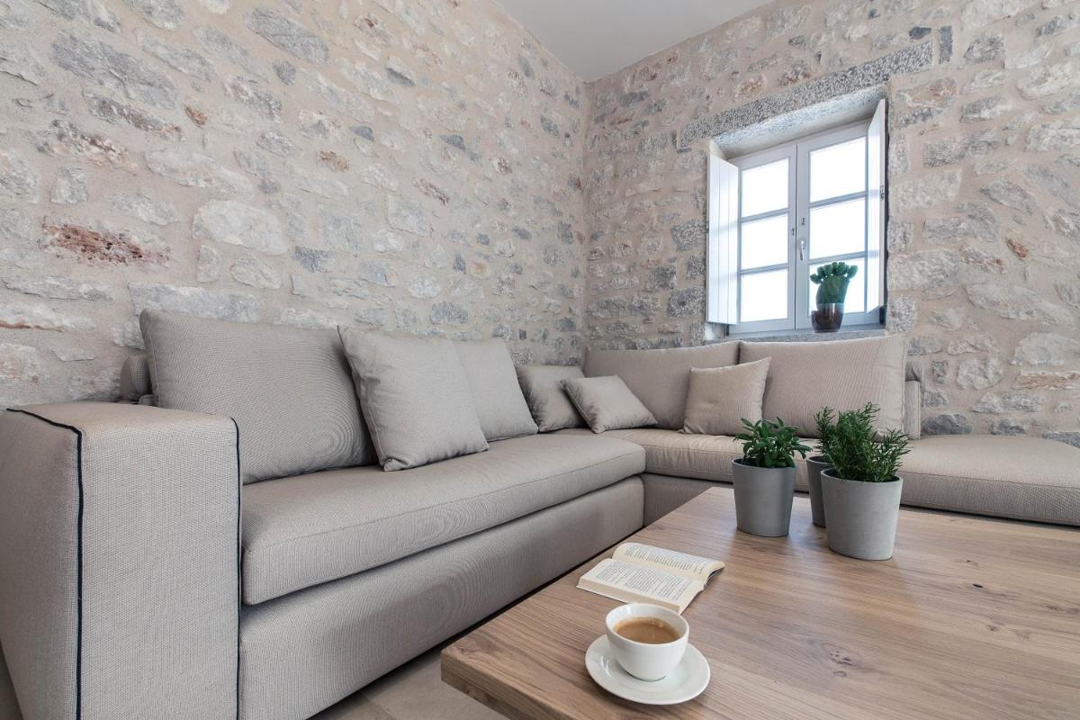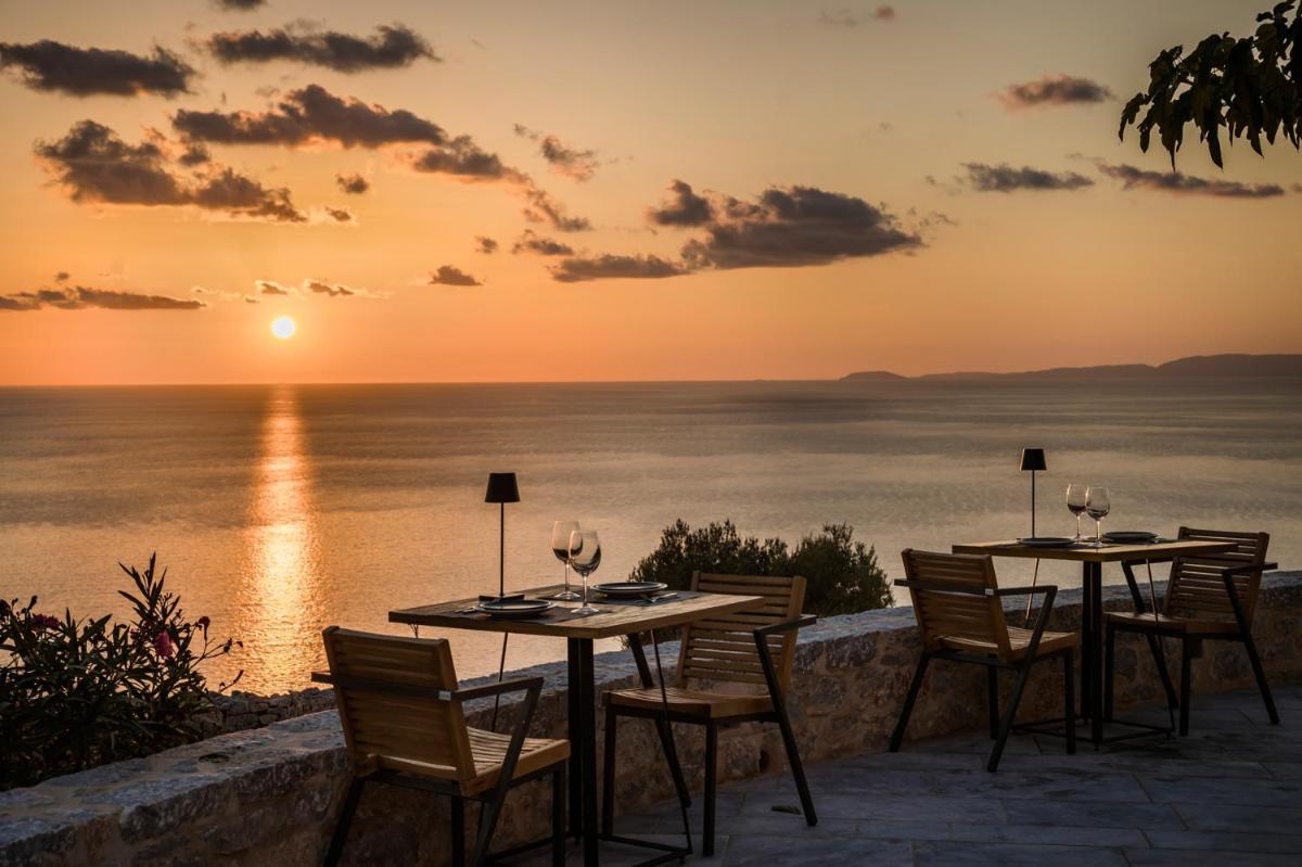 Die Struktur ist vollständig aus lokalem Stein gebaut und respektiert den Stil der Verteidigungstürme von Mani. Die Suiten sind geräumig, mit maßgefertigten Möbeln und luxuriösen Stoffen, und viele verfügen über private Terrassen mit Meerblick.