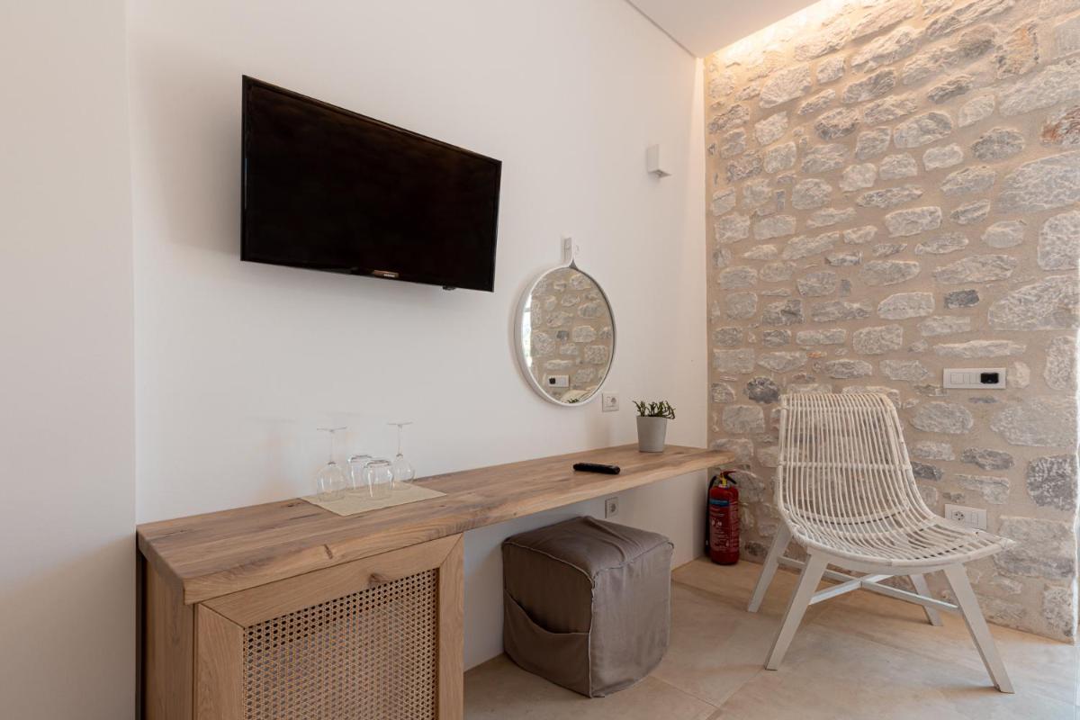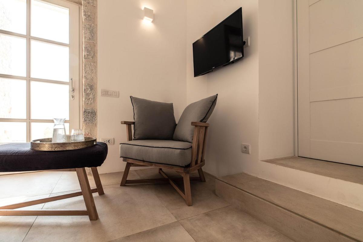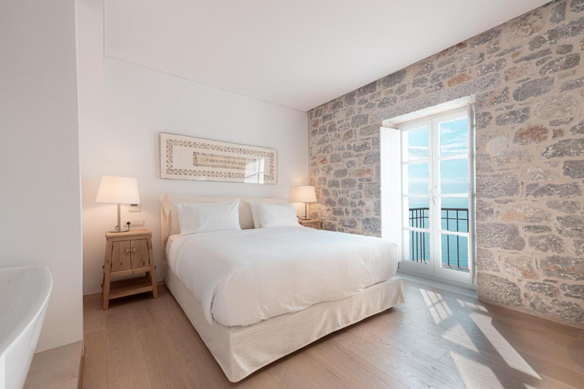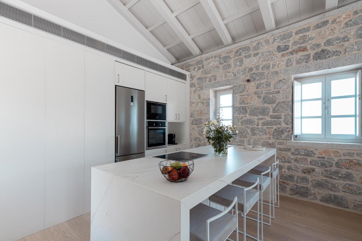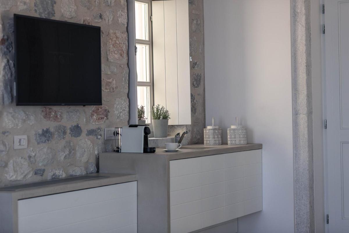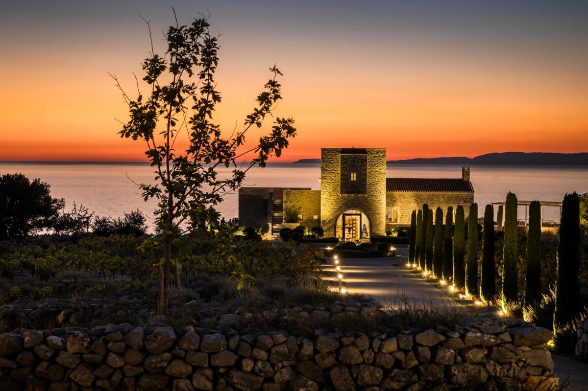 Die Struktur ist vollständig aus lokalem Stein gebaut und respektiert den Stil der Verteidigungstürme von Mani. Die Suiten sind geräumig, mit maßgefertigten Möbeln und luxuriösen Stoffen, und viele verfügen über private Terrassen mit Meerblick.