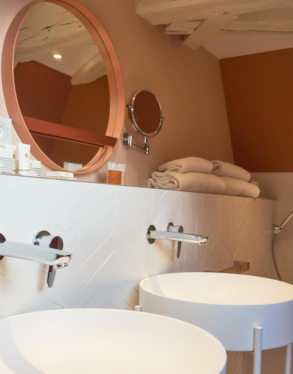 Die 24 Zimmer und Suiten sind modern und raffiniert eingerichtet, mit Akzenten, die das Thema Wein aufgreifen. Sie bieten exzellenten Komfort und, für einige, einen direkten Blick auf die umliegenden Weinberge. Die Atmosphäre ist intim und der Erholung gewidmet, so dass die Gäste die Ruhe des Weindorfes genießen können.