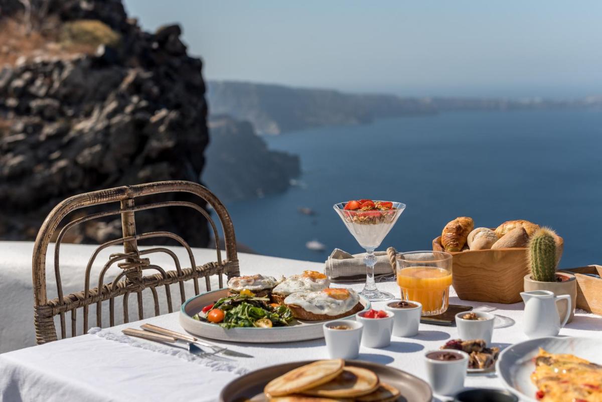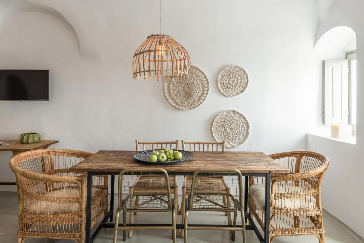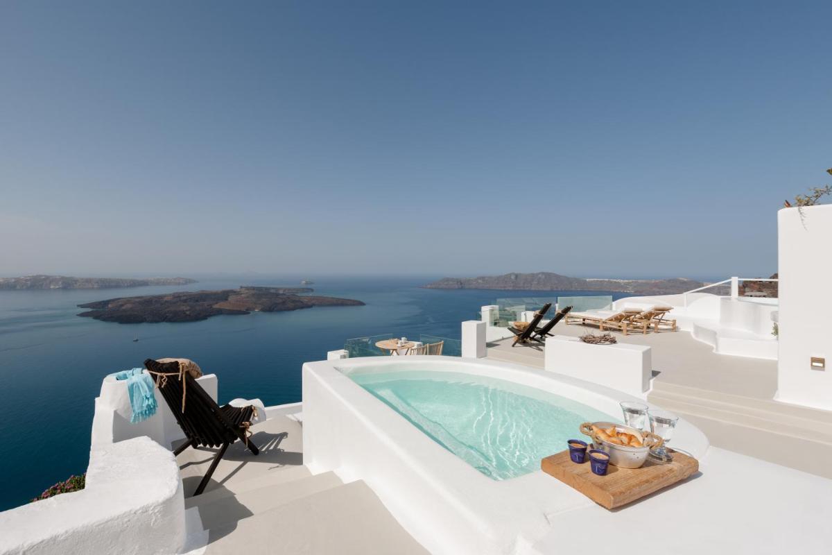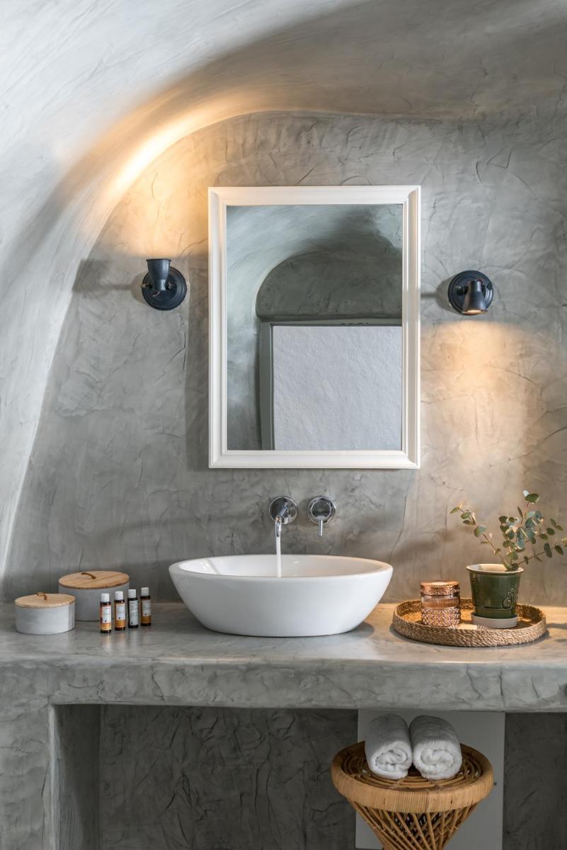 Die Suiten sind wahre Luxusnester, jede einzigartig in ihrem Design, mit der charakteristischen Höhlenstruktur, die die Innenräume kühl hält. Die meisten Unterkünfte verfügen über eine große private Terrasse mit einem Außen-Whirlpool oder einem kleinen Tauchbecken, die direkt auf die majestätische Caldera blicken. Die Einrichtung ist essentiell, aber raffiniert, mit eingebauten Betten und Farbakzenten, die die Reinheit des kykladischen Weiß hervorheben.