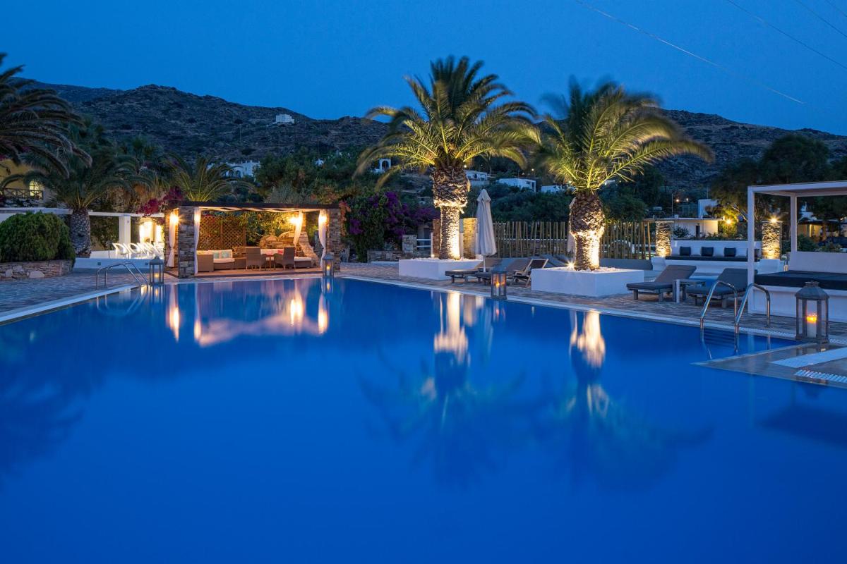 Die Lage des Resorts ist strategisch: Obwohl es direkt am Meer liegt, ist es nur eine kurze Entfernung (auch zu Fuß) von der Chora von Ios, dem pulsierenden Zentrum der Insel, entfernt. Dies ermöglicht den Gästen einen einfachen Zugang zum Nachtleben und den Geschäften, wodurch die Tagesentspannung mit abendlicher Unterhaltung ausgeglichen wird. Wassersport und Freizeitaktivitäten sind auch am angrenzenden Strand verfügbar.