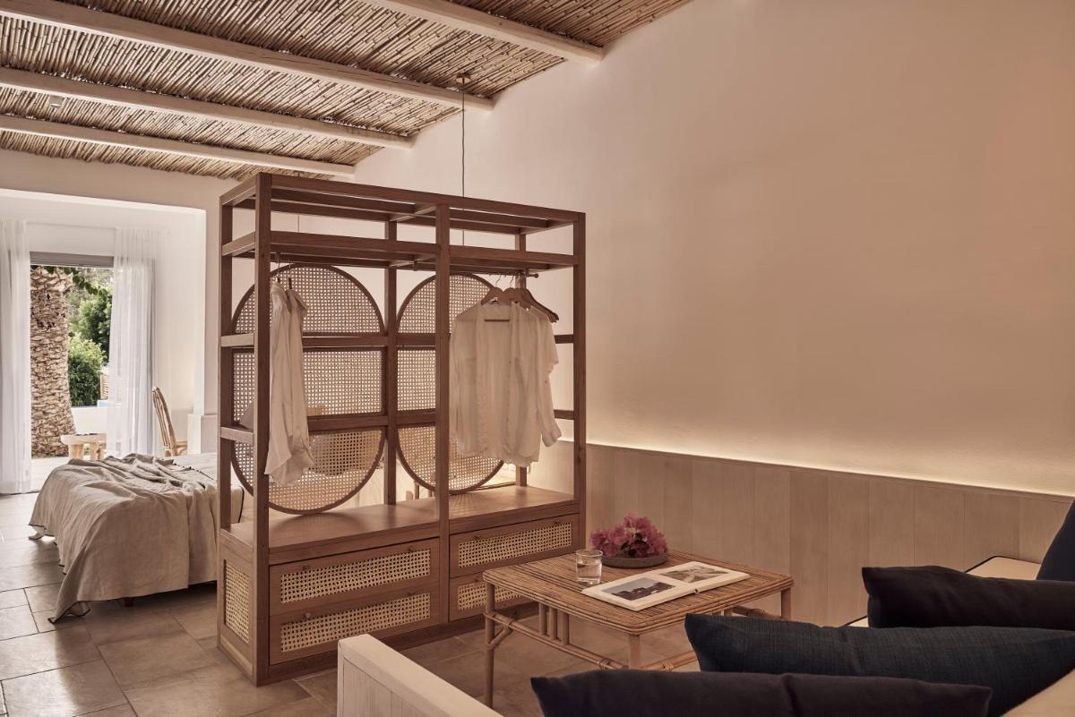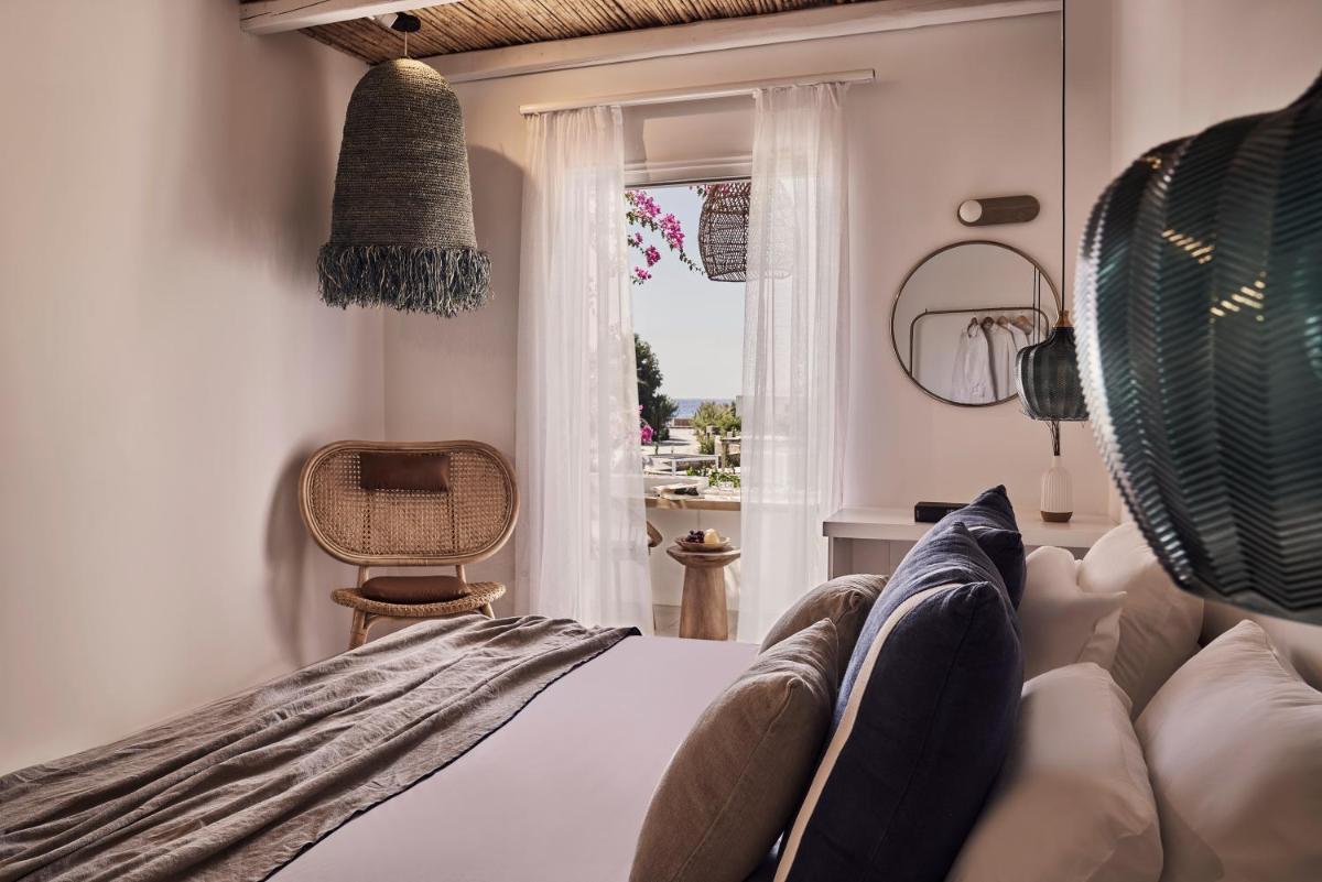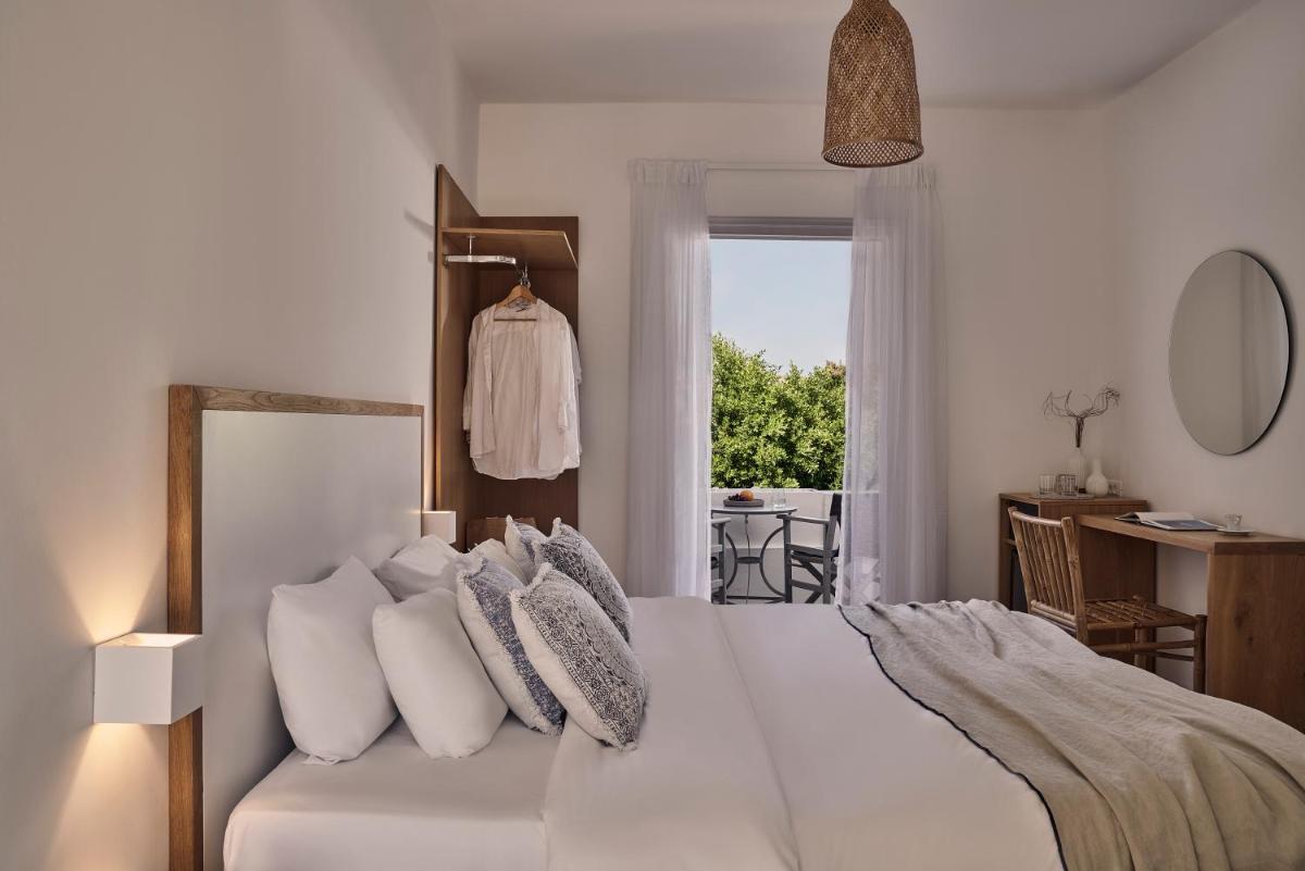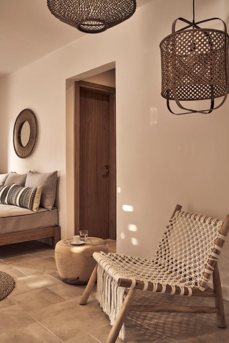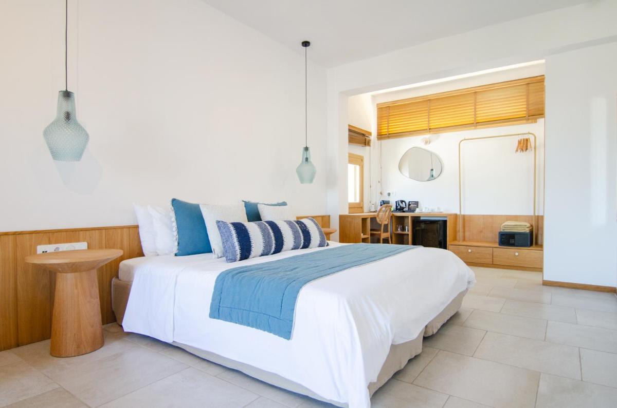 Die Unterkünfte sind im modernen kykladischen Stil gestaltet, gekennzeichnet durch klare Linien, helle Farben und natürliche Materialien. Viele der Zimmer und Suiten öffnen sich auf private Balkone oder Terrassen, die einen direkten und atemberaubenden Blick auf die Mylopotas Bucht bieten. Komfort wird durch hochwertige Möbel und akribische Liebe zum Detail gewährleistet, was eine erholsame Nachtruhe garantiert.