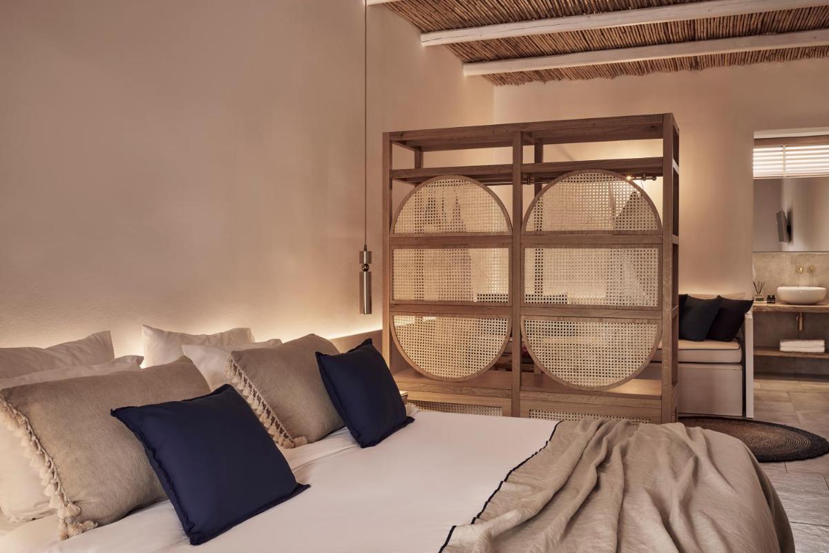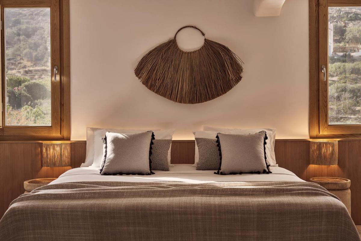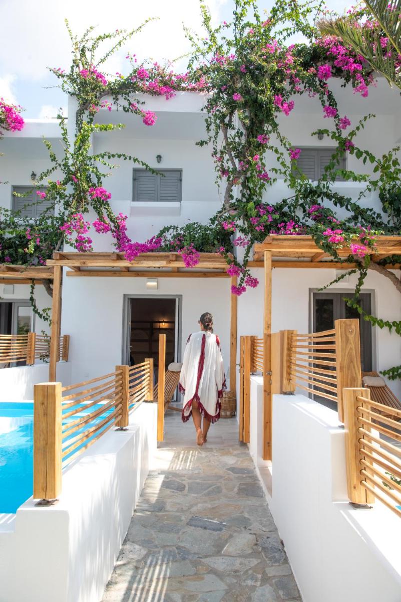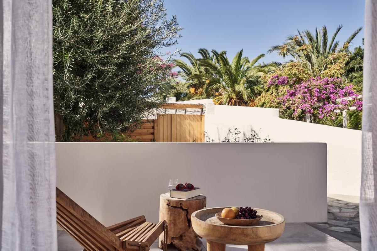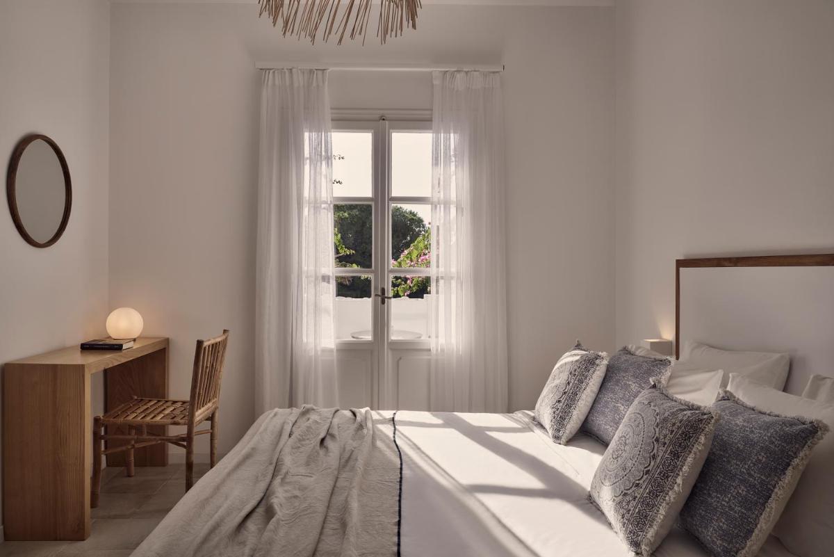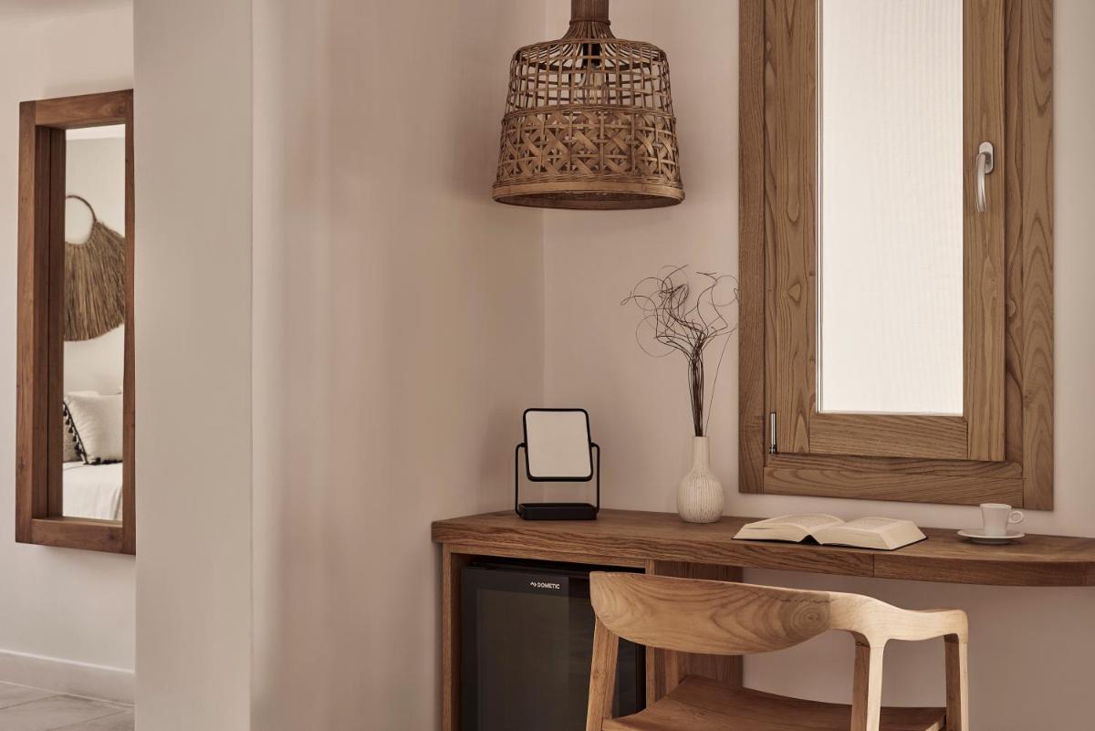 Die Unterkünfte sind im modernen kykladischen Stil gestaltet, gekennzeichnet durch klare Linien, helle Farben und natürliche Materialien. Viele der Zimmer und Suiten öffnen sich auf private Balkone oder Terrassen, die einen direkten und atemberaubenden Blick auf die Mylopotas Bucht bieten. Komfort wird durch hochwertige Möbel und akribische Liebe zum Detail gewährleistet, was eine erholsame Nachtruhe garantiert.