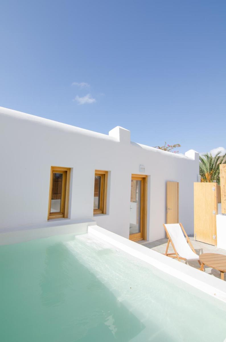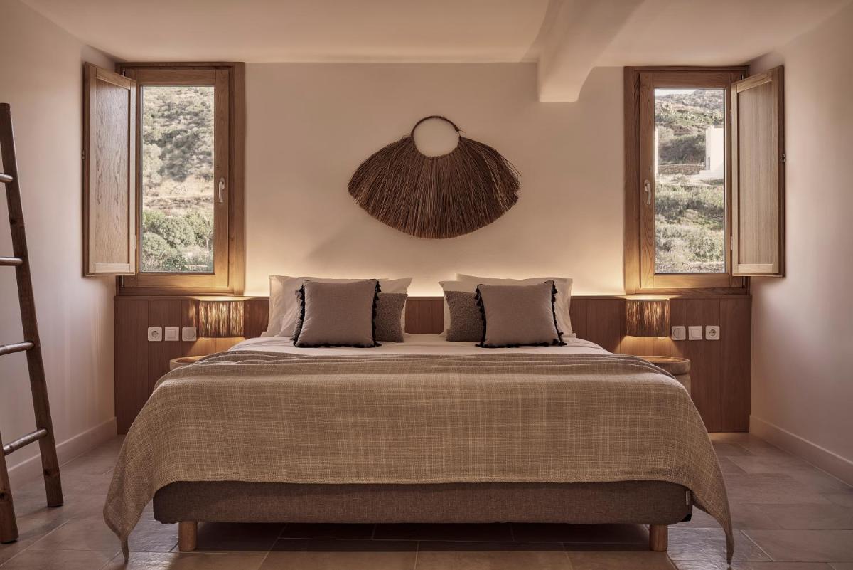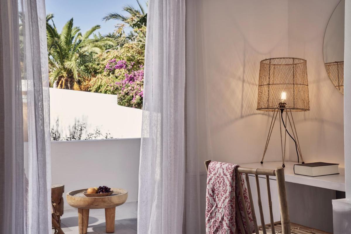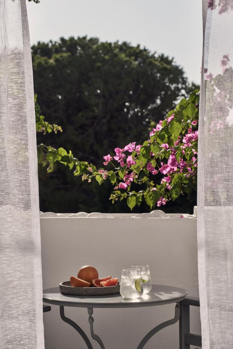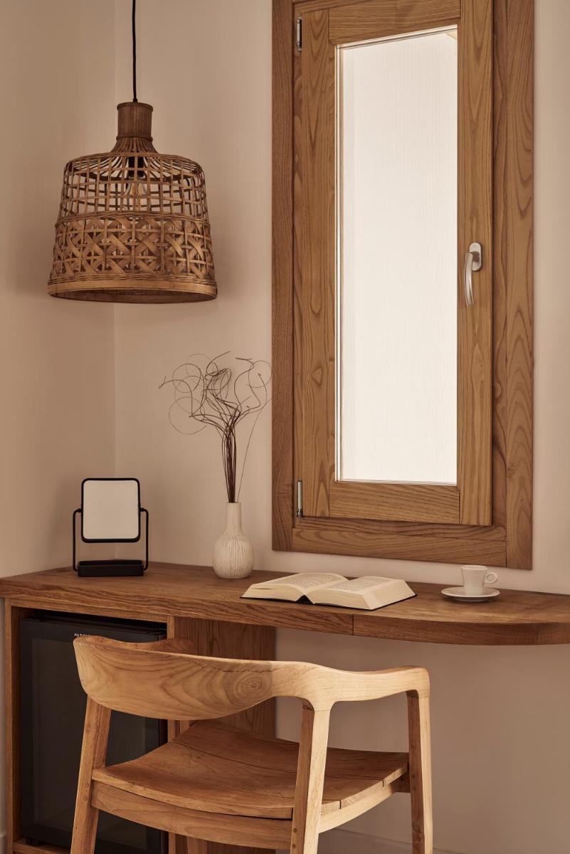 Die Unterkünfte sind im modernen kykladischen Stil gestaltet, gekennzeichnet durch klare Linien, helle Farben und natürliche Materialien. Viele der Zimmer und Suiten öffnen sich auf private Balkone oder Terrassen, die einen direkten und atemberaubenden Blick auf die Mylopotas Bucht bieten. Komfort wird durch hochwertige Möbel und akribische Liebe zum Detail gewährleistet, was eine erholsame Nachtruhe garantiert.