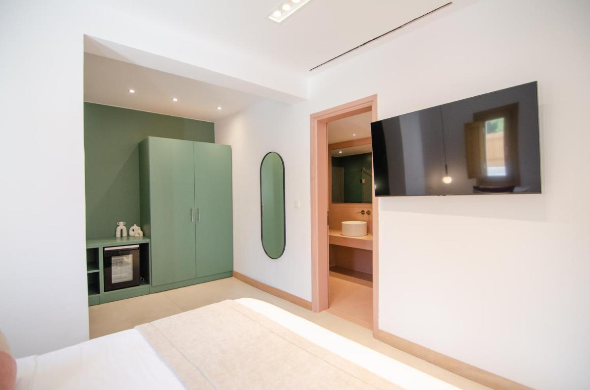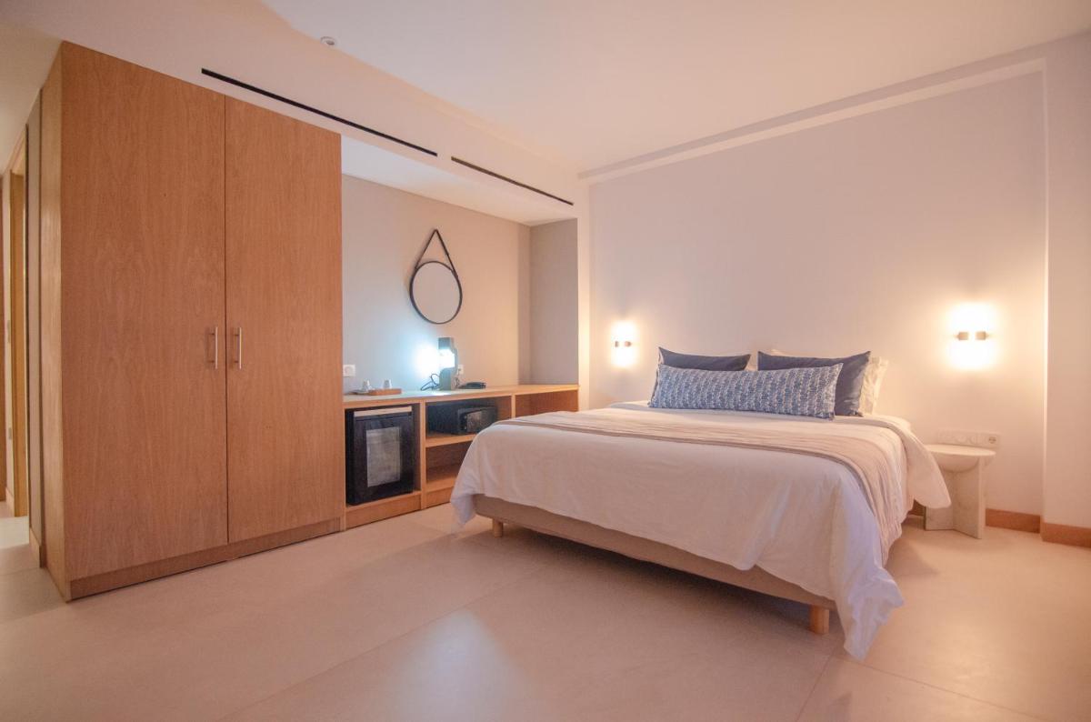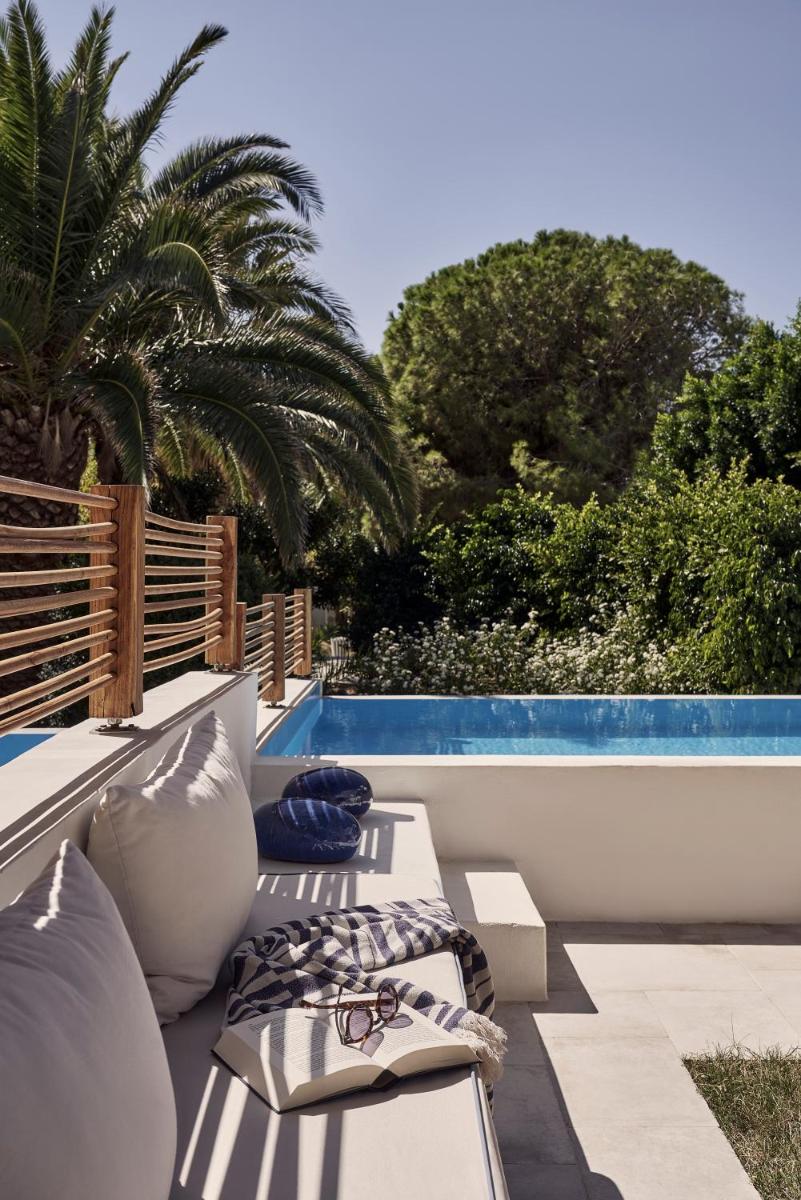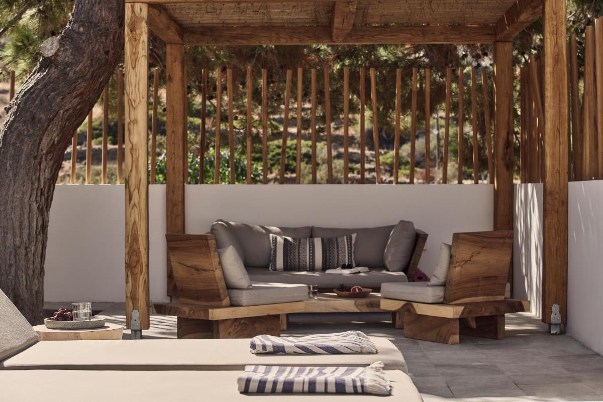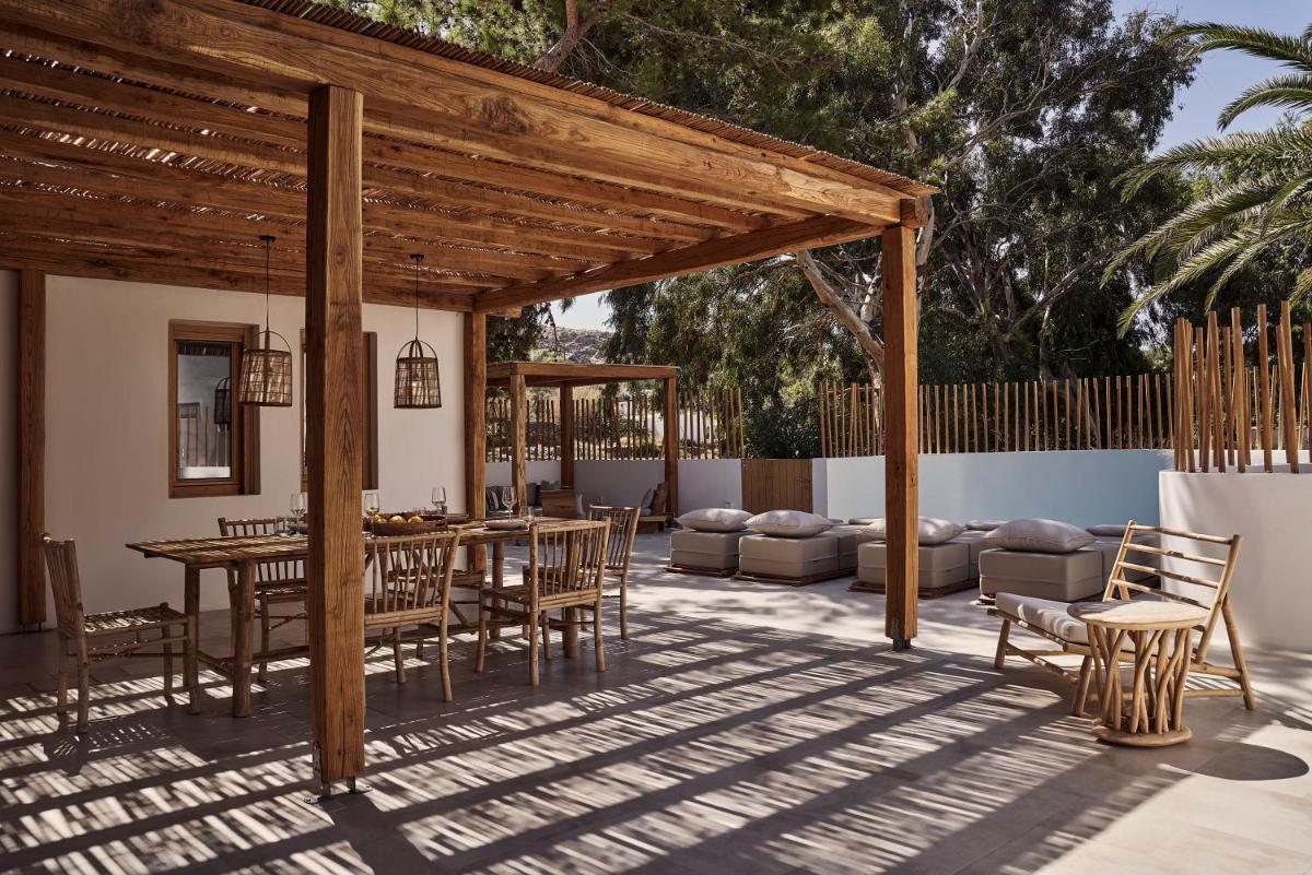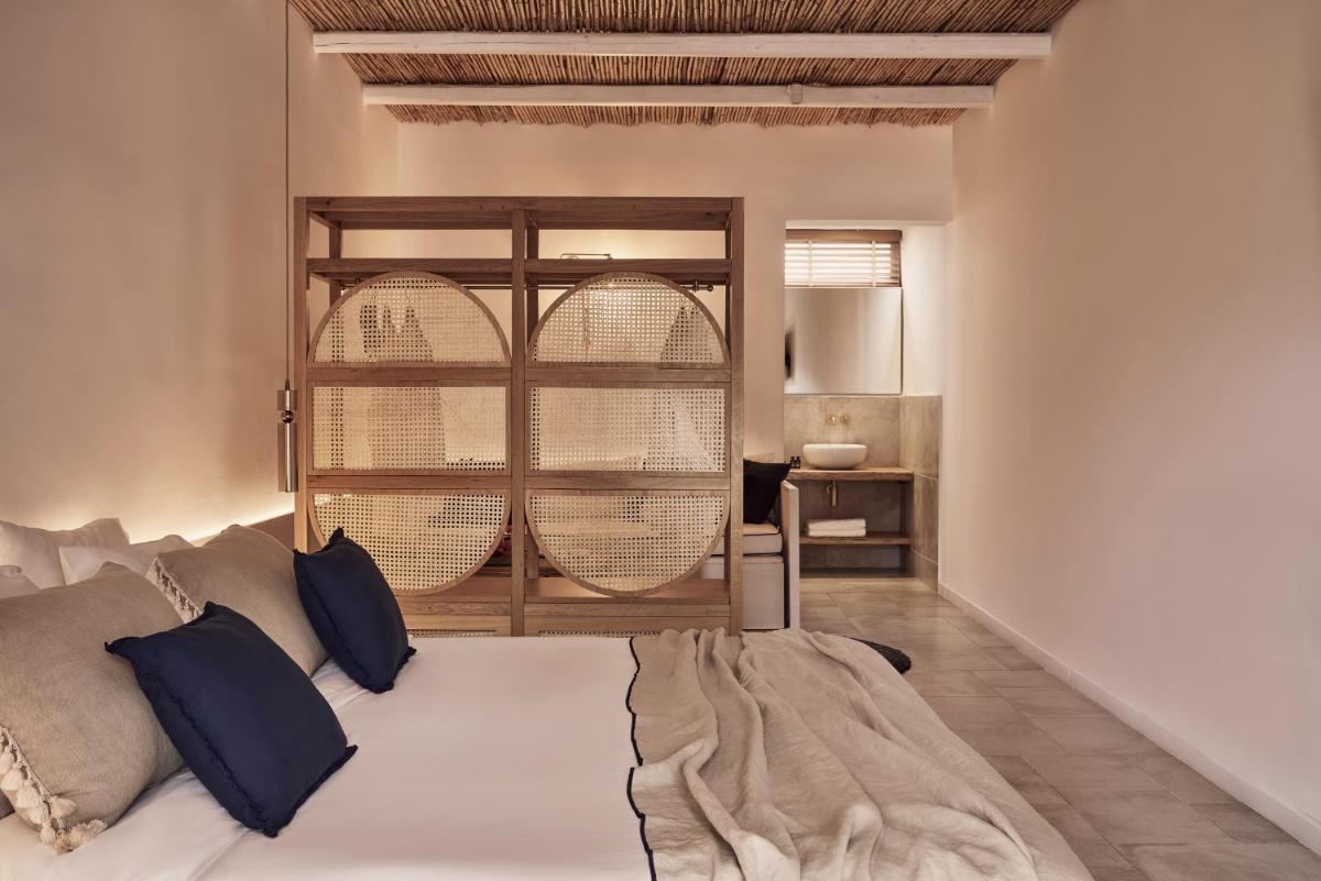 Die Unterkünfte sind im modernen kykladischen Stil gestaltet, gekennzeichnet durch klare Linien, helle Farben und natürliche Materialien. Viele der Zimmer und Suiten öffnen sich auf private Balkone oder Terrassen, die einen direkten und atemberaubenden Blick auf die Mylopotas Bucht bieten. Komfort wird durch hochwertige Möbel und akribische Liebe zum Detail gewährleistet, was eine erholsame Nachtruhe garantiert.