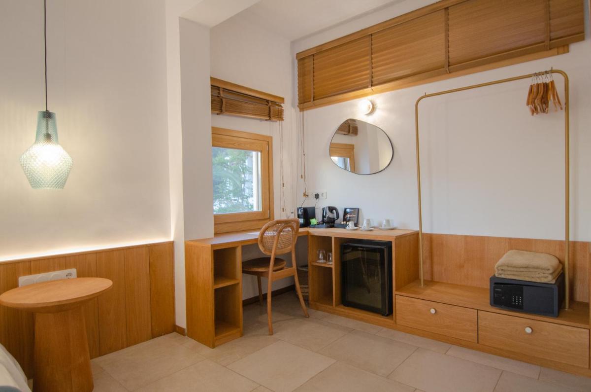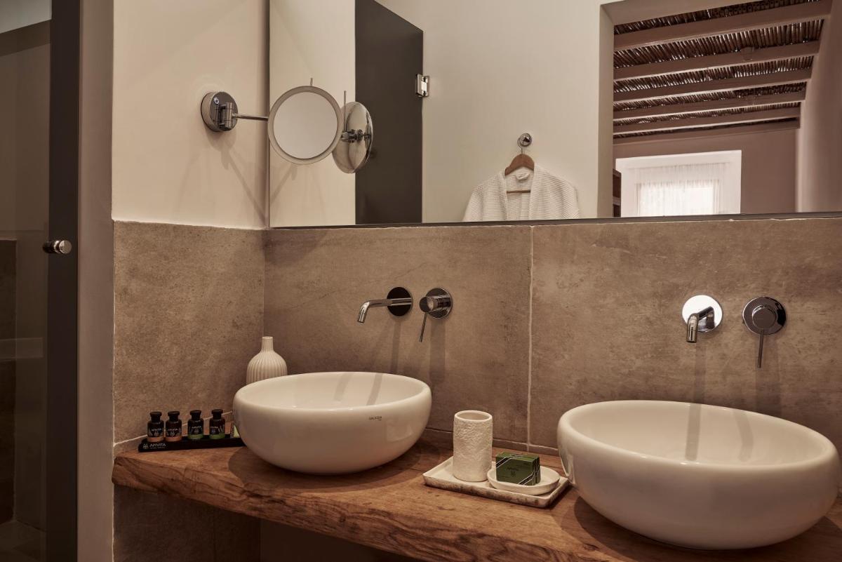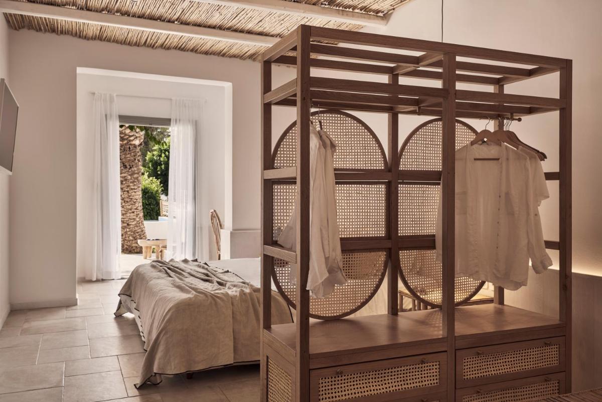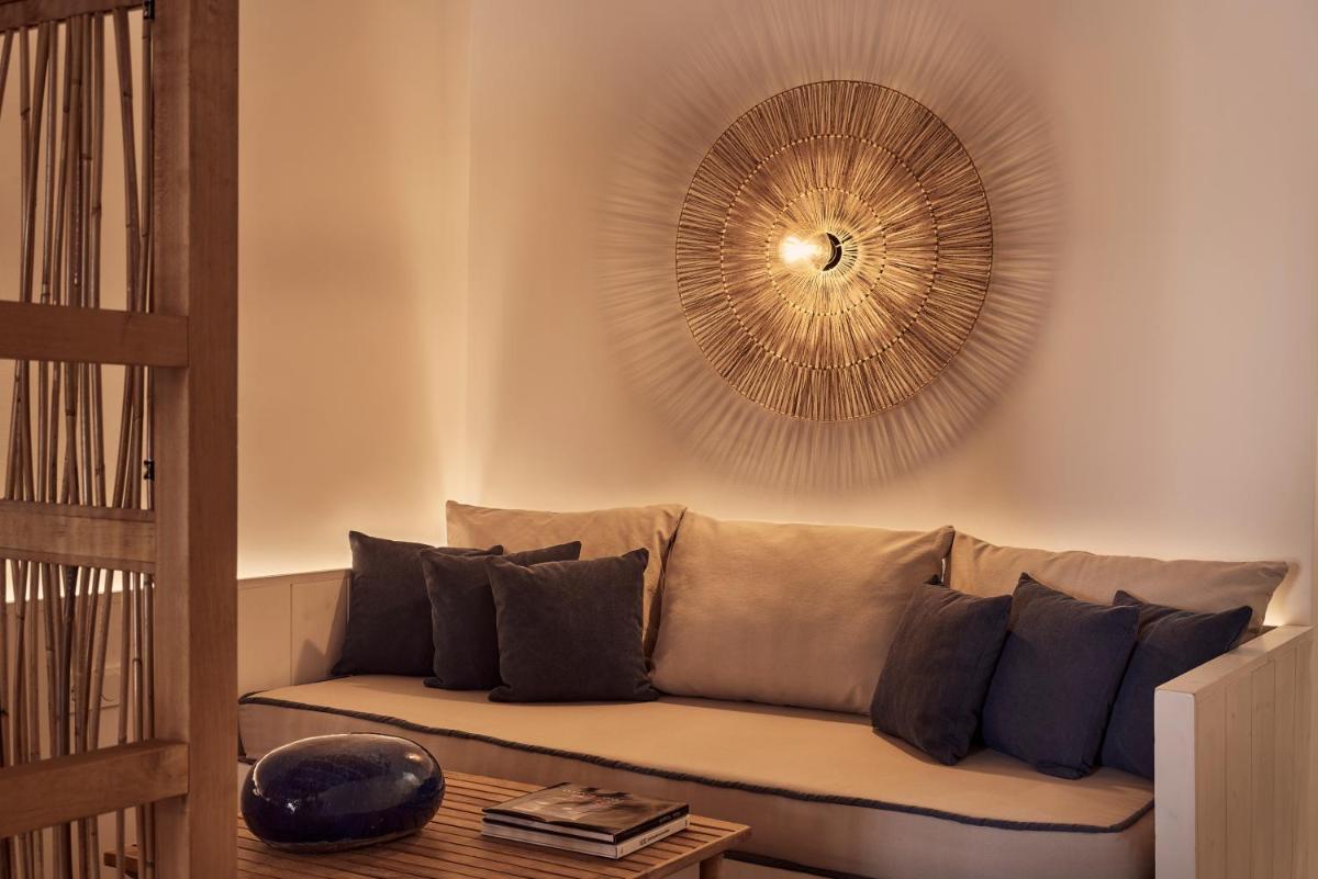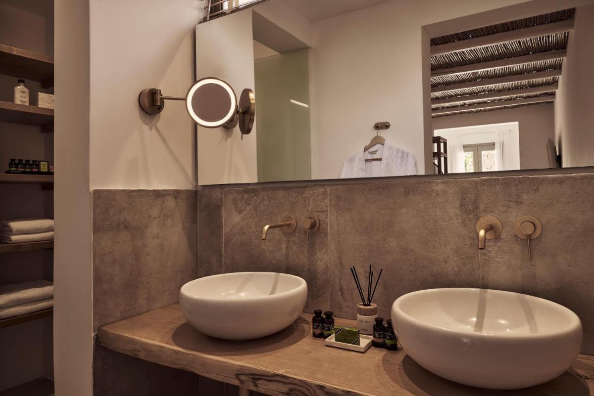 Die Unterkünfte sind im modernen kykladischen Stil gestaltet, gekennzeichnet durch klare Linien, helle Farben und natürliche Materialien. Viele der Zimmer und Suiten öffnen sich auf private Balkone oder Terrassen, die einen direkten und atemberaubenden Blick auf die Mylopotas Bucht bieten. Komfort wird durch hochwertige Möbel und akribische Liebe zum Detail gewährleistet, was eine erholsame Nachtruhe garantiert.