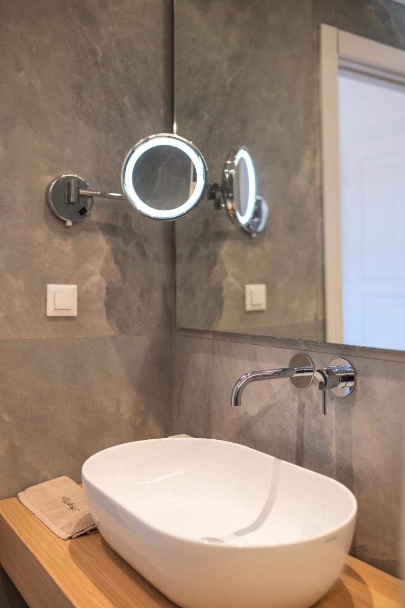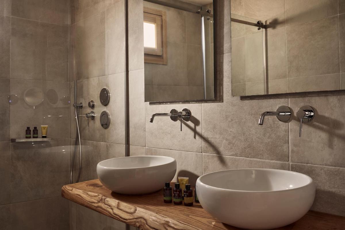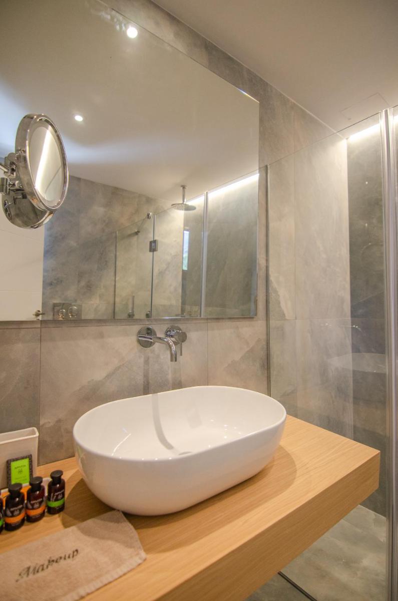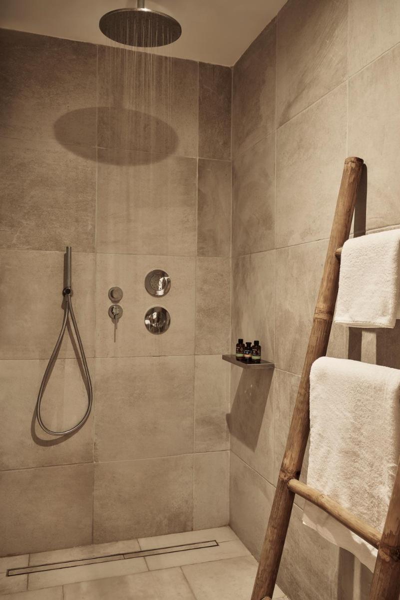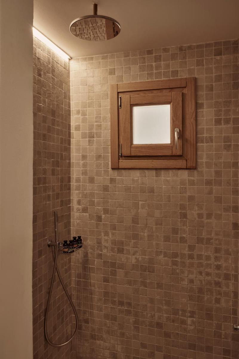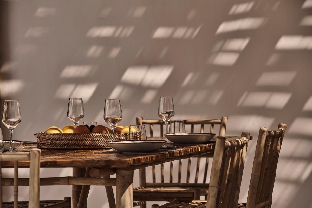 Die Unterkünfte sind im modernen kykladischen Stil gestaltet, gekennzeichnet durch klare Linien, helle Farben und natürliche Materialien. Viele der Zimmer und Suiten öffnen sich auf private Balkone oder Terrassen, die einen direkten und atemberaubenden Blick auf die Mylopotas Bucht bieten. Komfort wird durch hochwertige Möbel und akribische Liebe zum Detail gewährleistet, was eine erholsame Nachtruhe garantiert.