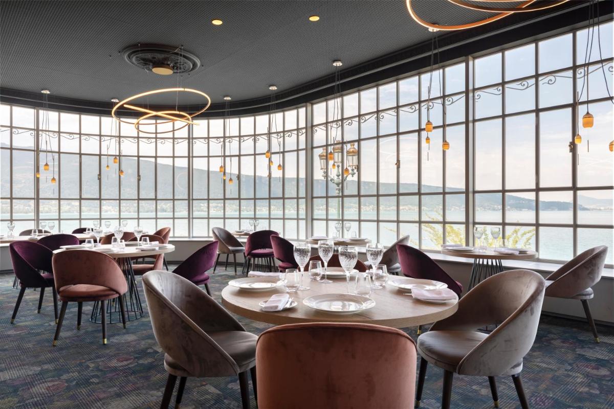 Das Gourmetrestaurant des Hotels bietet eine raffinierte Küche, die die Aromen der Alpenregion und Savoyens feiert, oft mit einem zeitgenössischen Touch. Die Gäste können außergewöhnliche Gerichte in eleganten Speisesälen oder auf der Panoramaterrasse mit Blick auf den See genießen, was jede Mahlzeit zu einem unvergesslichen Erlebnis macht.