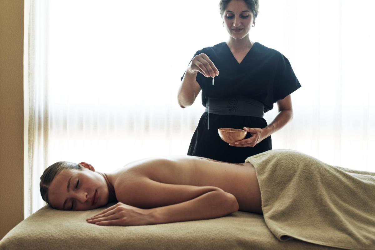 Das Ikaros Spa ist ein Wellness-Heiligtum, das eine breite Palette an Behandlungen und Ritualen bietet, inspiriert von alten kretischen und asiatischen Methoden. Es verfügt über einen beheizten Innenpool, Hamam, Sauna und Behandlungsräume für Paare. Die Umgebung ist darauf ausgelegt, einen tiefen Zustand der Entspannung zu induzieren, mit Fokus auf die Regeneration von Körper und Geist in einer ruhigen 'Adults Only'-Umgebung.
