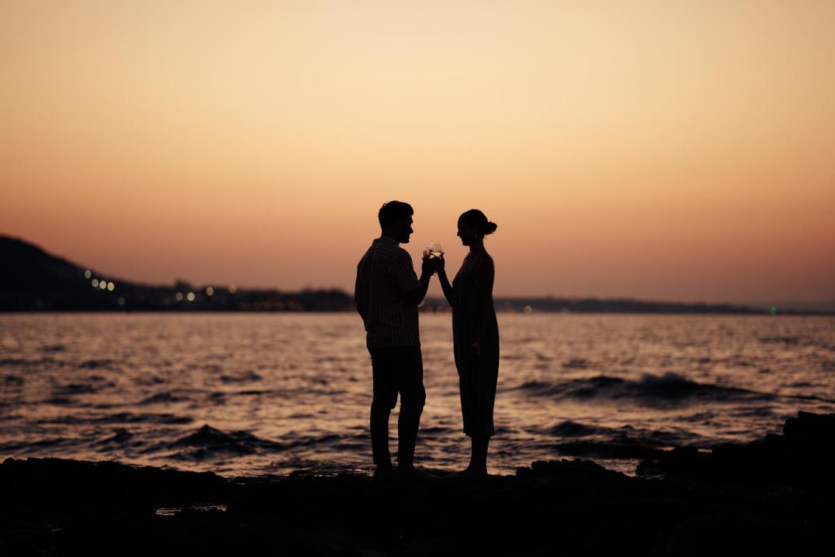 Die Lage in erster Reihe am Strand von Malia bietet sofortigen Zugang zu einem Abschnitt mit sandiger, gut gepflegter Küste. Gäste können den Strandservice mit reservierten Sonnenliegen und Sonnenschirmen genießen. Da es sich um ein 'Adults Only'-Resort handelt, garantiert es eine Atmosphäre der Ruhe und Gelassenheit, ideal für wahre Luxus-Entspannung.