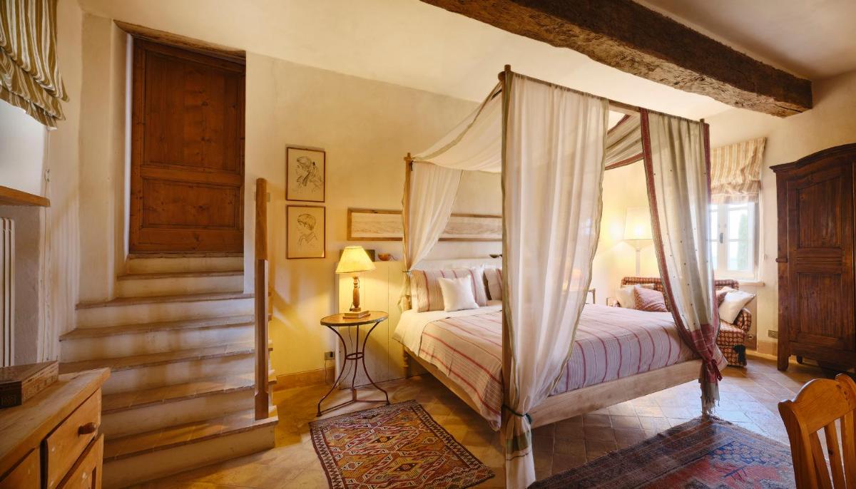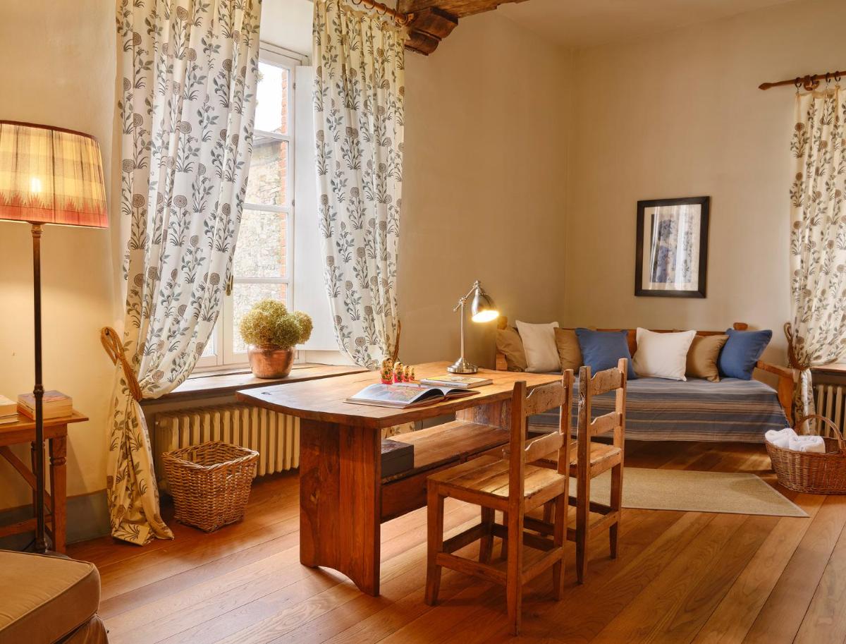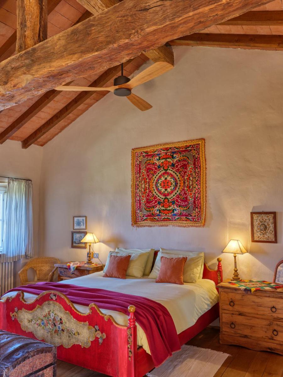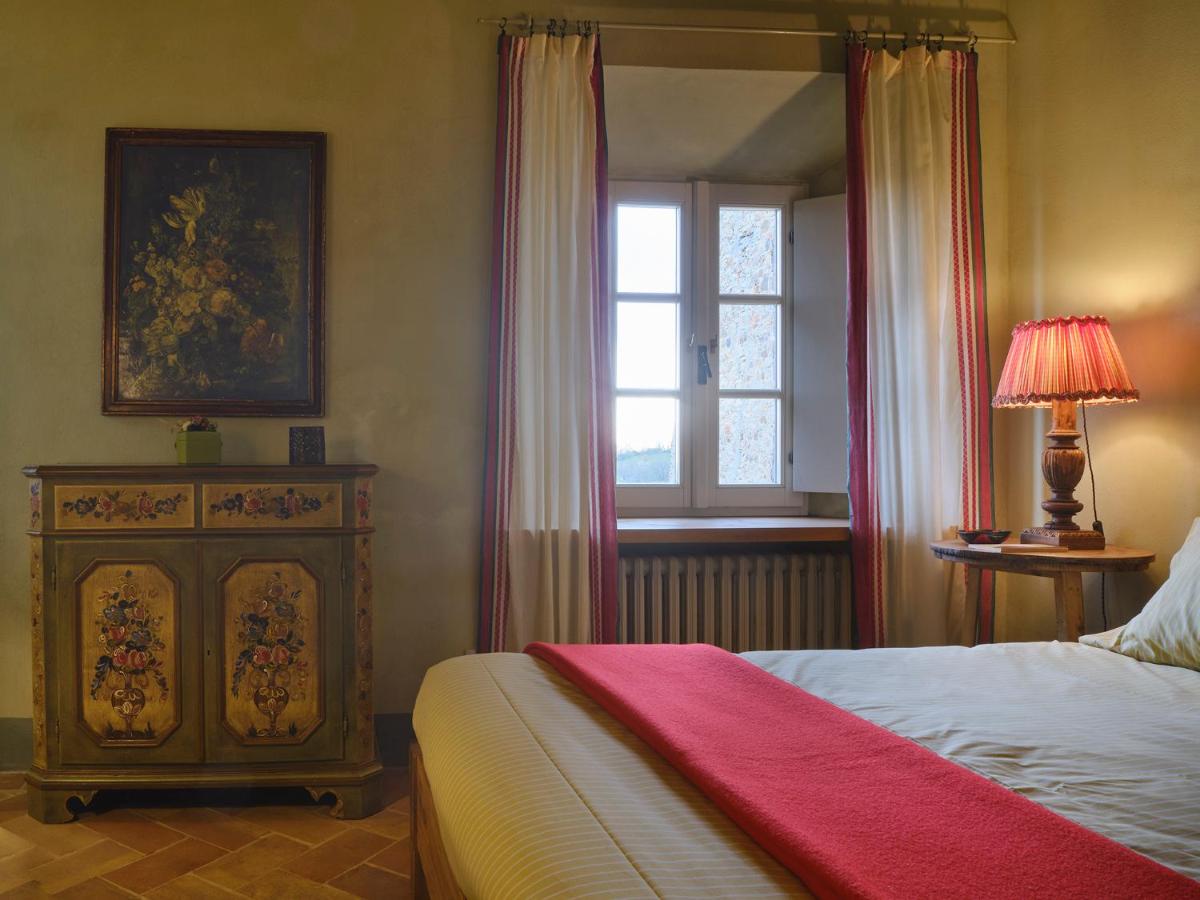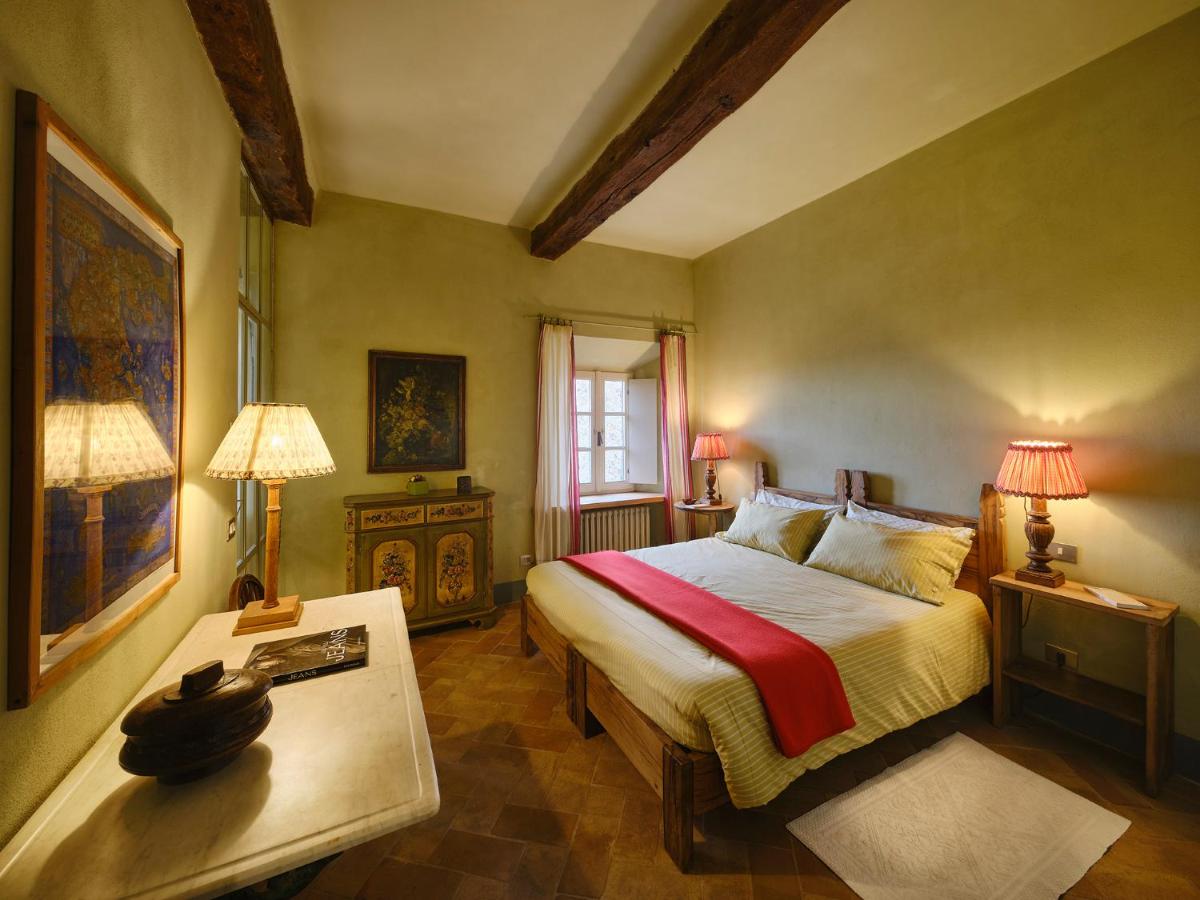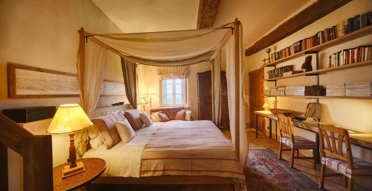 Das Castello verfügt über eine begrenzte Anzahl an Unterkünften (typischerweise 5 Zimmer und 2 Suiten, insgesamt 17 Gäste), was eine exklusive Atmosphäre gewährleistet. Die Zimmer und Suiten, individuell mit Geschmack und Raffinesse eingerichtet, kombinieren historische Details mit modernem Komfort. Alle Unterkünften sind geräumig, bieten Blick auf die umliegenden Hügel und sind mit Kostenlosem Wi-Fi und kostenlosen Wasserflaschen ausgestattet. Die Unterkunft konzentriert sich auf Entspannung und verzichtet auf invasive Technologien wie Fernseher im Zimmer (nur in Gemeinschaftsräumen auf Anfrage verfügbar).