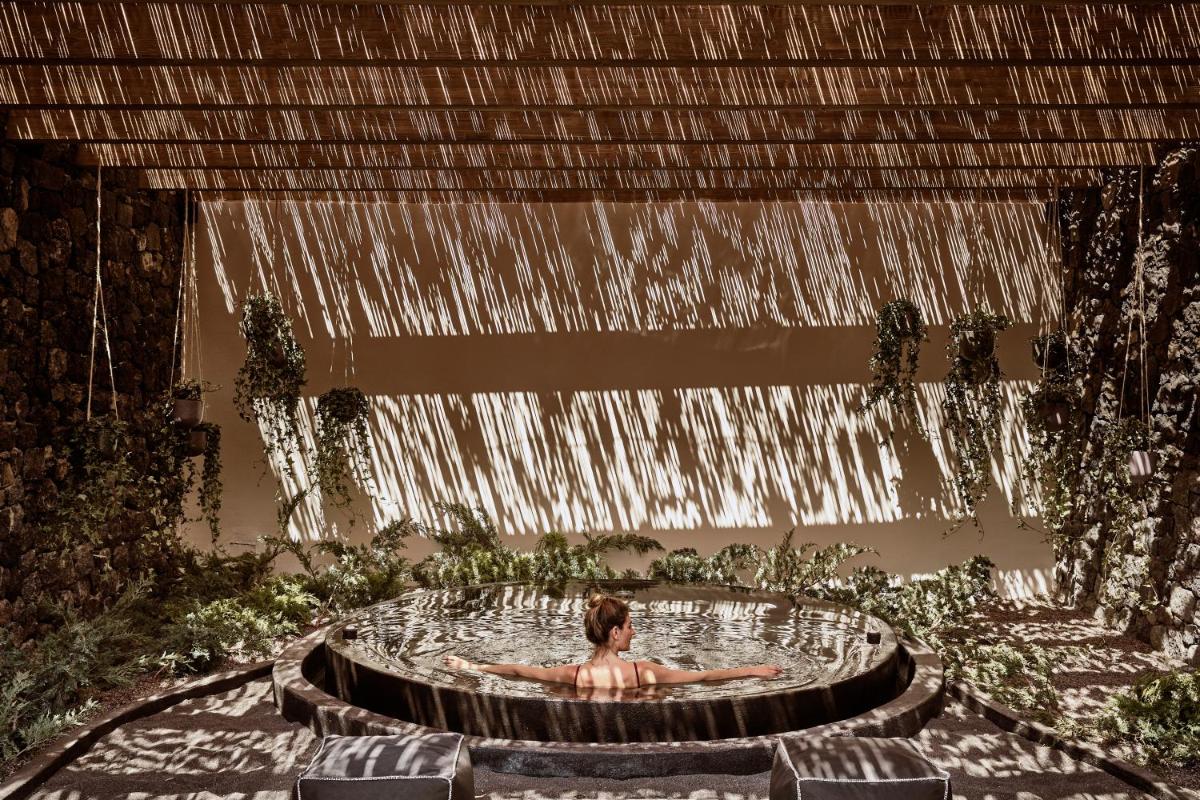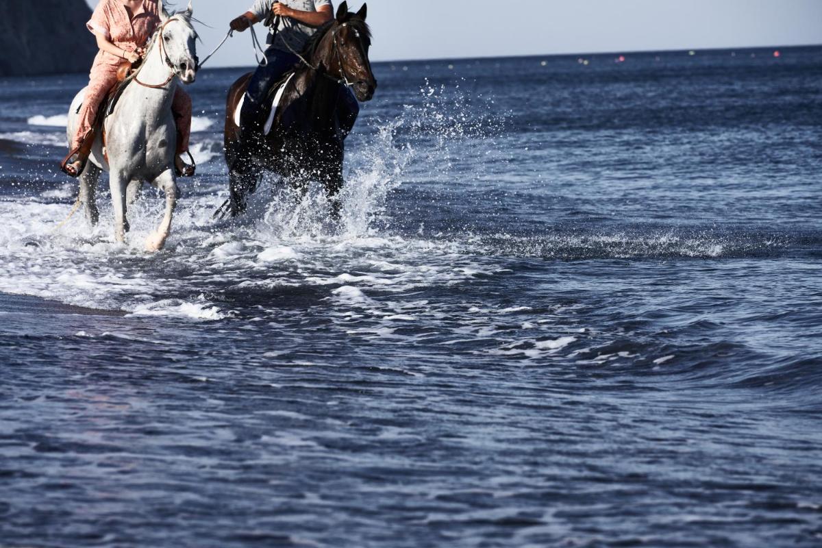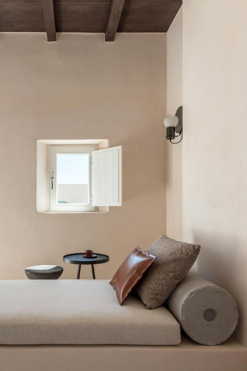 Das Hotel wurde an der Stelle alter Ställe erbaut, und das Design hält dieses Erbe lebendig, indem es es minimalistisch und anspruchsvoll neu interpretiert. Die 12 Suiten wurden mit lokalen Materialien wie schwarzem Vulkangestein und Holz gefertigt, was eine elegante und erdige Atmosphäre schafft, die in starkem Kontrast zum tiefen Blau der Ägäis steht.
