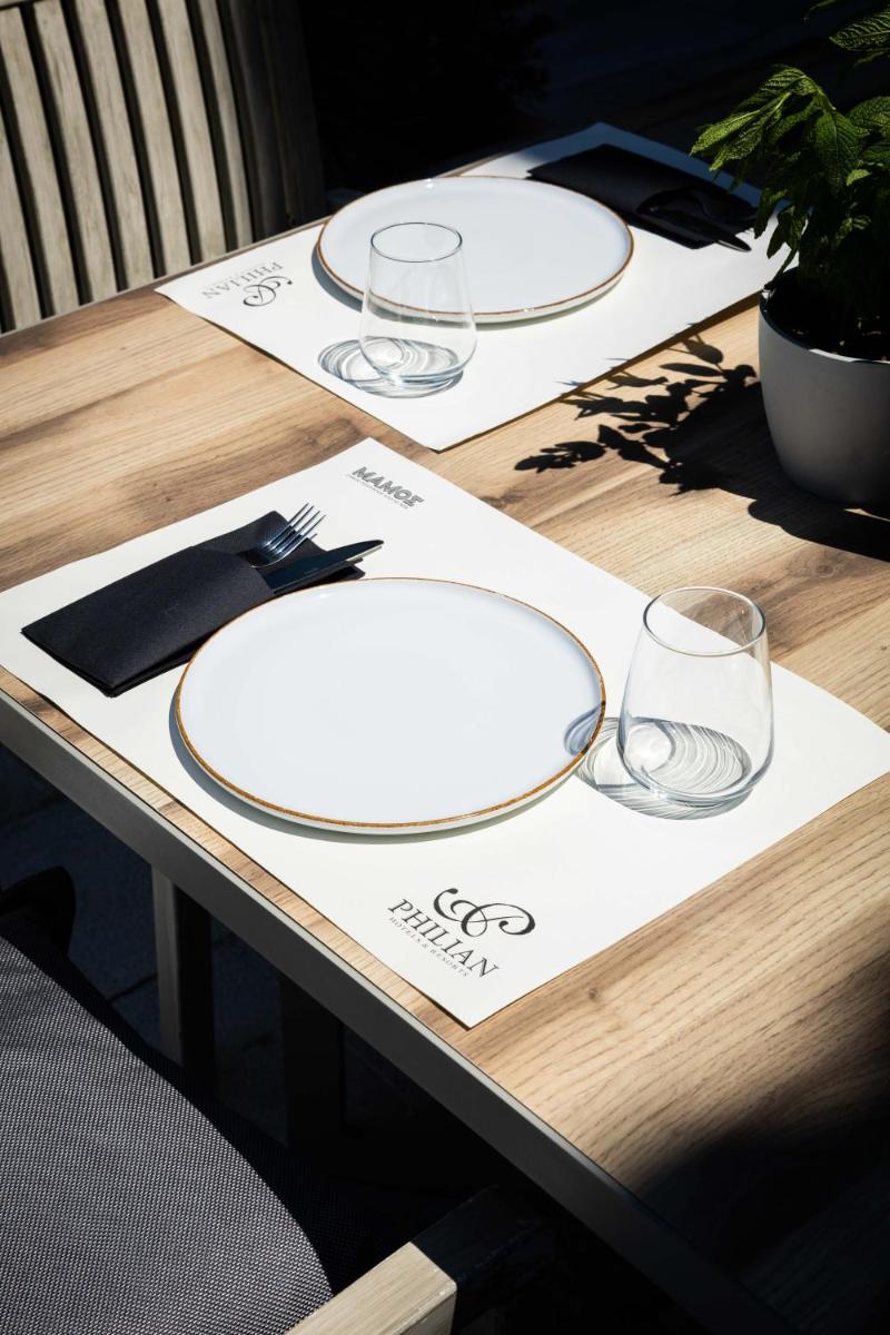 Das Gourmet-Restaurant des Hotels bietet eine Küche, die auf mediterranen und griechischen Aromen basiert, aber mit einem modernen und anspruchsvollen Touch präsentiert wird. Die Aufmerksamkeit für die Qualität der lokalen Rohstoffe und das elegante Ambiente machen das kulinarische Erlebnis zu einem Moment wahren Genusses.