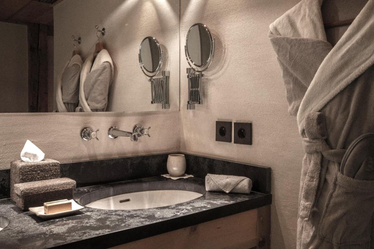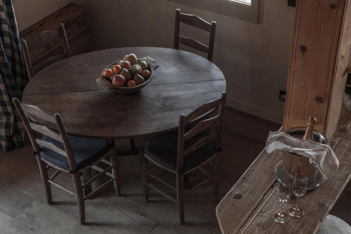 Das hauseigene Restaurant bietet ein Gourmet-Erlebnis basierend auf französischer Bergküche, mit starkem Akzent auf lokalen und biologischen Produkten. Der Speisesaal ist klein und gemütlich, um eine intime Atmosphäre zu gewährleisten. Auf Anfrage stehen die Köche für private Abendessen in den Chalets zur Verfügung.