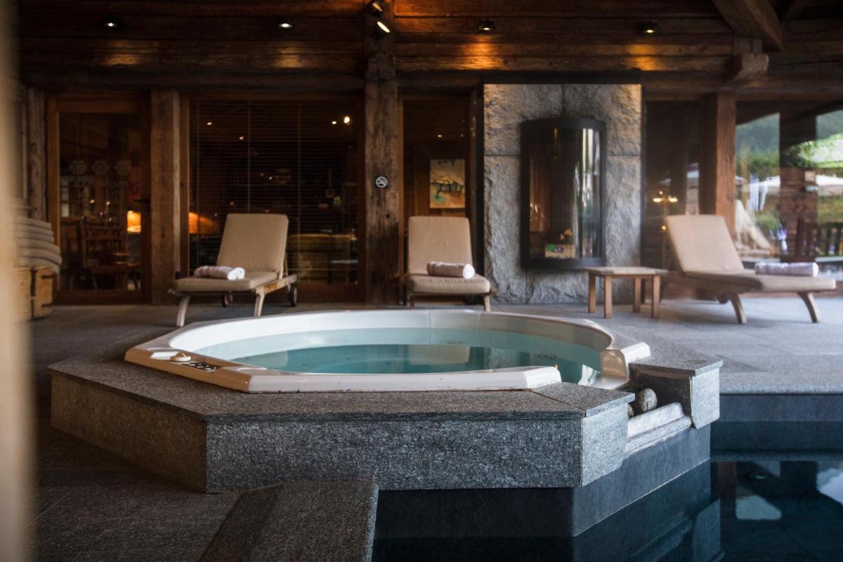 Das Le Hameau Spa bietet eine Oase der Ruhe, mit einem beheizten Außenpool, der direkt auf den Mont Blanc blickt, sowie einem Innenpool, einem Hamam und einer breiten Palette von Behandlungen. Es ist der perfekte Ort für totale Entspannung, eingebettet in die Majestät der alpinen Landschaft.