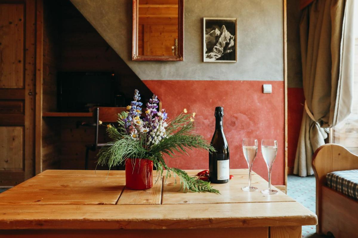 Das Innendesign ist modern, gekennzeichnet durch ein Gleichgewicht zwischen alpiner Authentizität (Holz und Stein) und klaren, zeitgenössischen Linien. Die Zimmer sind gemütlich und gut ausgestattet, um Sportlern maximale Erholung zu bieten. Viele bieten einen direkten Blick auf die Gletscher und die umliegenden Wälder.