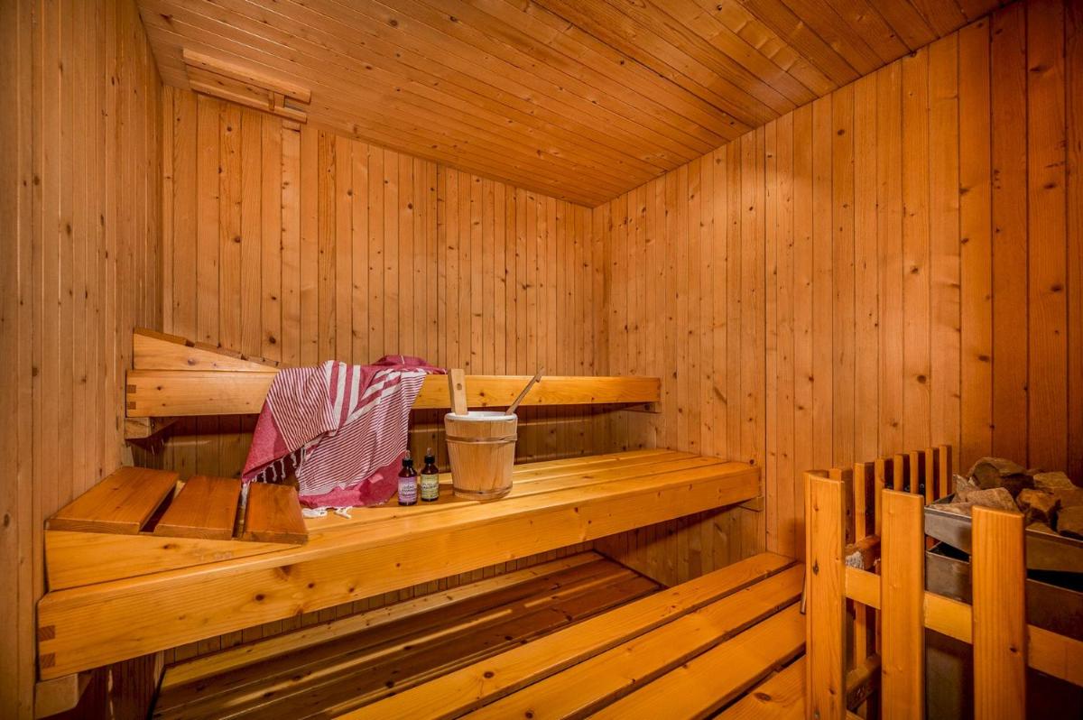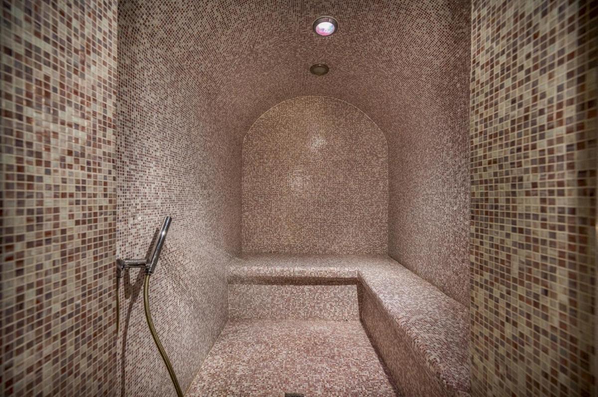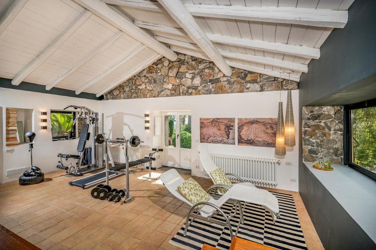 Der 12×7 m große Pool mit Salzwasser liegt im Garten und ist von Sonnenliegen, zwei Pergolen und einer Außenküche umgeben. Zur Wellness-Ausstattung zählen Sauna, türkisches Bad und Fitnessbereich.