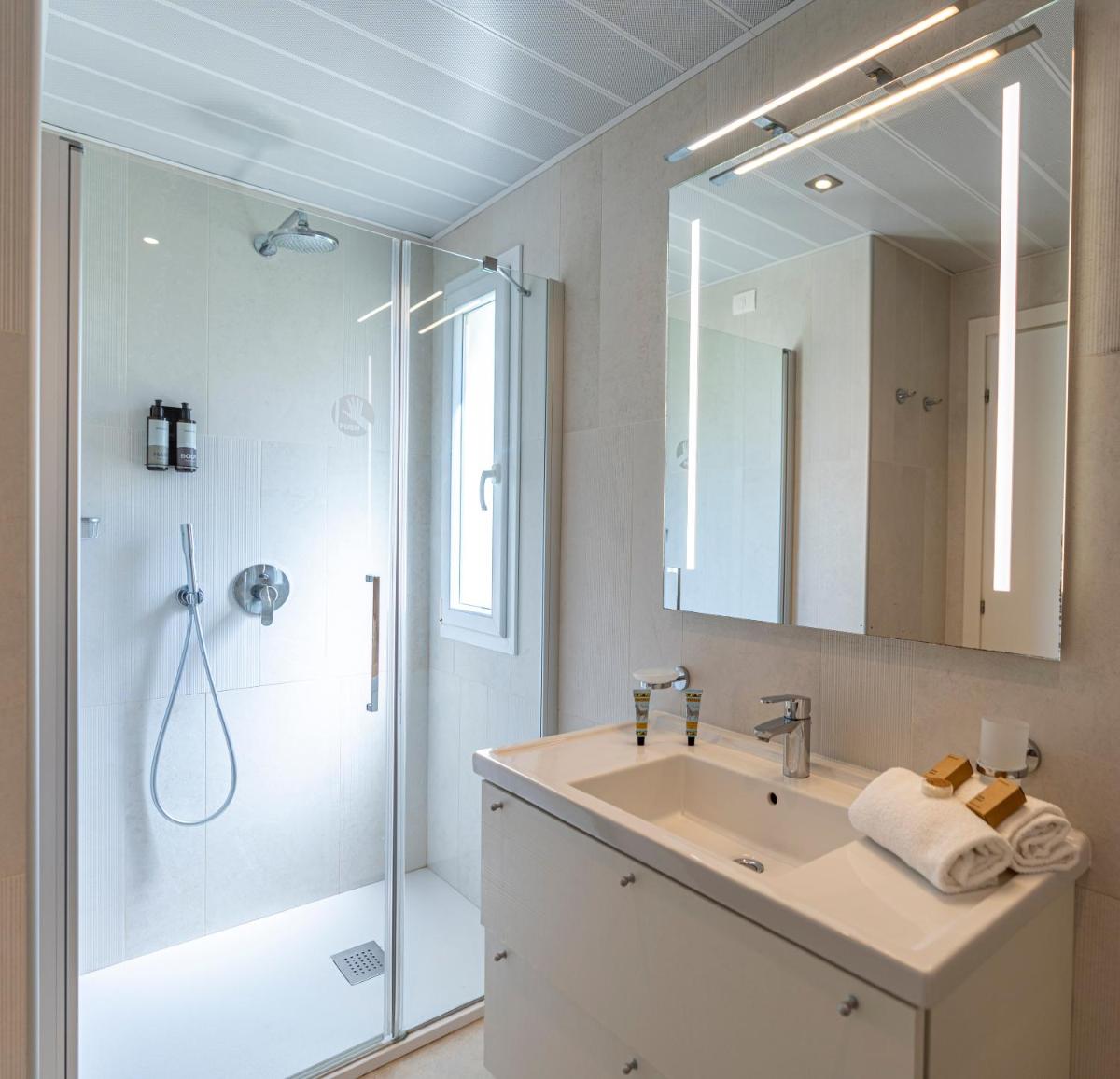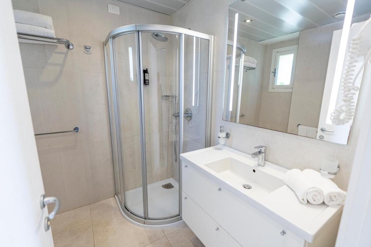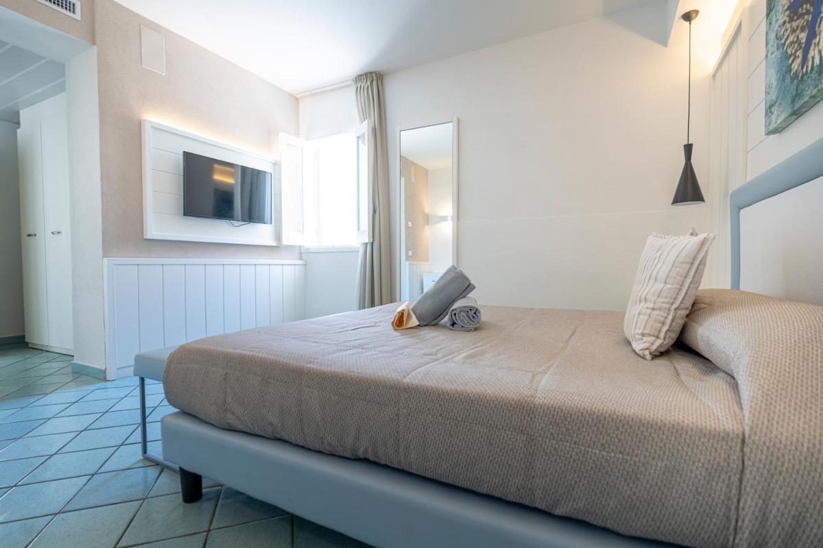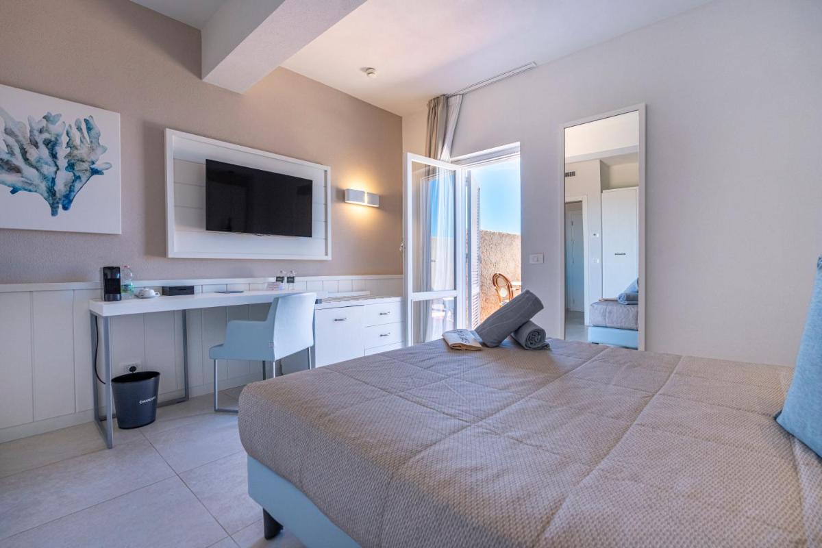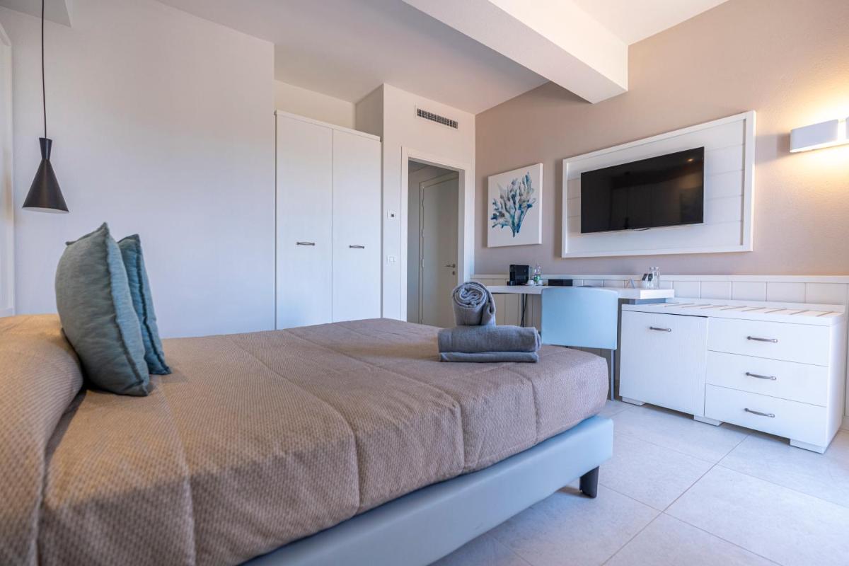 Helle Interieurs in Meeresfarben; viele Zimmer mit Balkonen oder Patios und offener Aussicht.