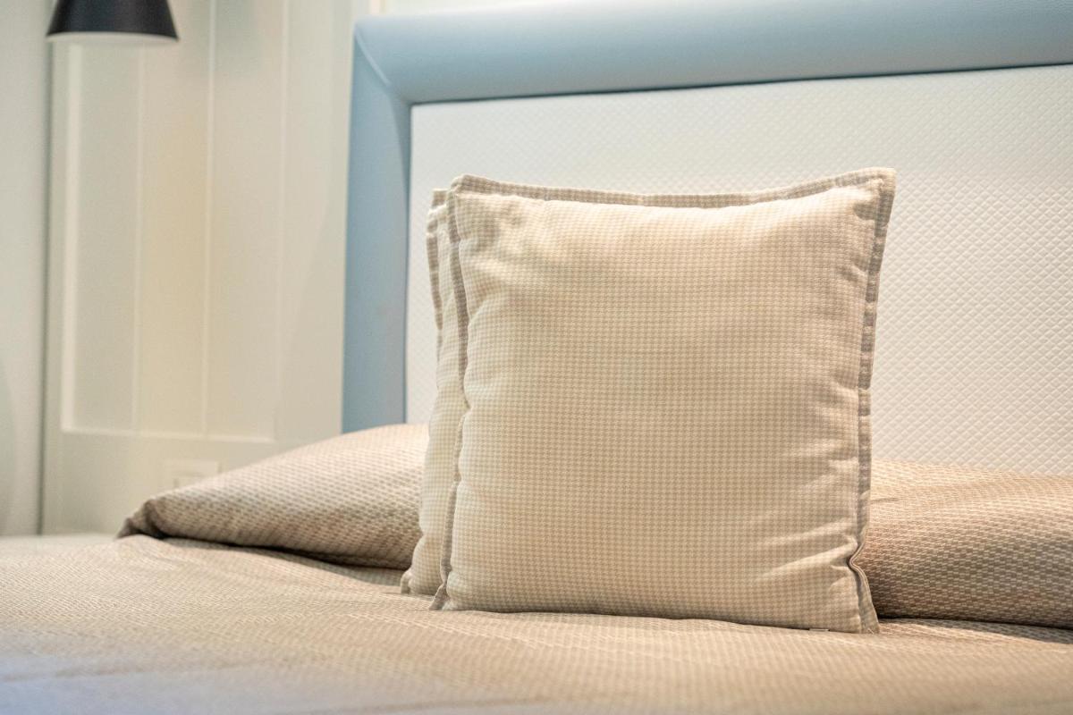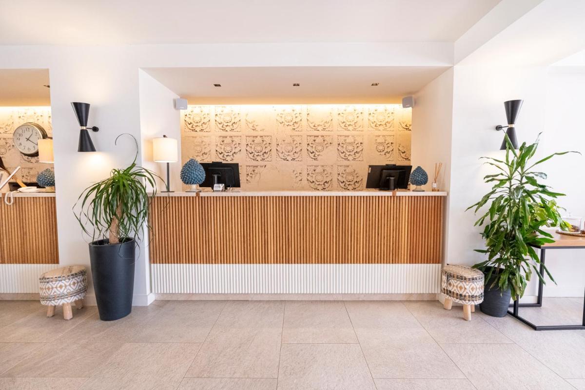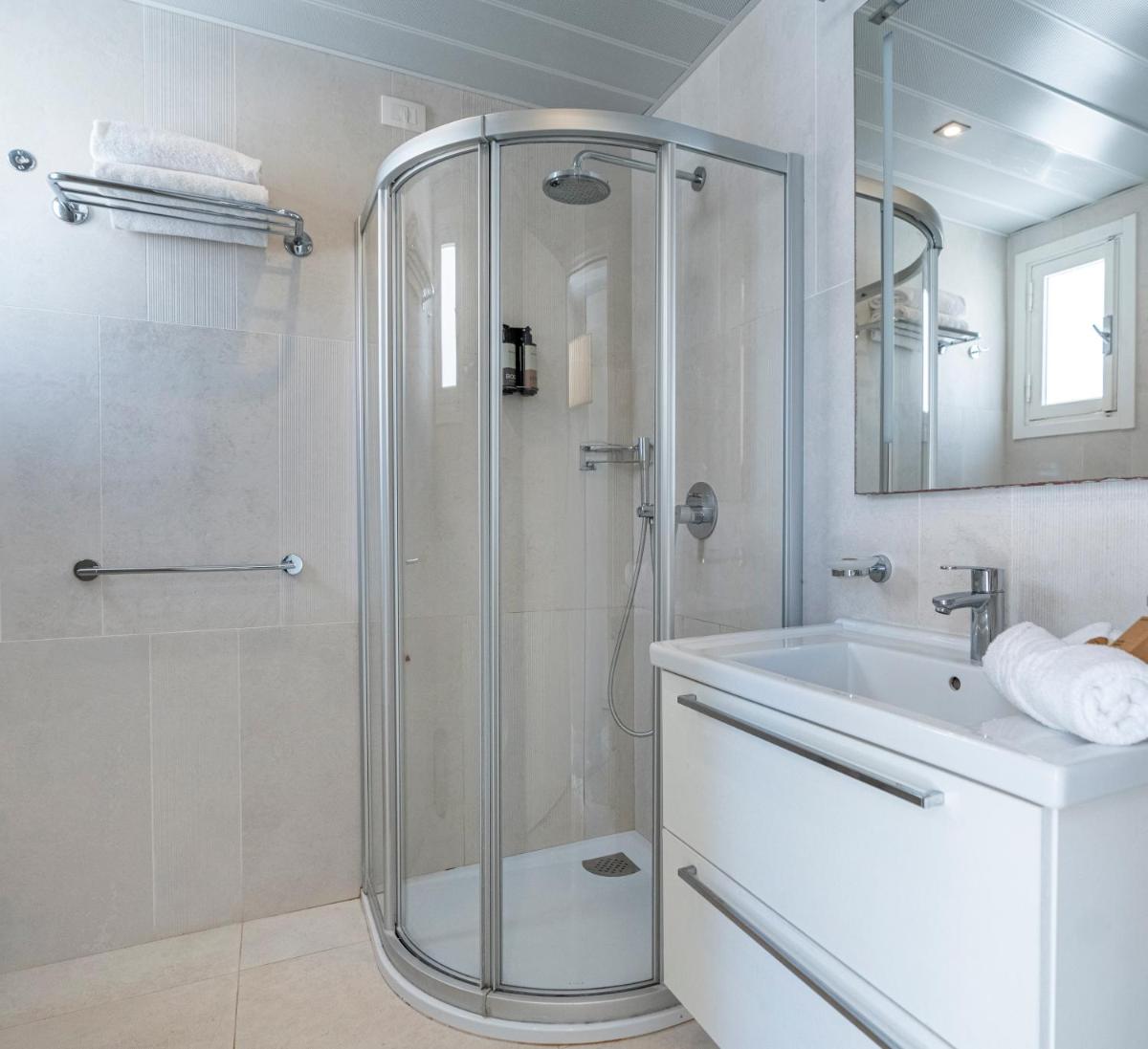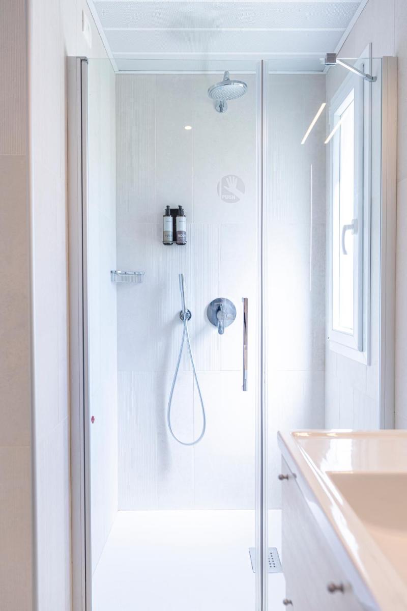 Helle Interieurs in Meeresfarben; viele Zimmer mit Balkonen oder Patios und offener Aussicht.