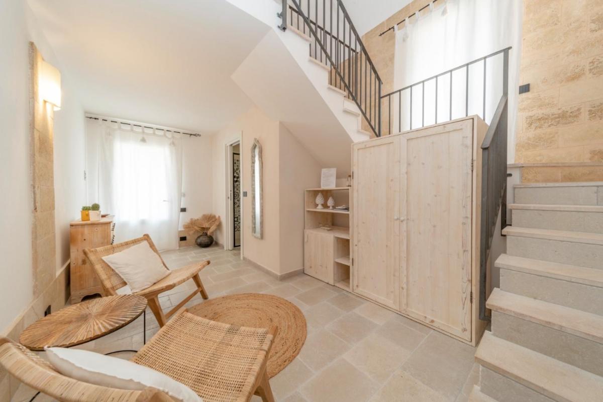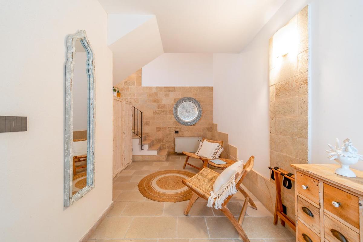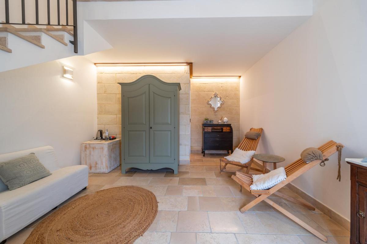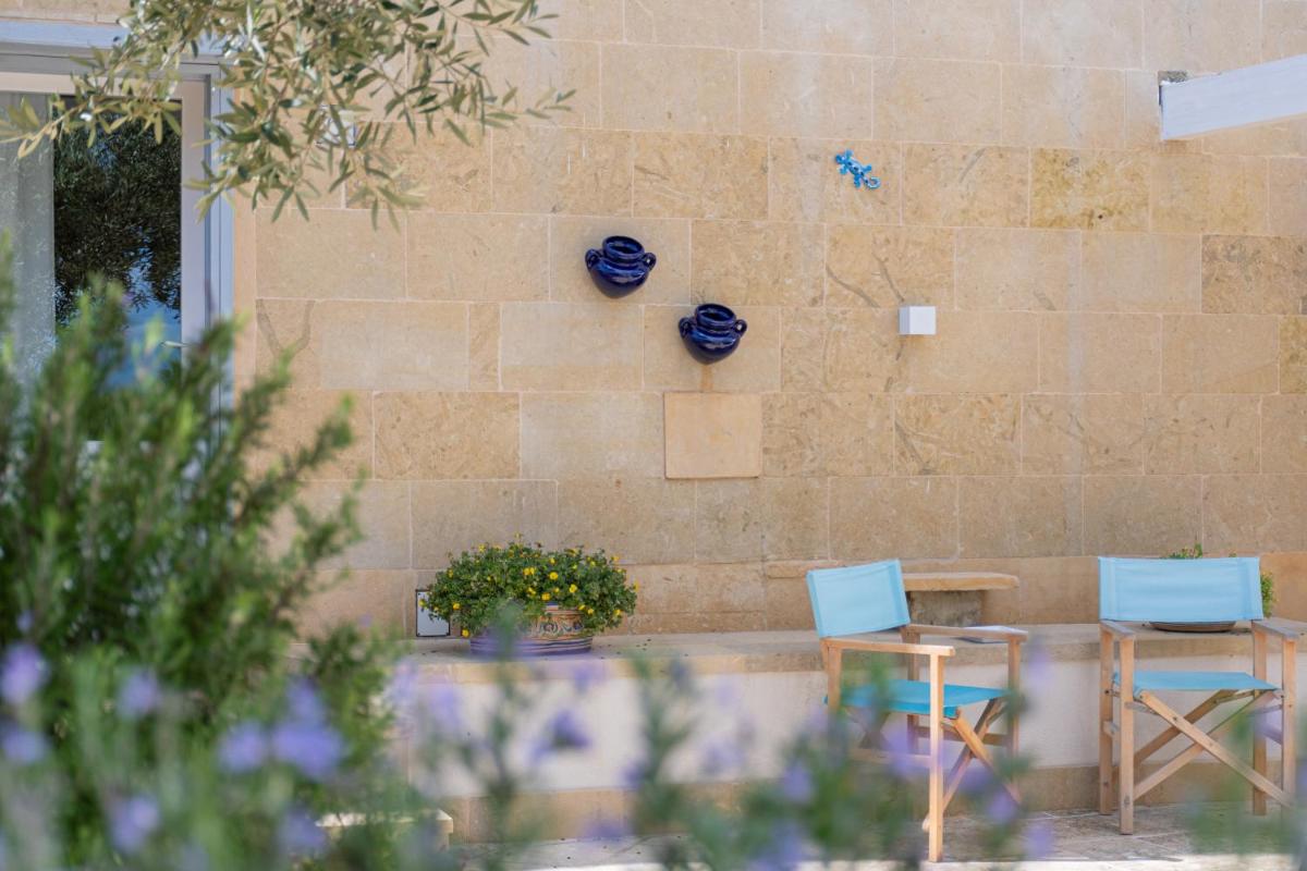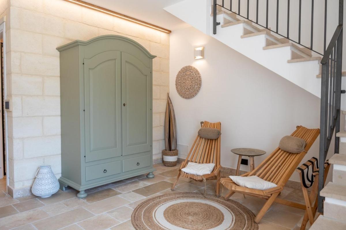 Die Unterkünfte zeichnen sich durch Tonnengewölbe, originale "Chianche"-Böden und eine Einrichtung aus, die Tradition mit modernem Design verbindet. Die Masseria bietet verschiedene Arten von Zimmern, Suiten und Apartments, alle ausgestattet mit Klimaanlage, kostenlosem WLAN, Minibar und privater Terrasse. Die Atmosphäre ist intim und romantisch, ideal für Paare und Familien.