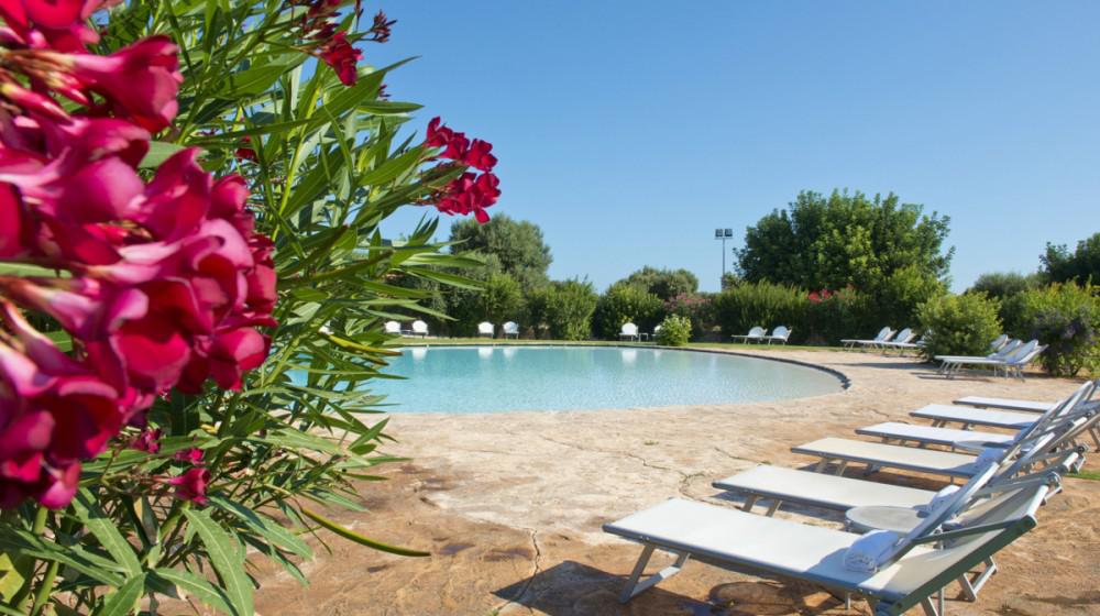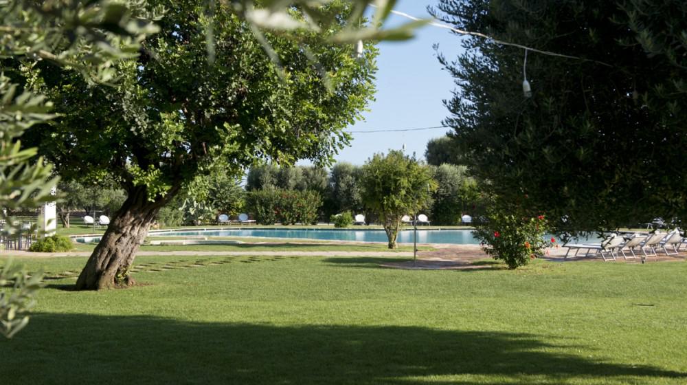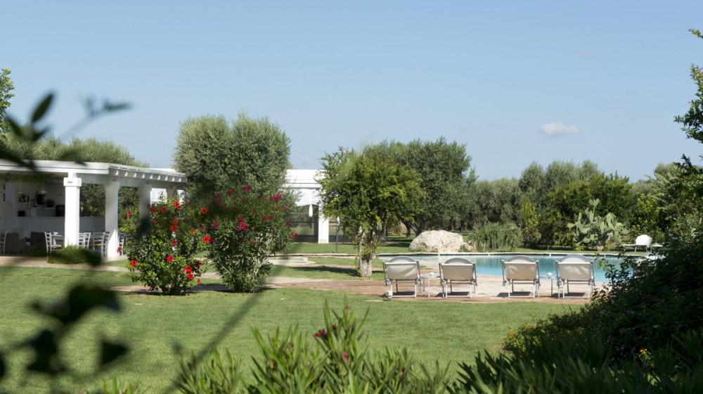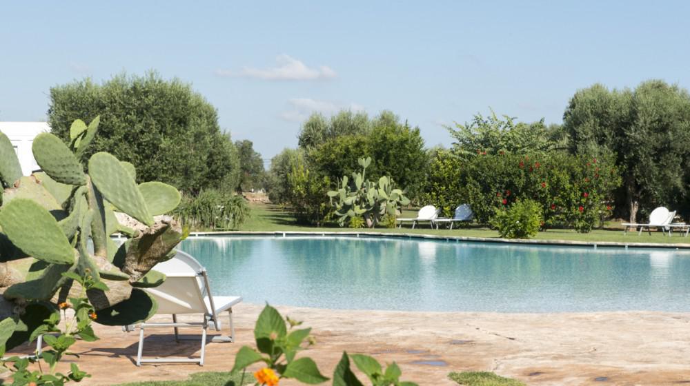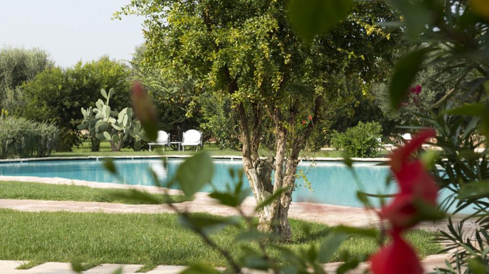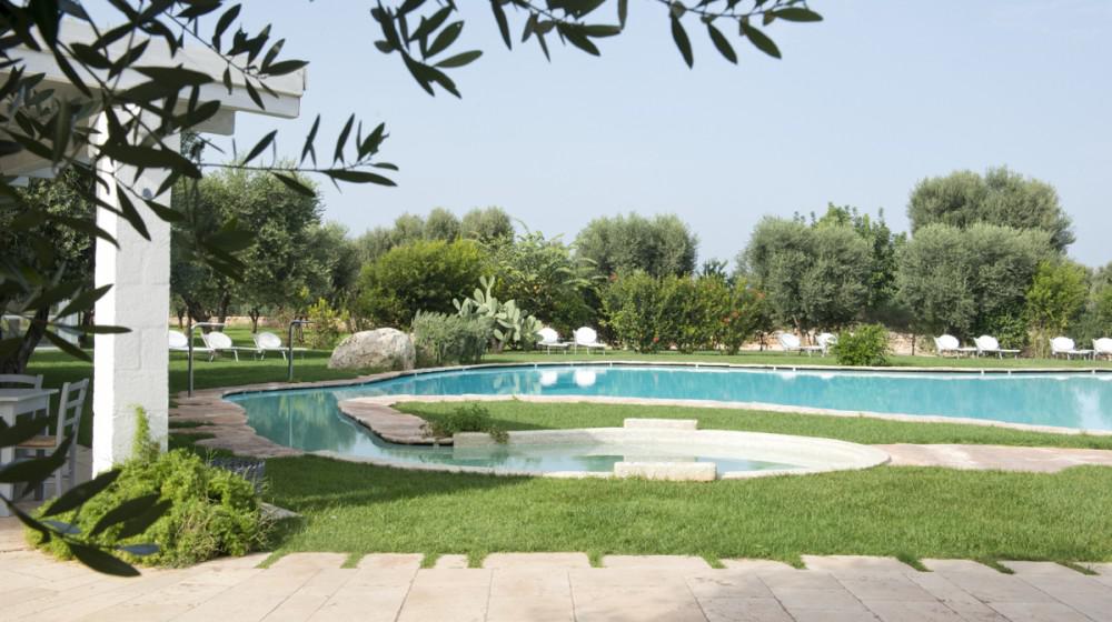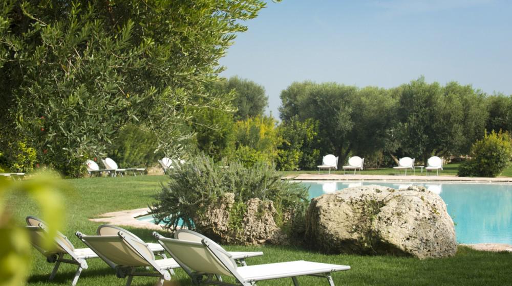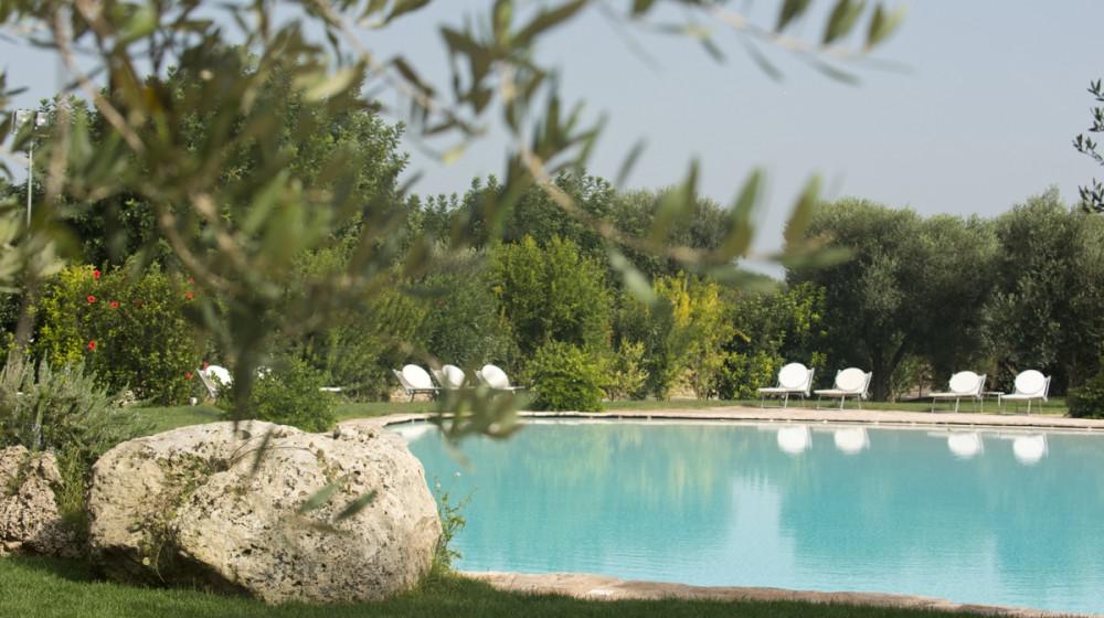 Der saisonale Außenpool ist von Olivenbäumen umgeben und mit Liegestühlen sowie einem Solariumbereich ausgestattet. Garten und Pfade laden zum Entspannen und Spazieren ein.