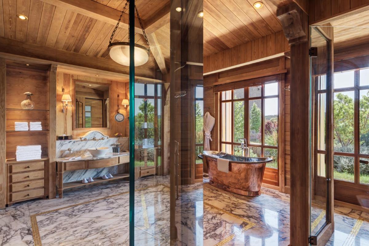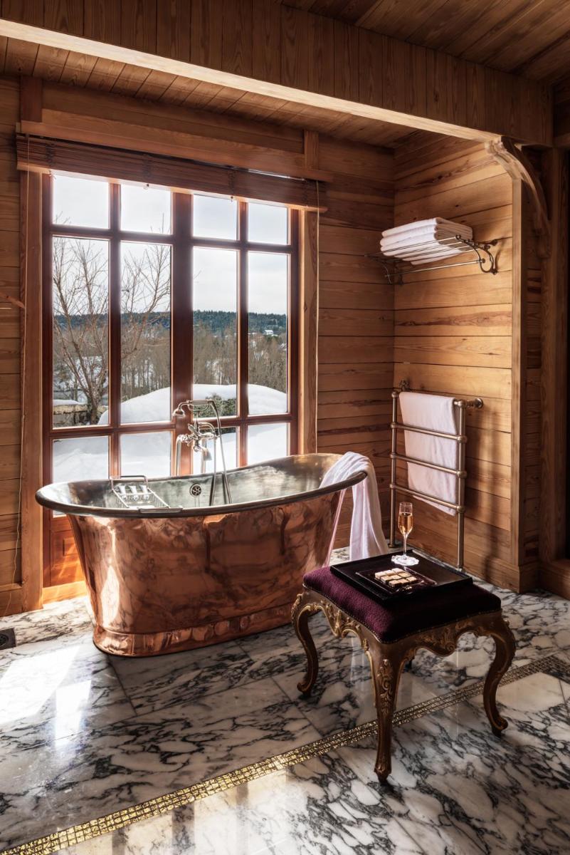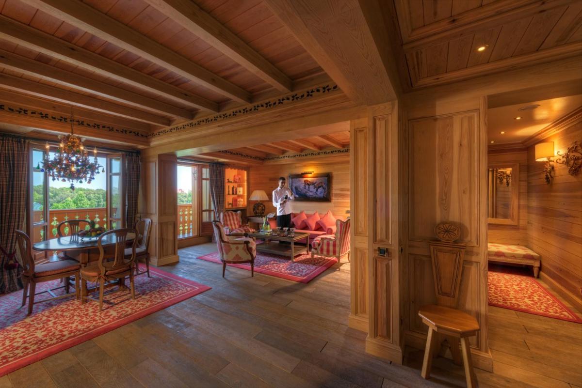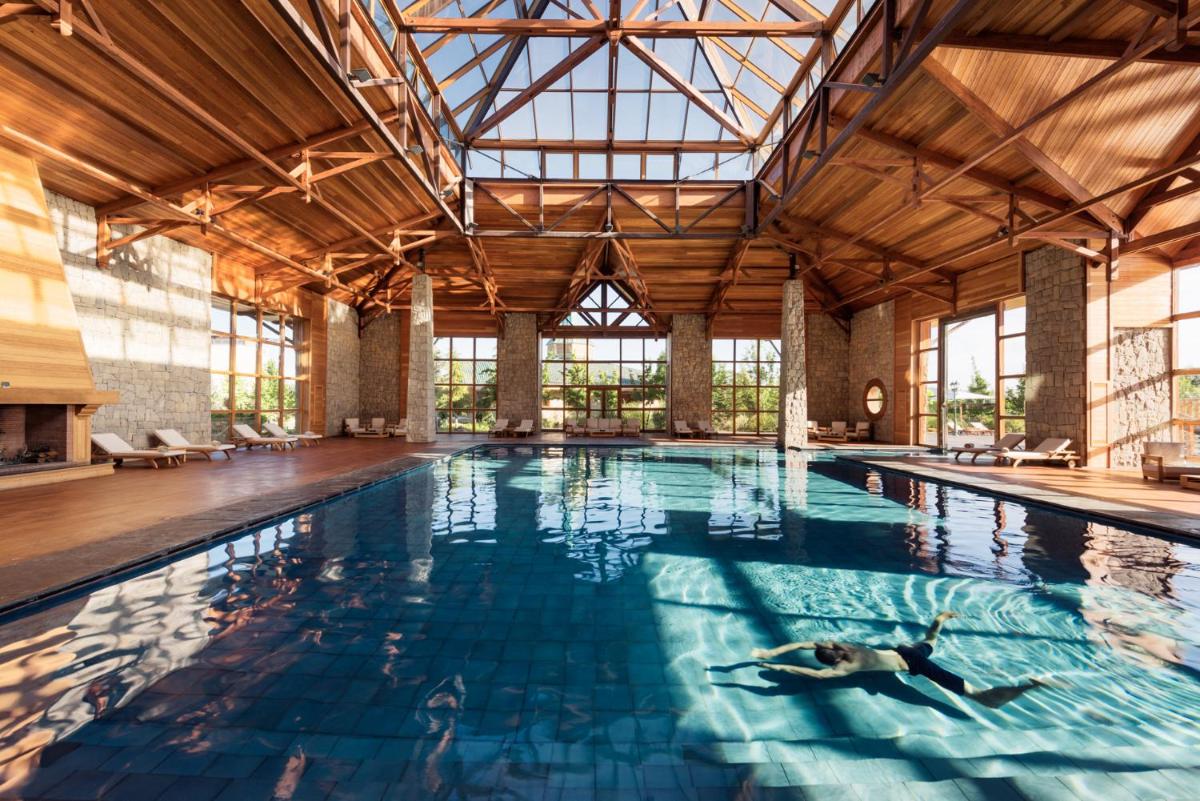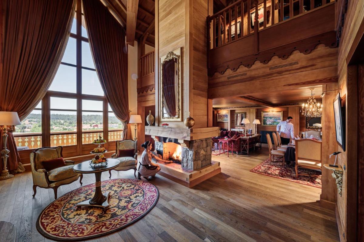 Das Resort zeichnet sich durch seine Architektur aus Stein und Holz aus, mit Innenräumen, die klassischen Luxus mit Bergkomfort verbinden. Die angezündeten Kamine, die reichen Stoffe und die prächtige Einrichtung schaffen eine warme und einladende Atmosphäre. Die Zimmer und Suiten bieten spektakuläre Ausblicke auf die umliegenden Wälder und die Landschaft.
