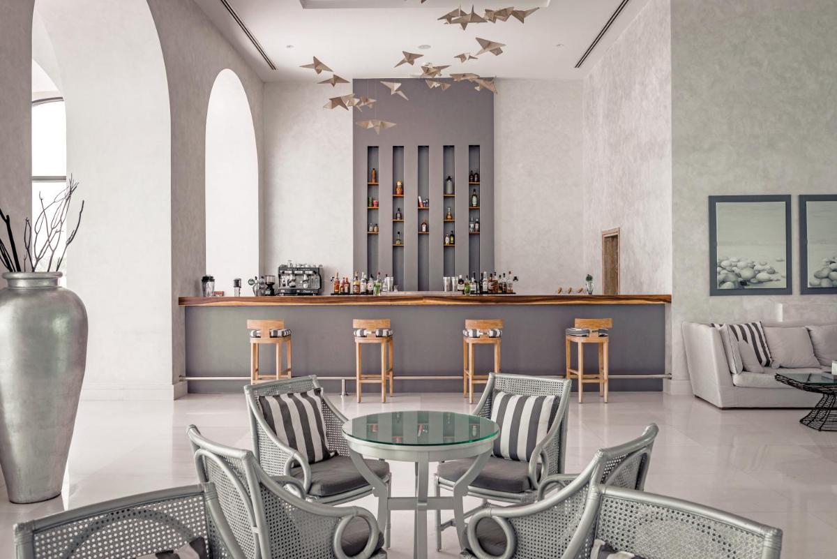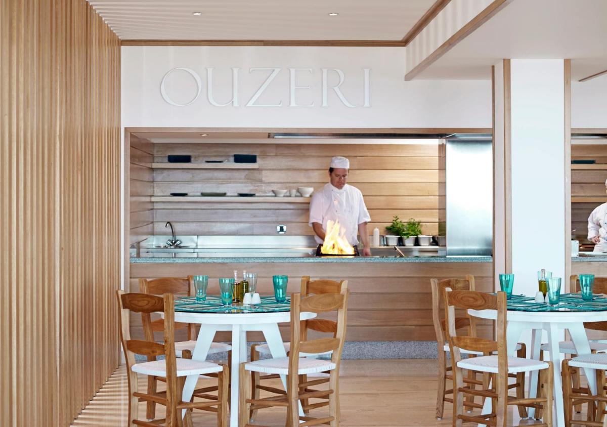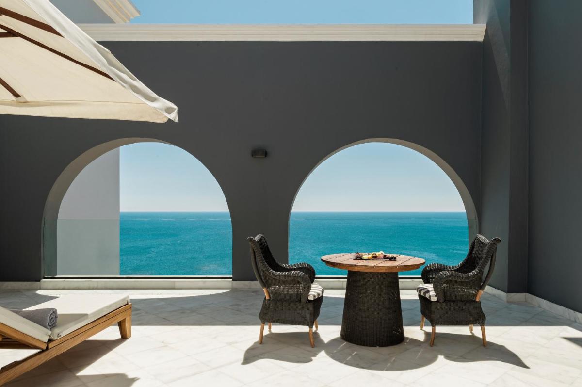Das Design des Mitsis Alila zeichnet sich durch offene Räume, hellen Marmor und eine zeitgenössische Ästhetik aus, die den Meerblick optimal nutzt. Das Resort verfügt über einen spektakulären Haupt-Infinity-Pool (Unendlichkeitsbecken) und einen separaten Kinderpool. Die Zimmer und Suiten sind luxuriös eingerichtet, viele mit Whirlpools oder privaten Pools, was einen Aufenthalt purer Entspannung garantiert.