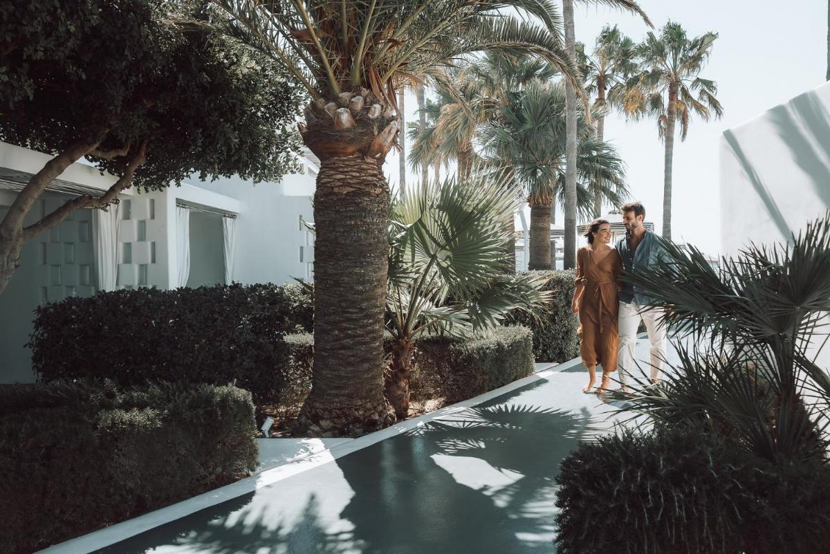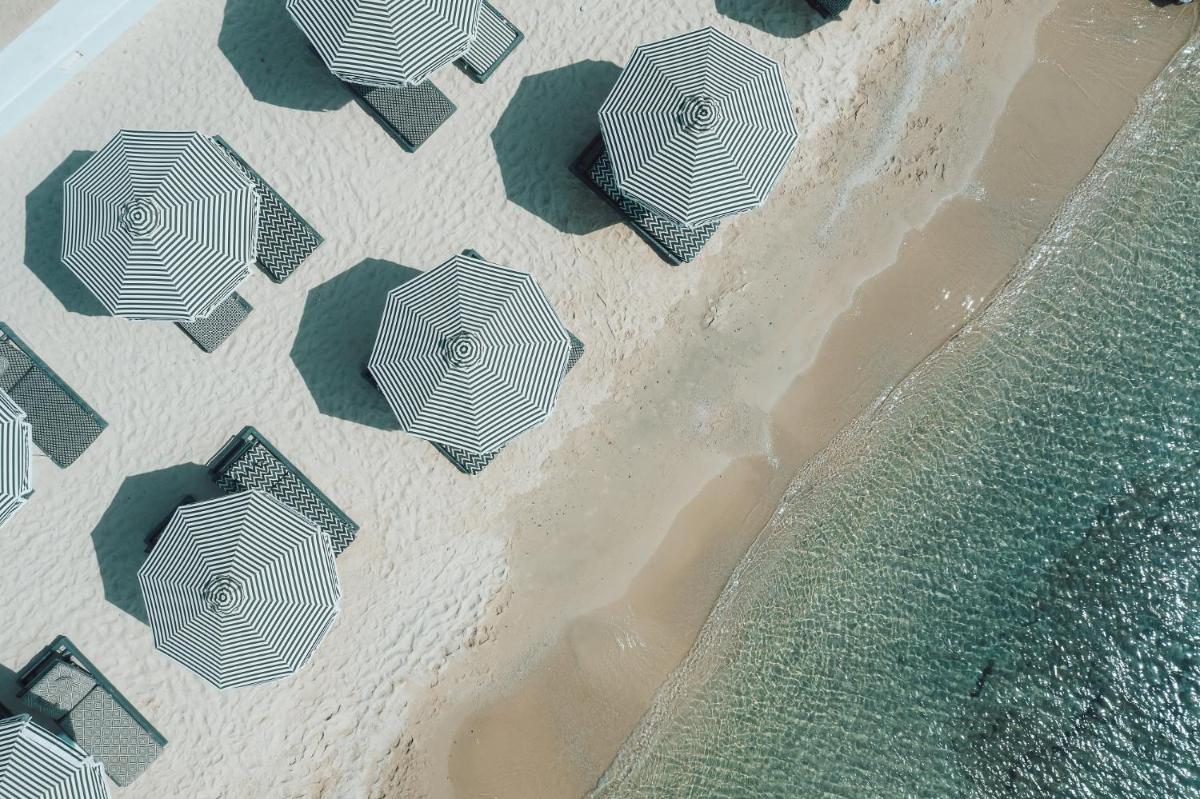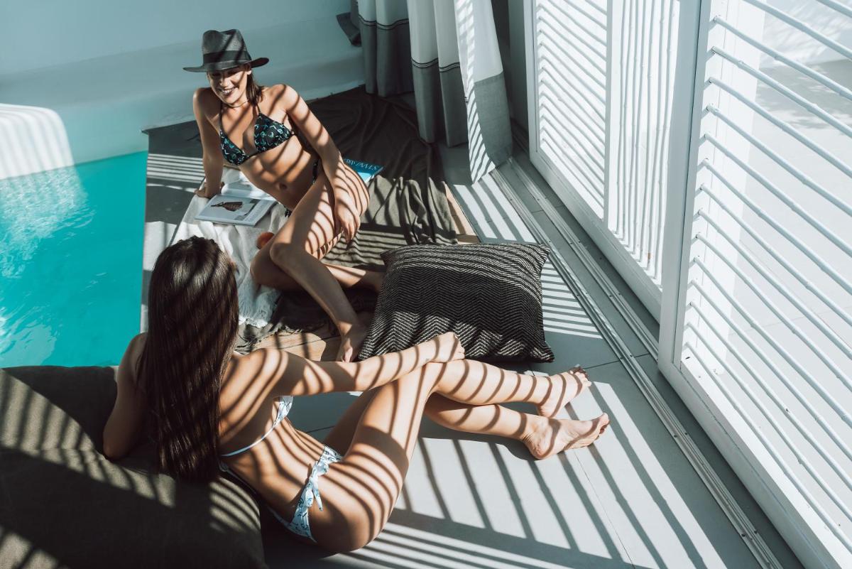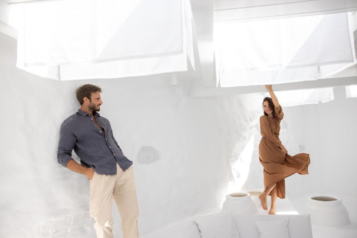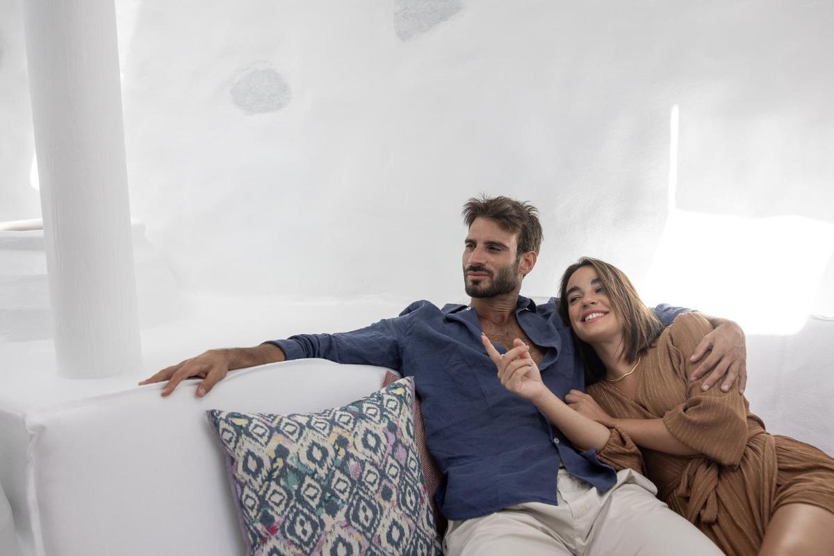 Das Hotel zeichnet sich durch die vorherrschende Verwendung von reinem Weiß aus, das das strahlende griechische Sonnenlicht reflektiert und eine friedliche und entspannende Atmosphäre schafft. Die Zimmer und Suiten, viele mit direktem Poolzugang oder Meerblick, sind mit Designermöbeln, edlen Stoffen und ausgewählten Kunstwerken eingerichtet, was höchsten Komfort gewährleistet.