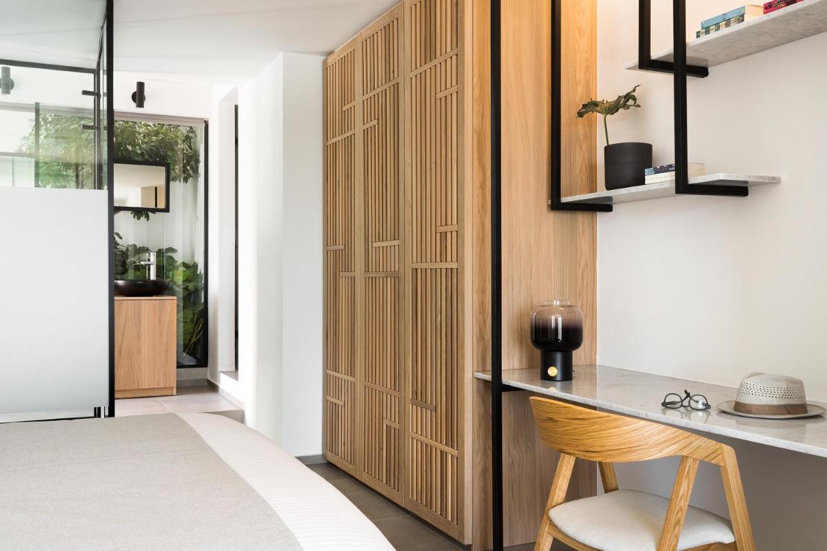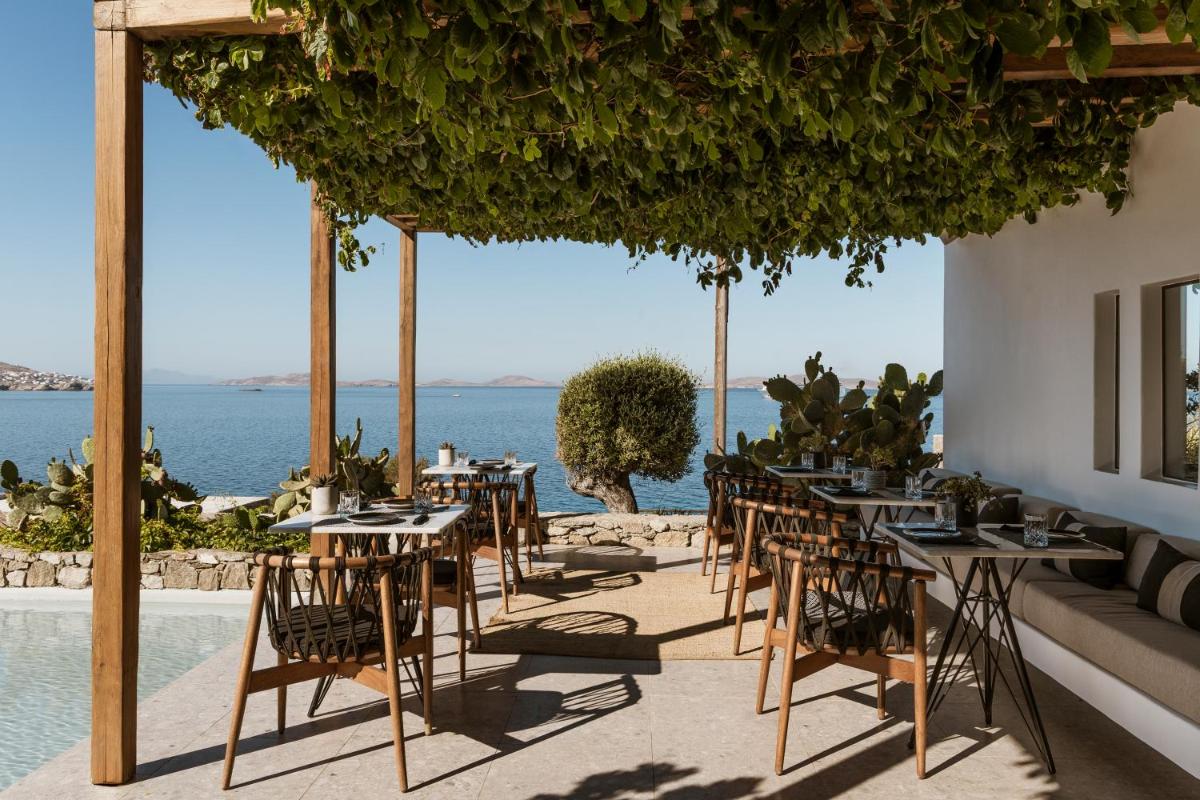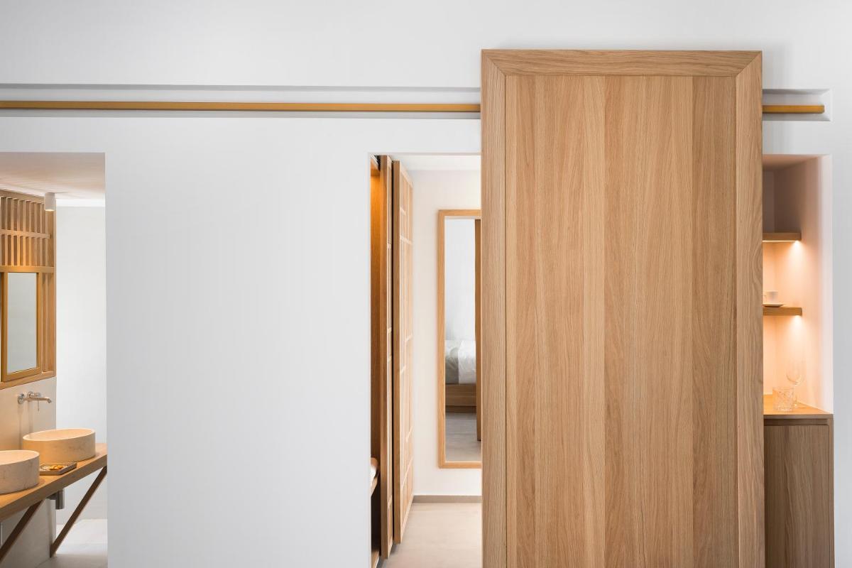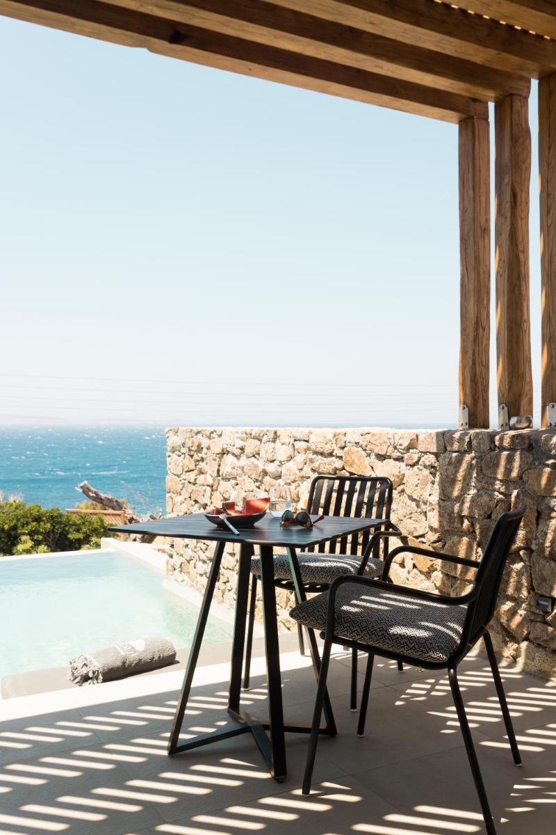 Jede Suite wurde sorgfältig entworfen, um Komfort und visuelles Erlebnis zu maximieren. Die sehr geräumigen Unterkünfte sind mit hochwertigen Möbeln ausgestattet, aber das wahre Highlight sind die privaten Außenbereiche, von denen viele einen privaten Infinity-Pool oder einen Jacuzzi umfassen, perfekt, um den berühmten Sonnenuntergang von Mykonos in Abgeschiedenheit zu genießen.