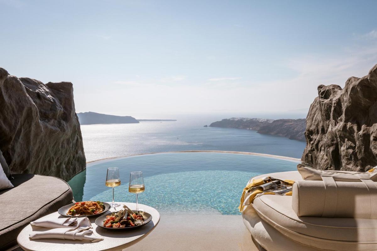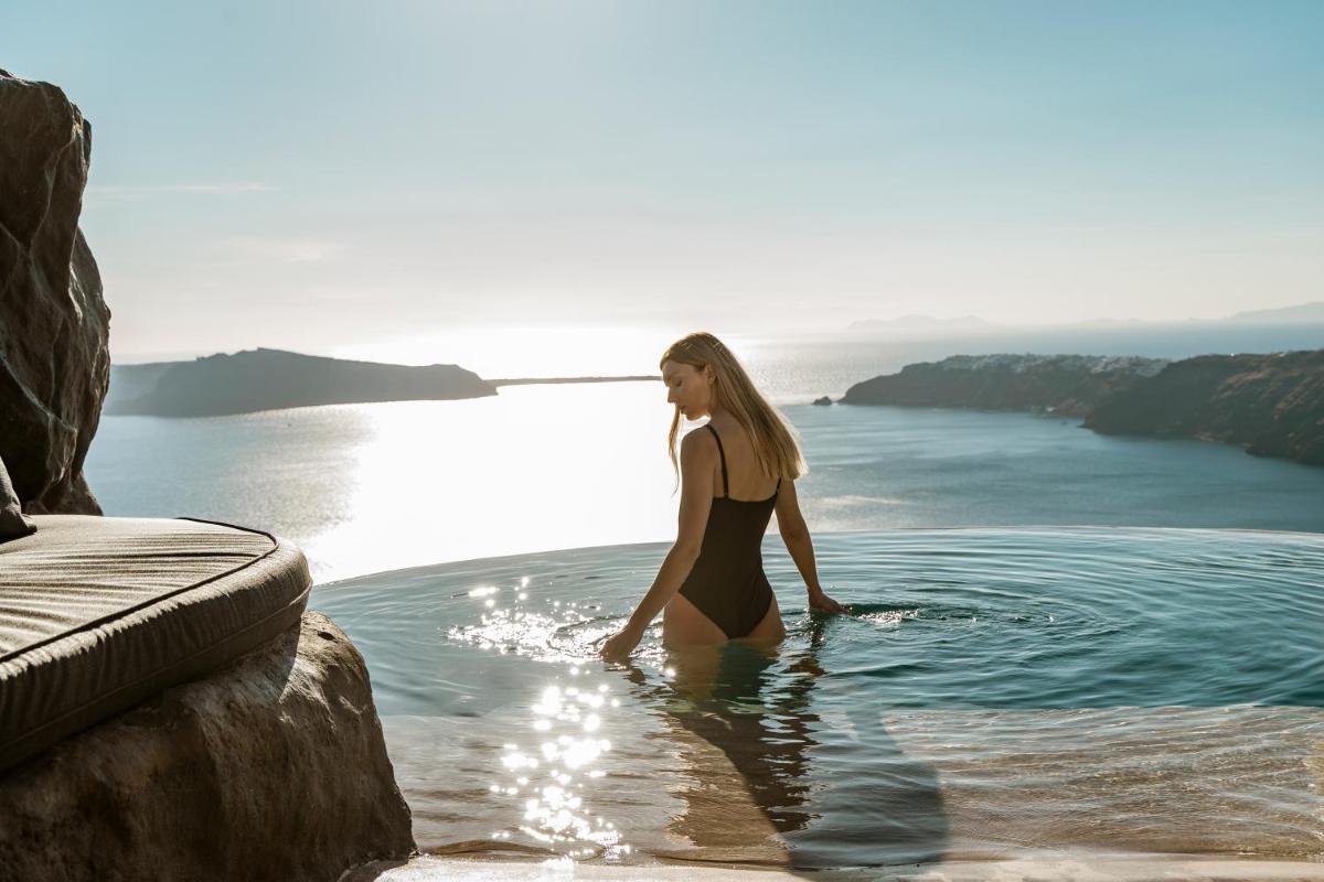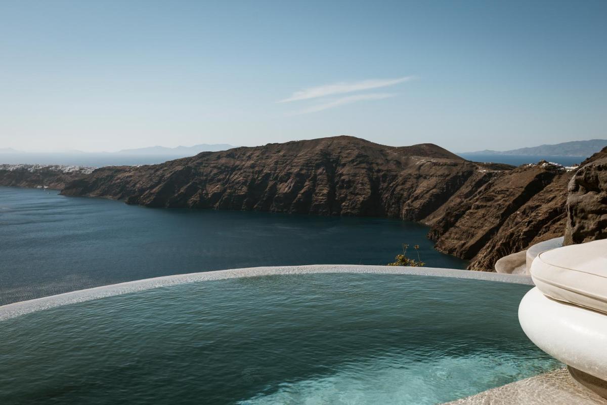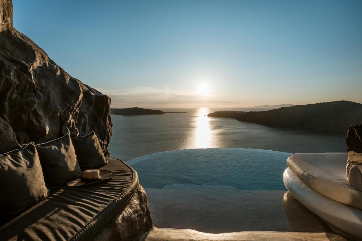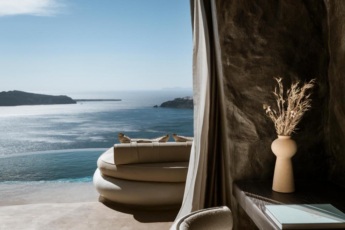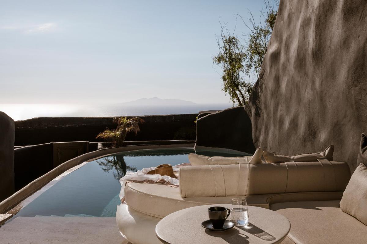 Die Suiten bieten private Höhlenpools, große Panoramafenster mit Blick auf die Caldera, Naturstein-Details, organische Materialien, hochwertige Betten, Regenduschen und großzügige Räume für maximale Privatsphäre.