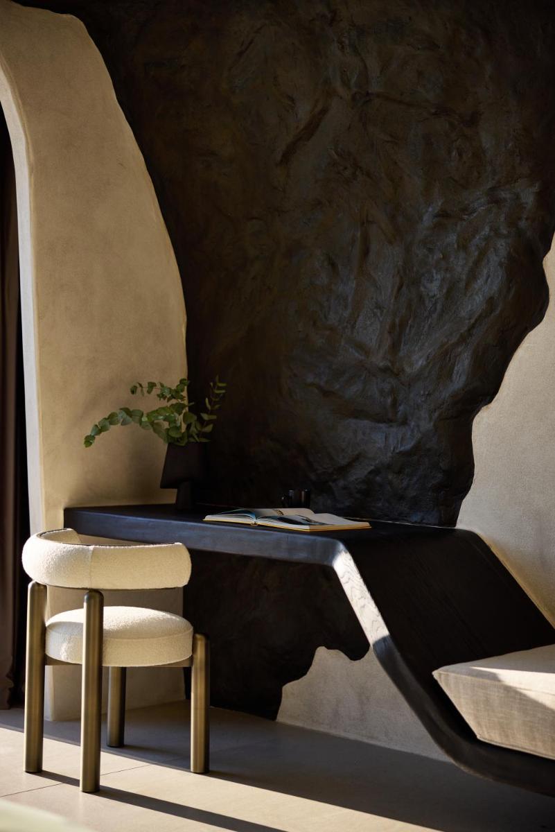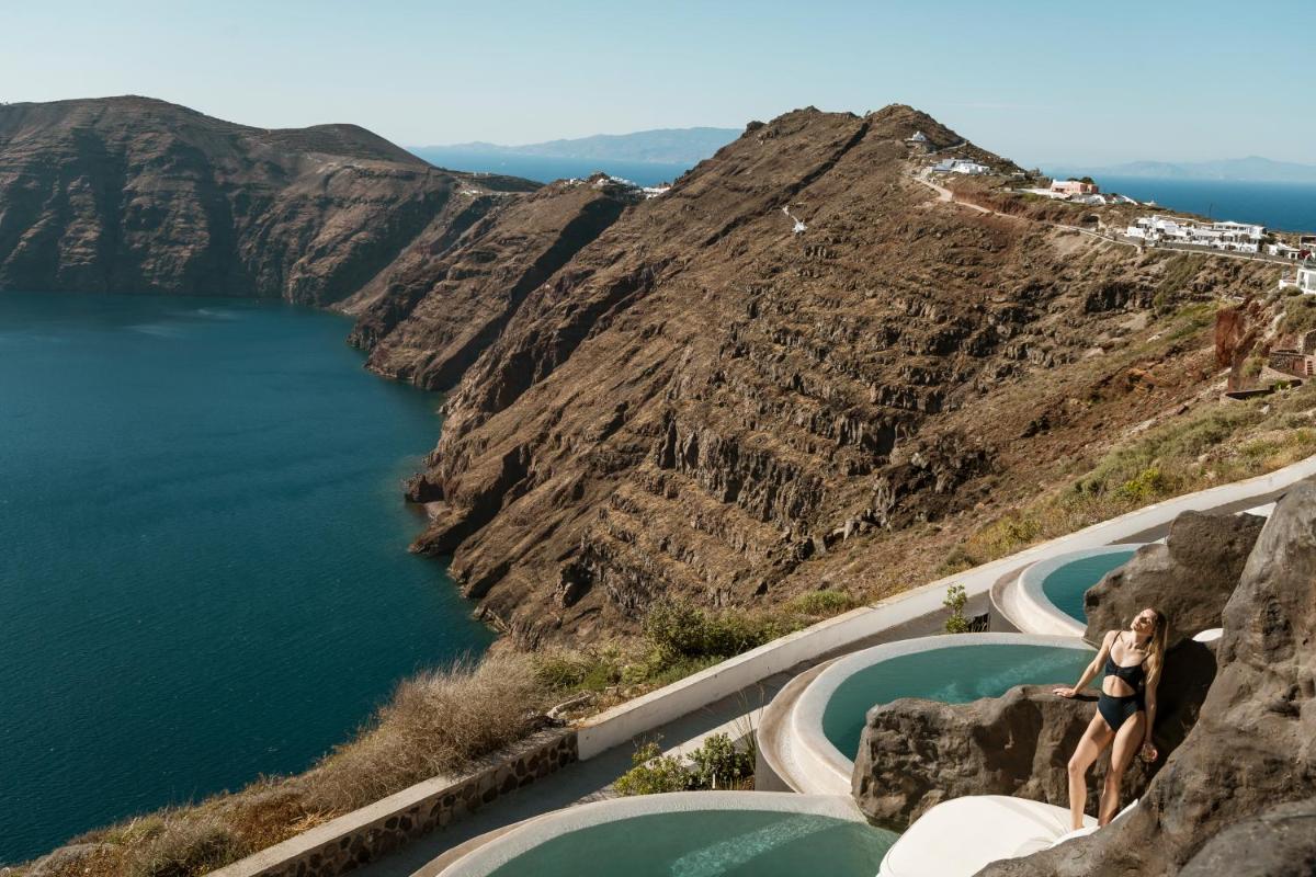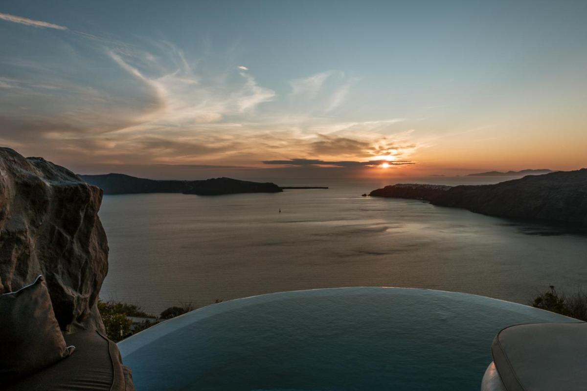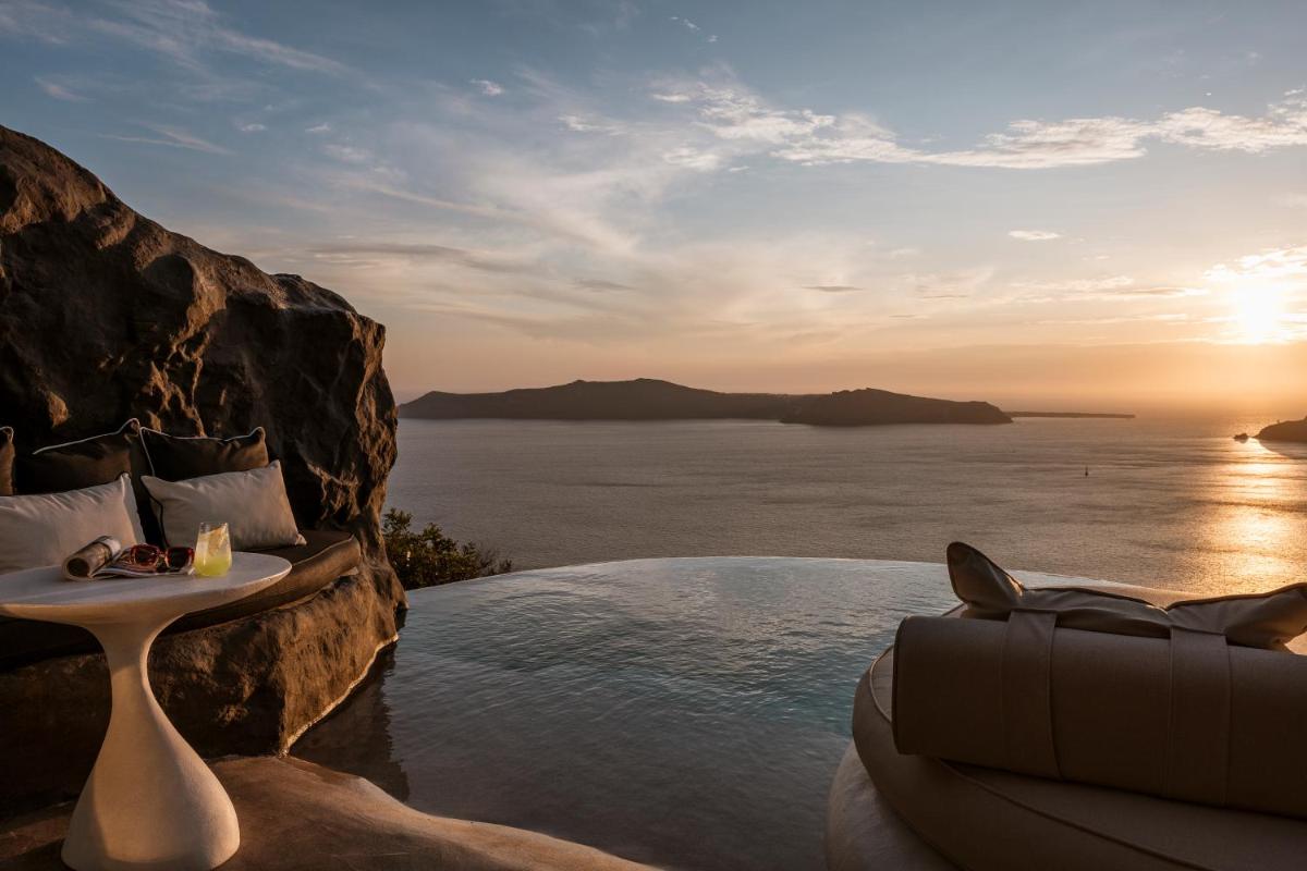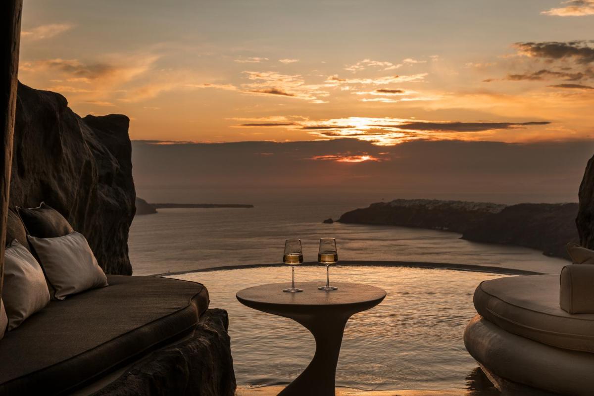 Die Suiten bieten private Höhlenpools, große Panoramafenster mit Blick auf die Caldera, Naturstein-Details, organische Materialien, hochwertige Betten, Regenduschen und großzügige Räume für maximale Privatsphäre.