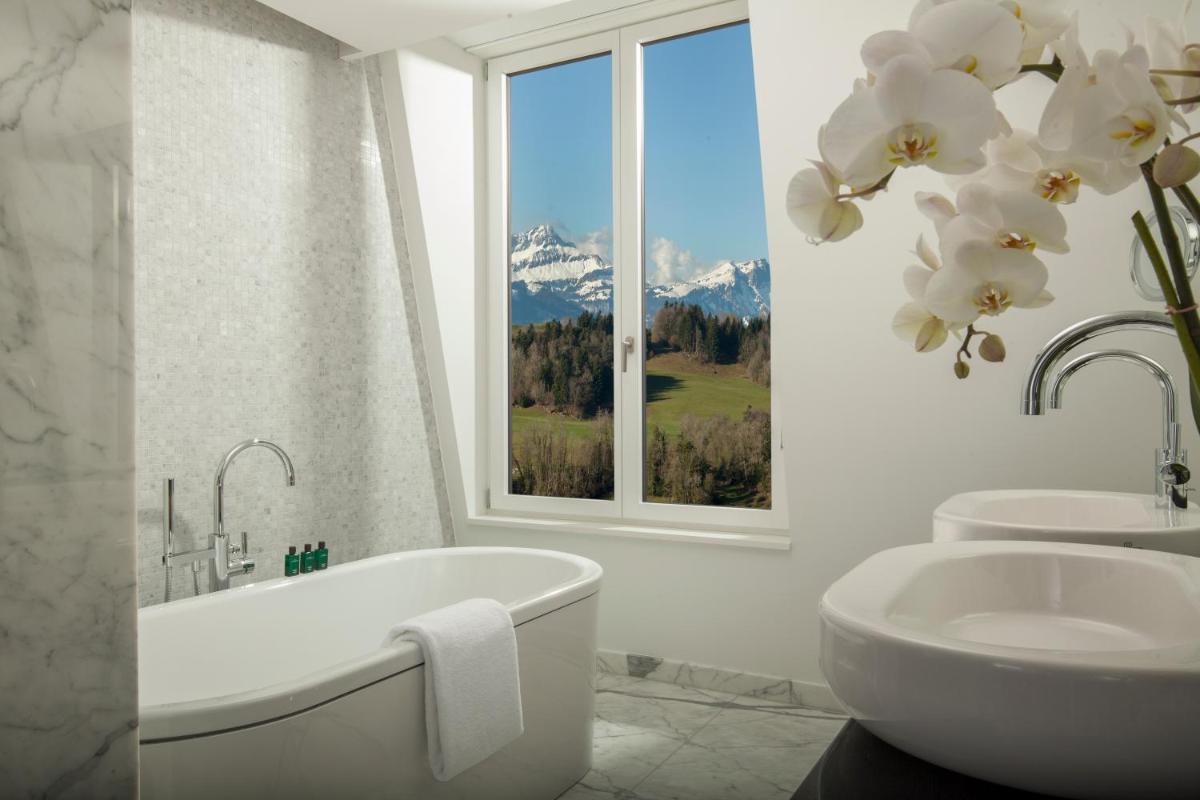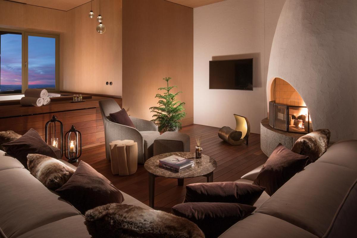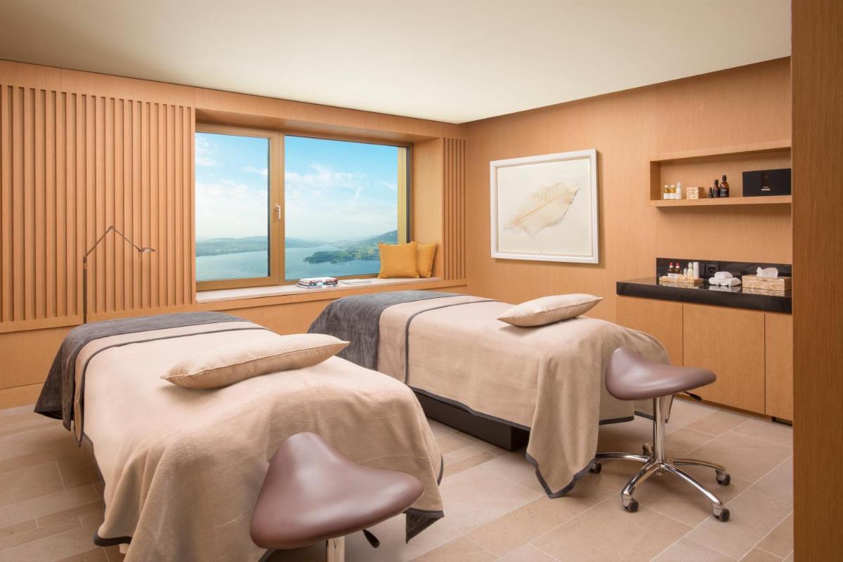 Gäste des Palace Hotels haben vollen Zugang zum ikonischen Bürgenstock Alpine Spa, einem der spektakulärsten Spas Europas. Dazu gehört ein Außen-Infinity-Pool mit direktem Blick auf den See sowie Saunen, Dampfbäder und Ruheräume, die ein umfassendes Wellness-Erlebnis versprechen.